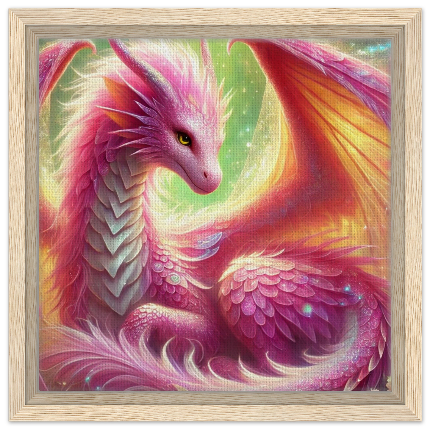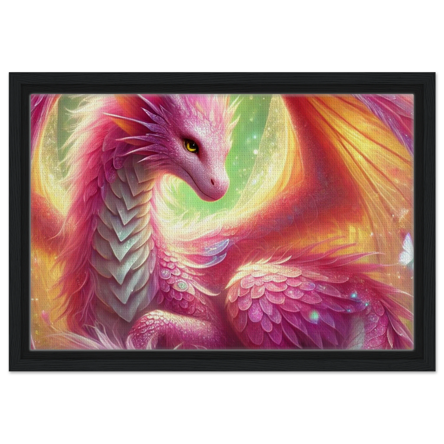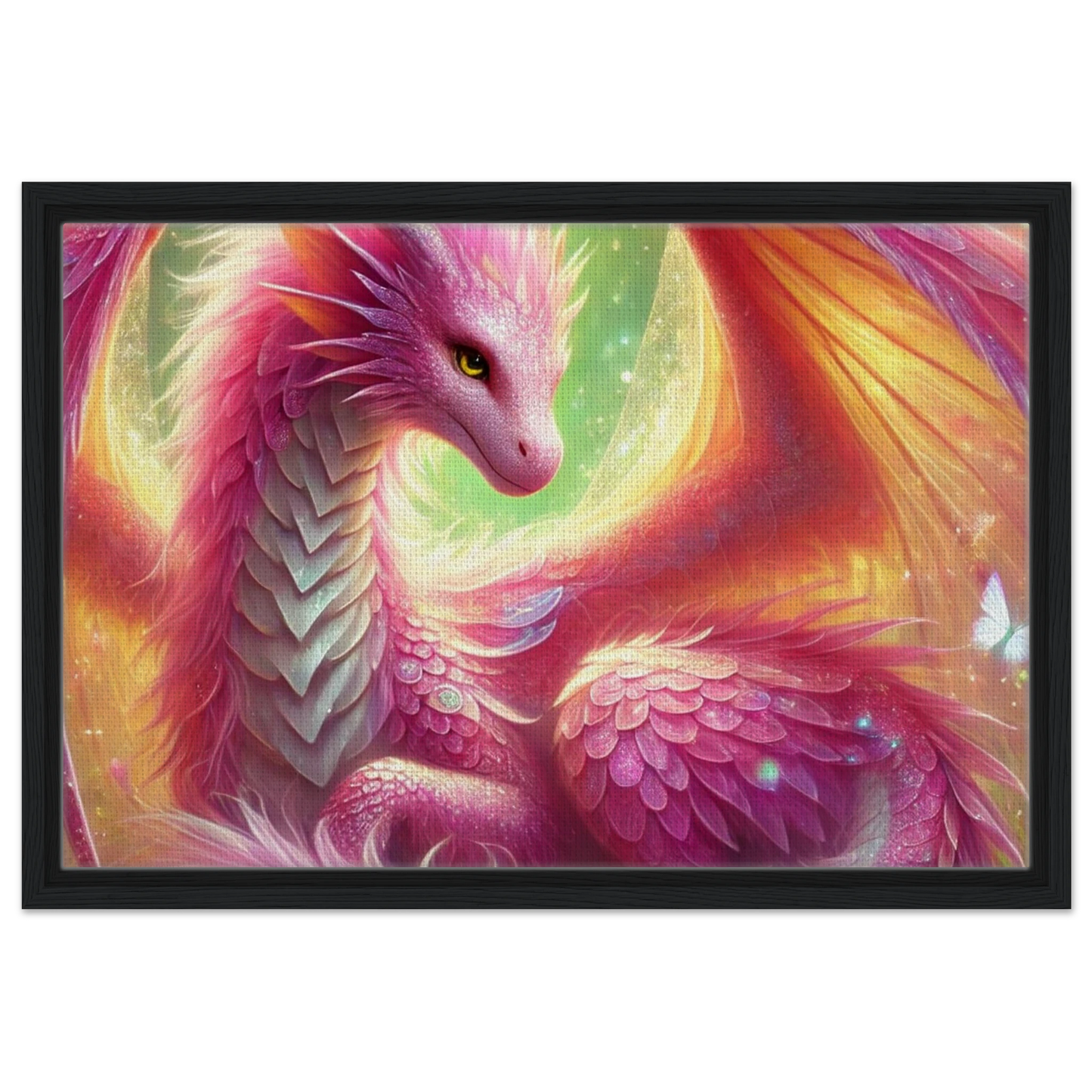 Tauche ein in eine Welt voller Leichtigkeit, Blüten und Magie – mit der leuchtenden Präsenz von Auravelle, der Blütendrache des Lichts. Ihre roséfarbenen Schuppen, von Schmetterlingen umgeben, verschmelzen mit der strukturierten Oberfläche der Leinwand zu einem lebendigen Kunstwerk. Der hochwertige Rahmen verleiht dem Motiv zusätzlich Eleganz – ideal für traumverliebte Herzen und magische Räume.