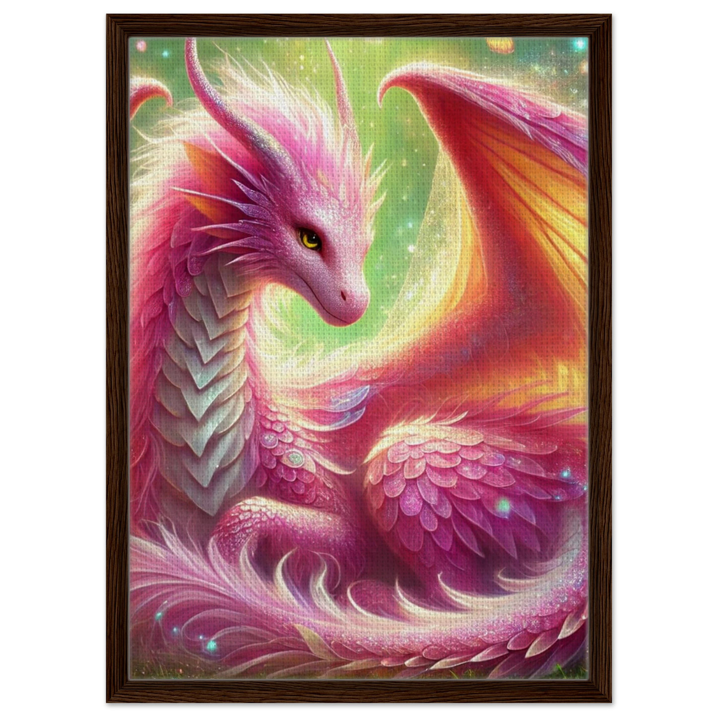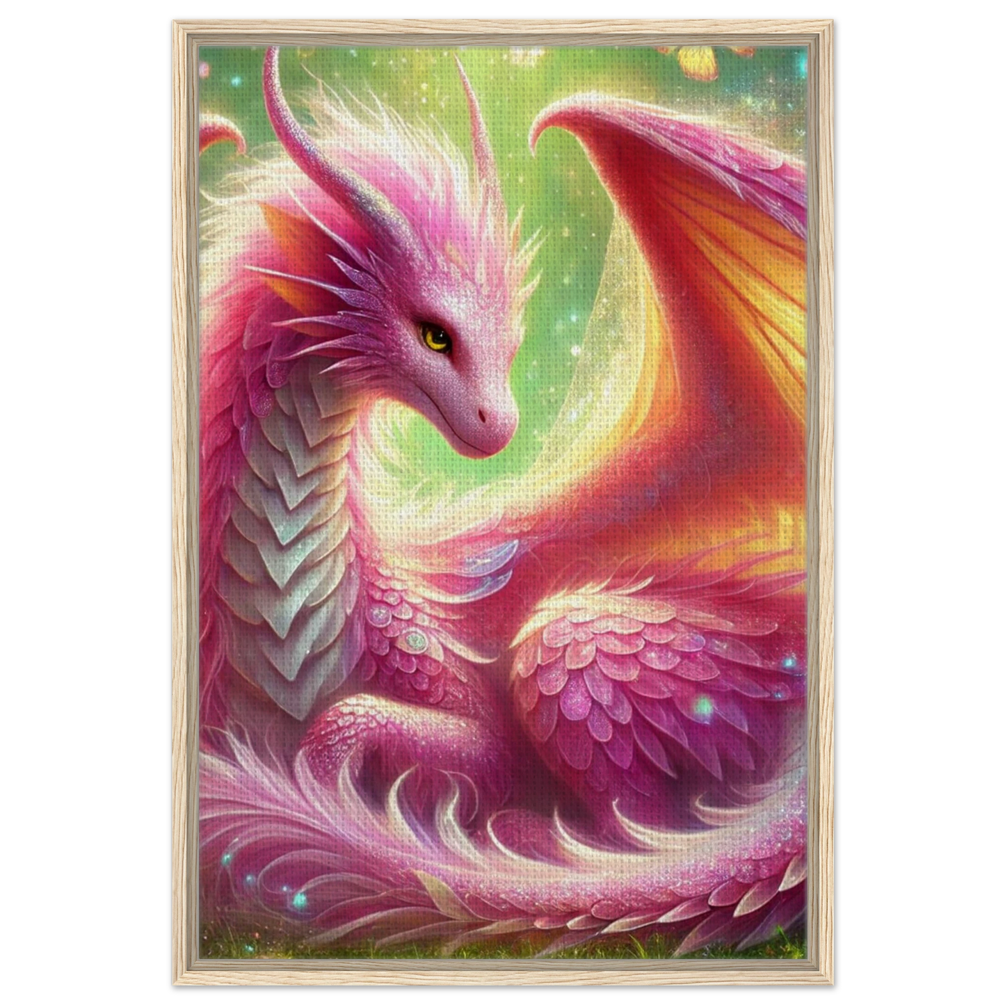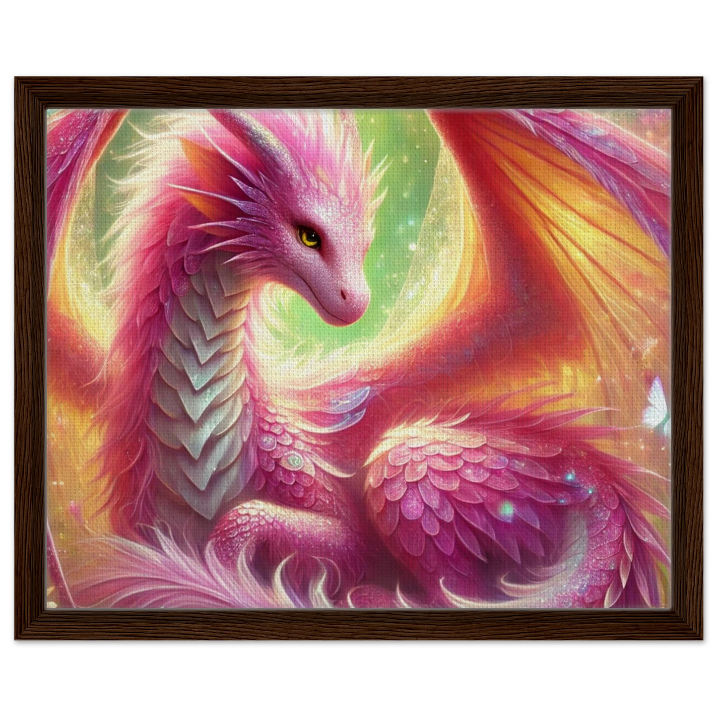 Tauche ein in eine Welt voller Leichtigkeit, Blüten und Magie – mit der leuchtenden Präsenz von Auravelle, der Blütendrache des Lichts. Ihre roséfarbenen Schuppen, von Schmetterlingen umgeben, verschmelzen mit der strukturierten Oberfläche der Leinwand zu einem lebendigen Kunstwerk. Der hochwertige Rahmen verleiht dem Motiv zusätzlich Eleganz – ideal für traumverliebte Herzen und magische Räume.