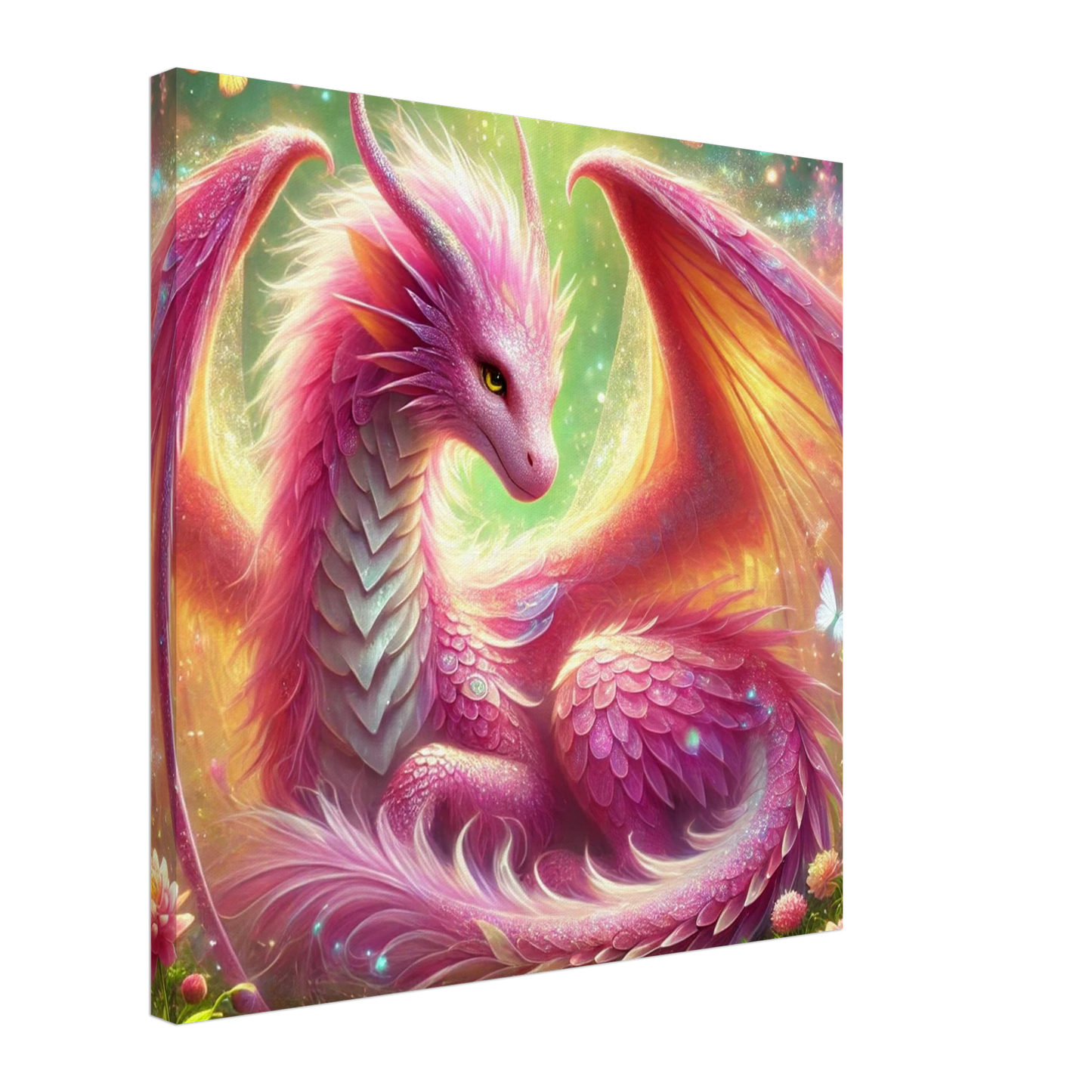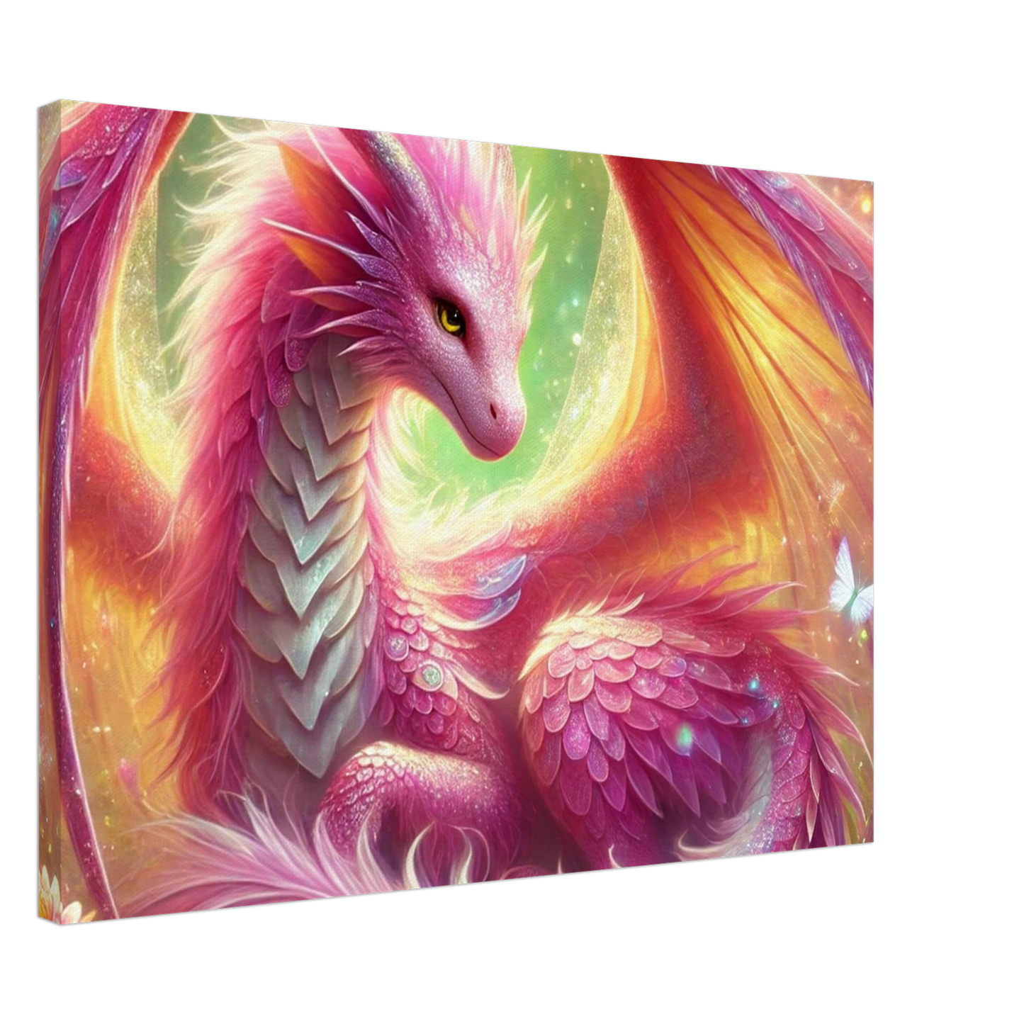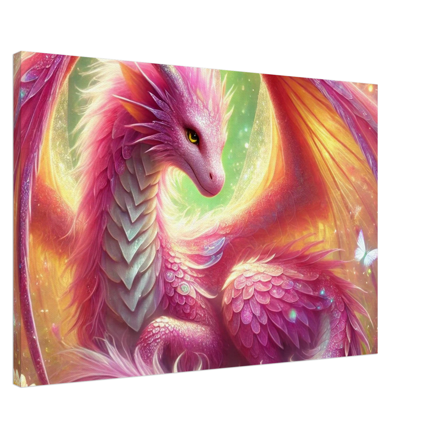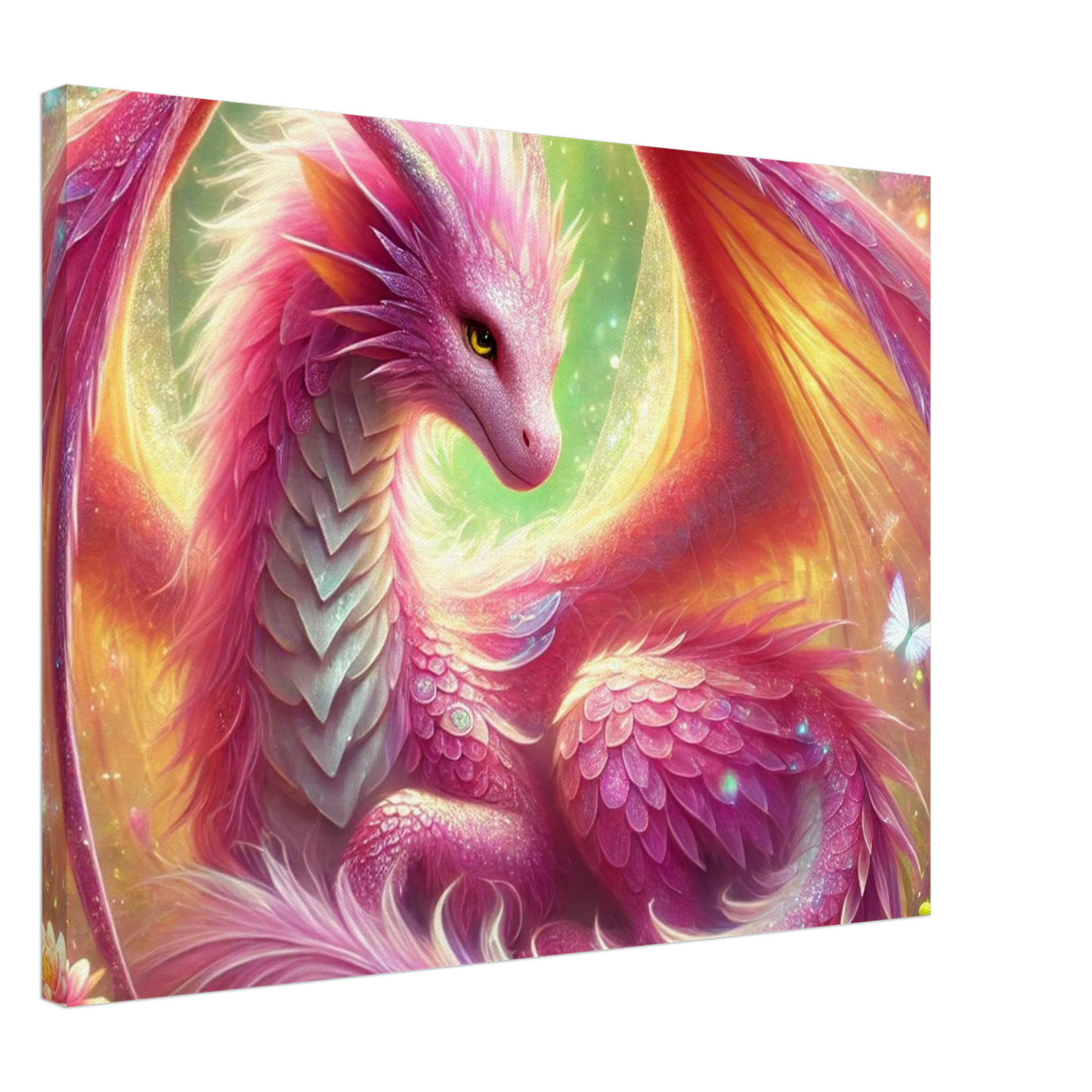 Verleihe deinem Raum ein Gefühl von Hoffnung, Magie und sanfter Energie mit dieser exklusiven Leinwandillustration von Auravelle, dem Blütendrachen des Lichts. Ihre zarten, rosafarbenen Schuppen, umgeben von Blüten und Schmetterlingen, erwachen durch die strukturierte Oberfläche der Leinwand zum Leben – ein visuelles und haptisches Erlebnis für die Sinne.