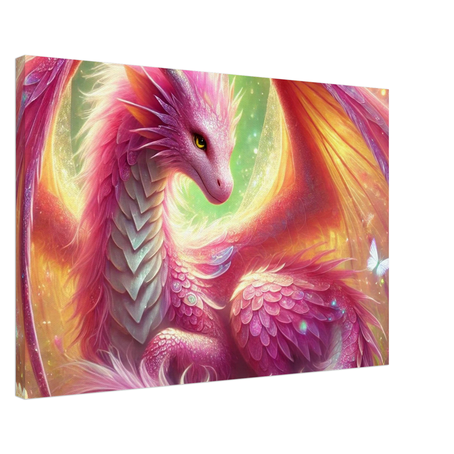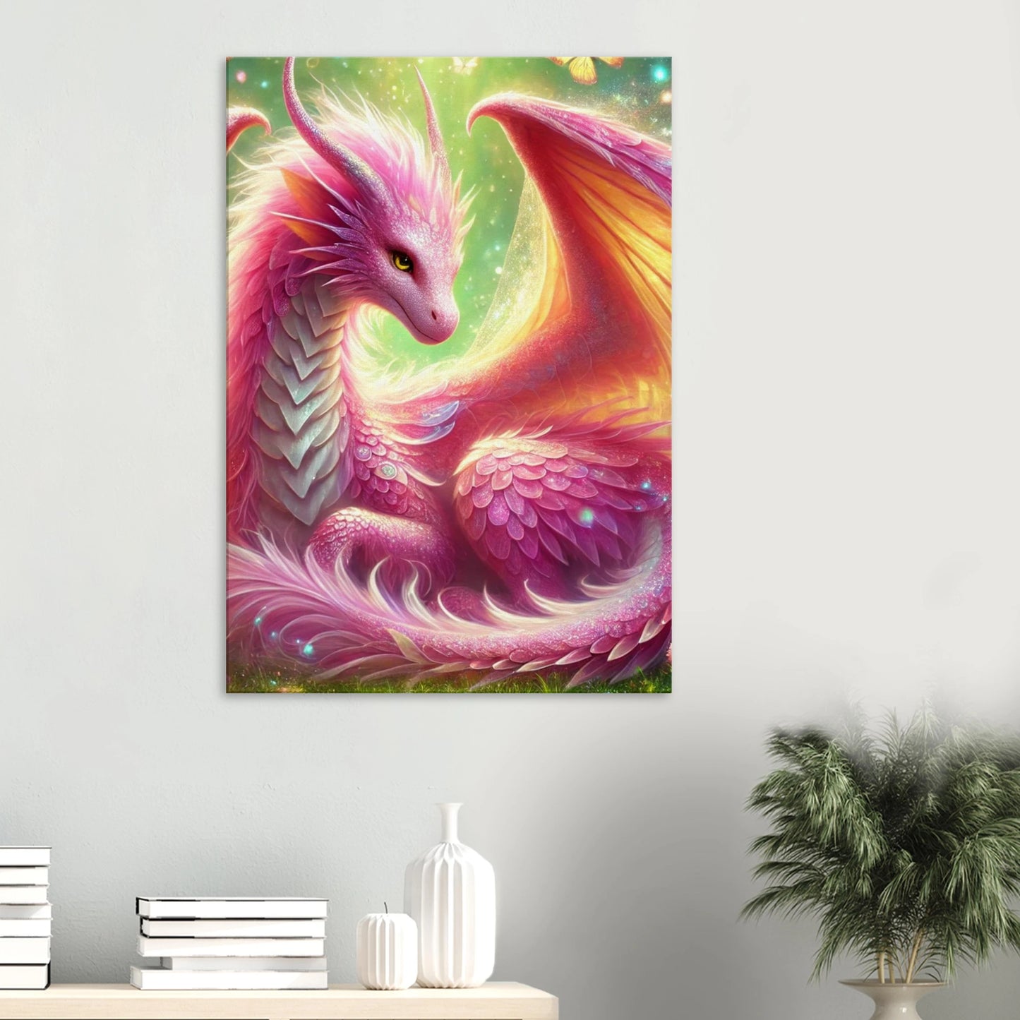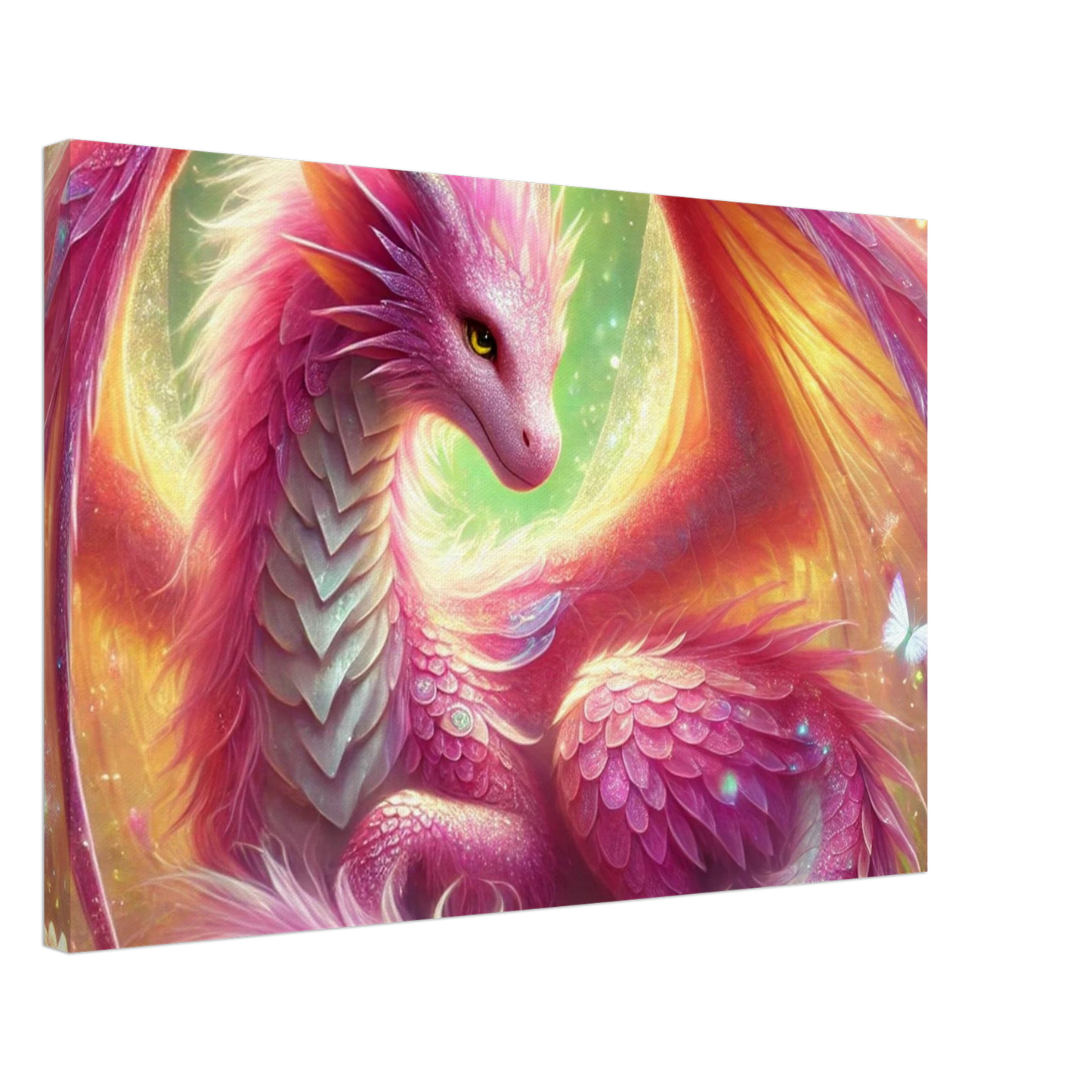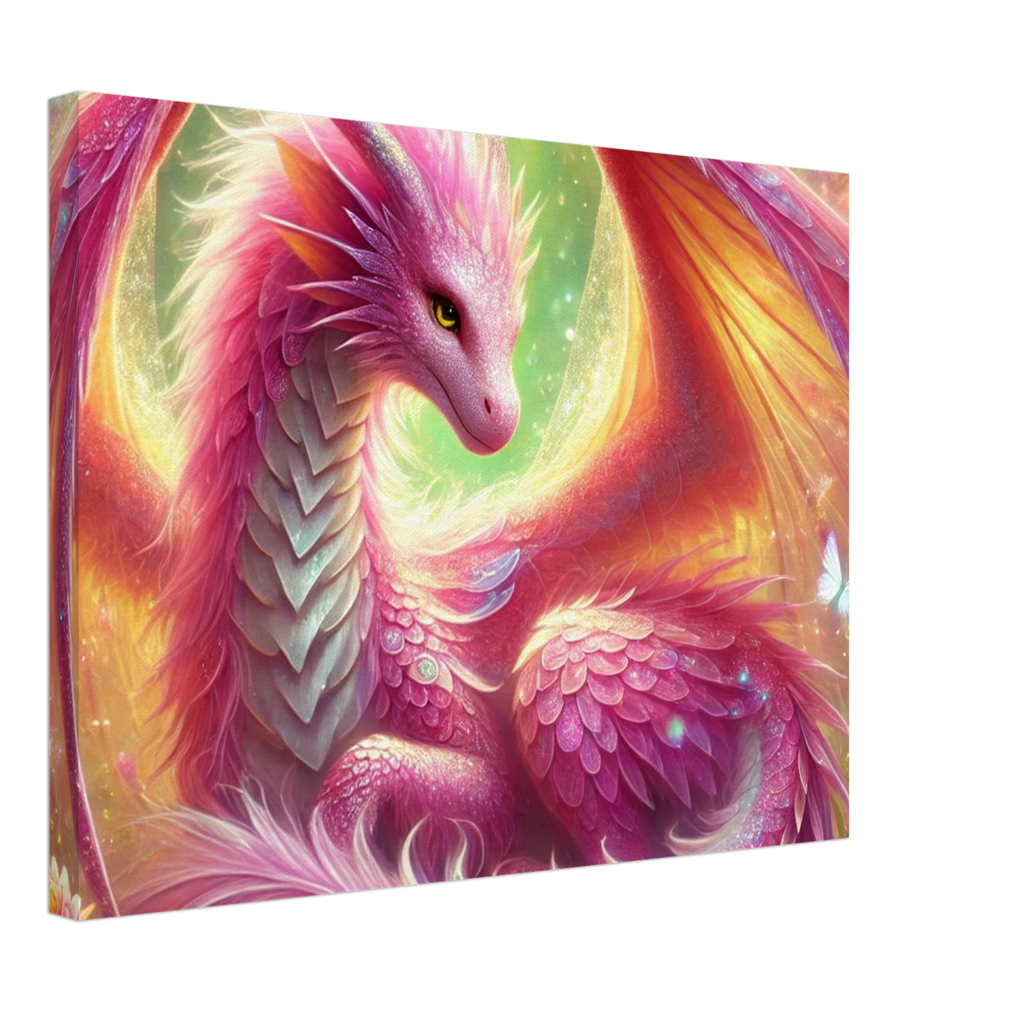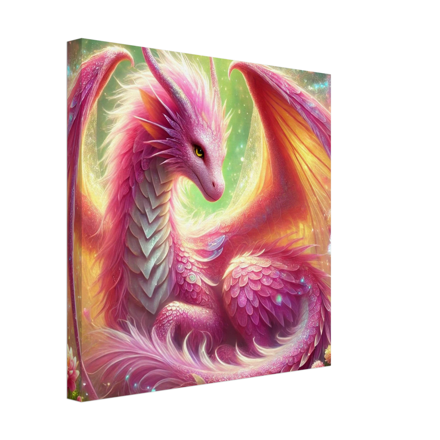 Verleihe deinem Raum ein Gefühl von Hoffnung, Magie und sanfter Energie mit dieser exklusiven Leinwandillustration von Auravelle, dem Blütendrachen des Lichts. Ihre zarten, rosafarbenen Schuppen, umgeben von Blüten und Schmetterlingen, erwachen durch die strukturierte Oberfläche der Leinwand zum Leben – ein visuelles und haptisches Erlebnis für die Sinne.