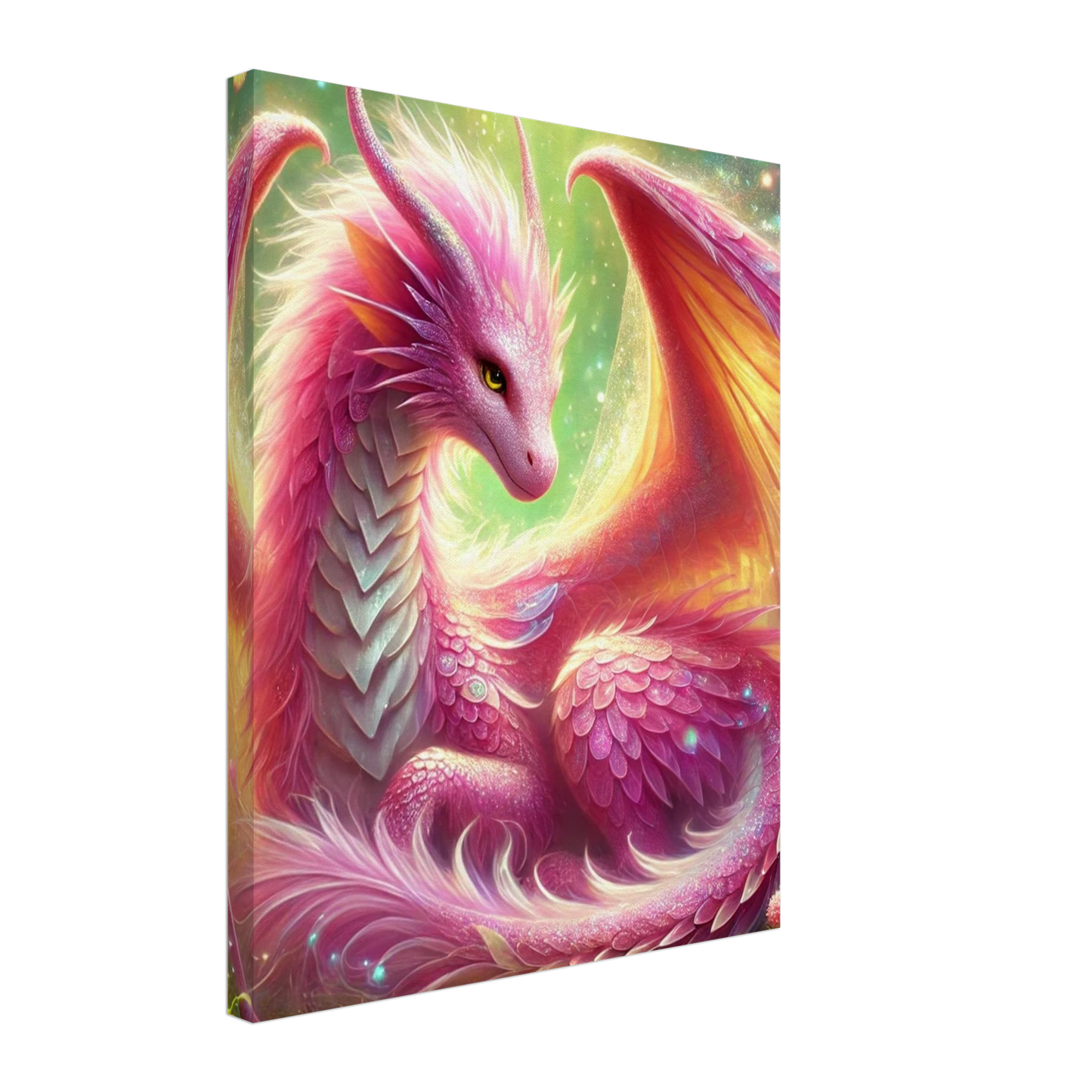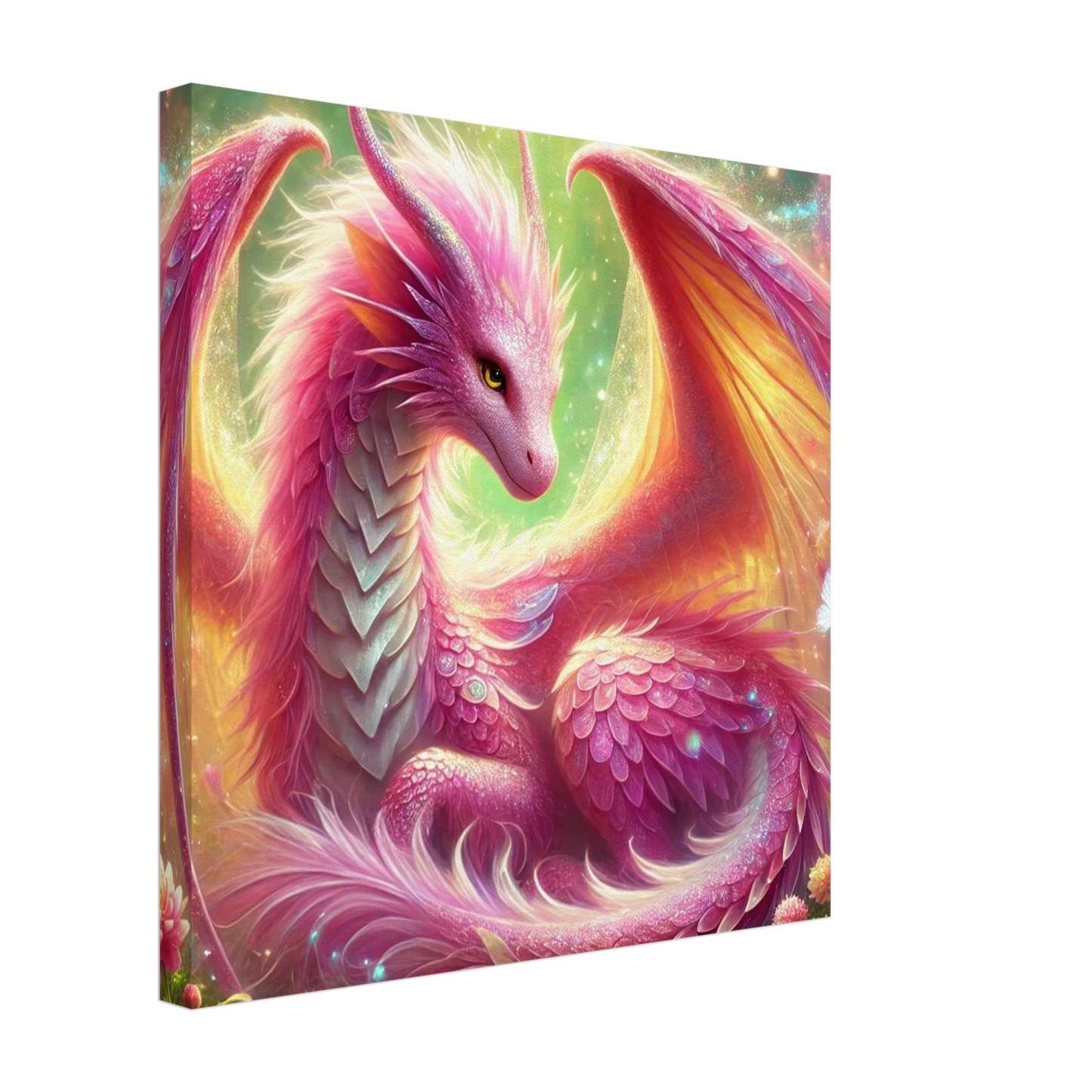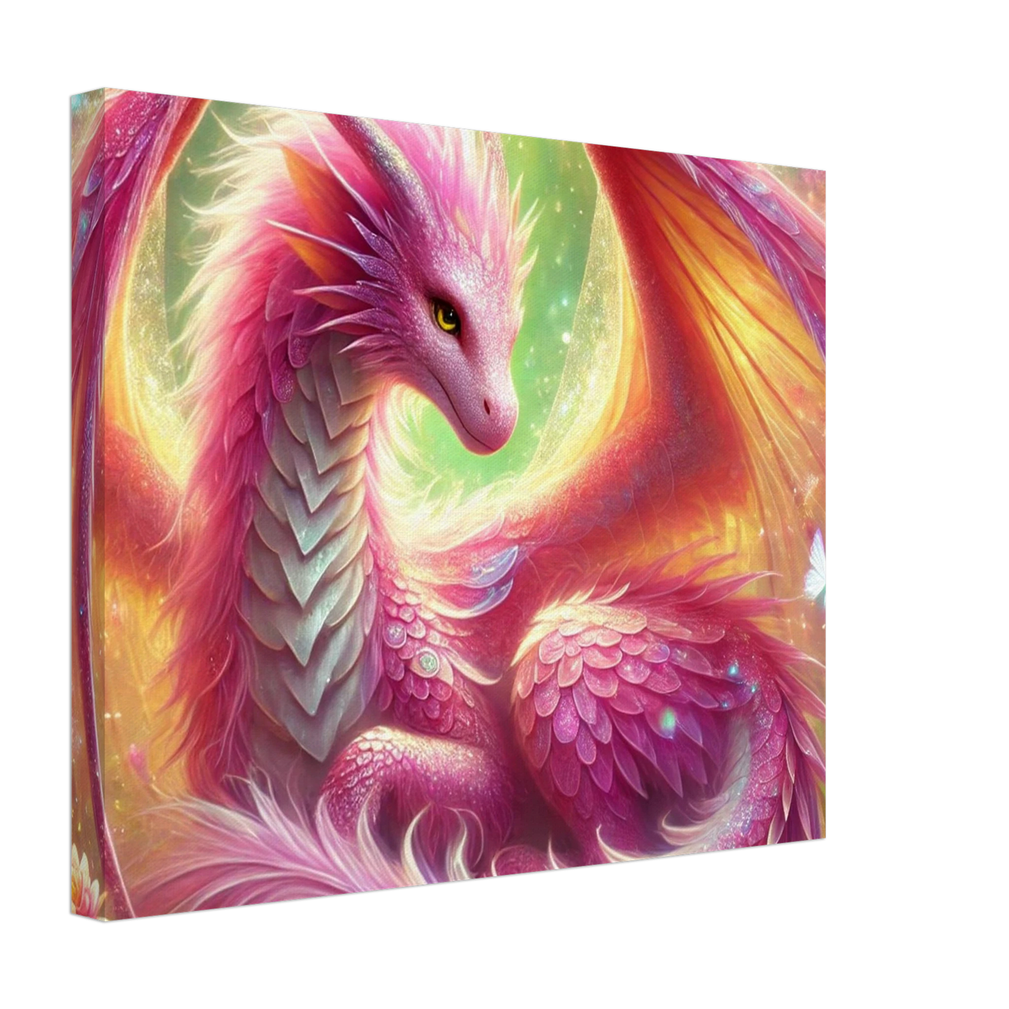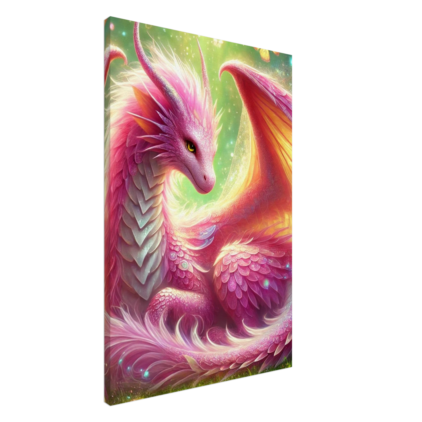 Verleihe deinem Raum ein Gefühl von Hoffnung, Magie und sanfter Energie mit dieser exklusiven Leinwandillustration von Auravelle, dem Blütendrachen des Lichts. Ihre zarten, rosafarbenen Schuppen, umgeben von Blüten und Schmetterlingen, erwachen durch die strukturierte Oberfläche der Leinwand zum Leben – ein visuelles und haptisches Erlebnis für die Sinne.