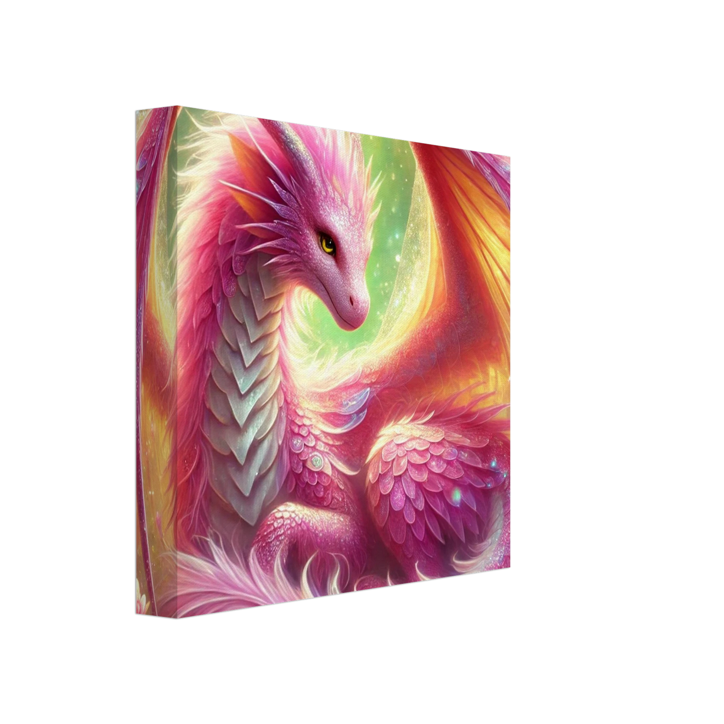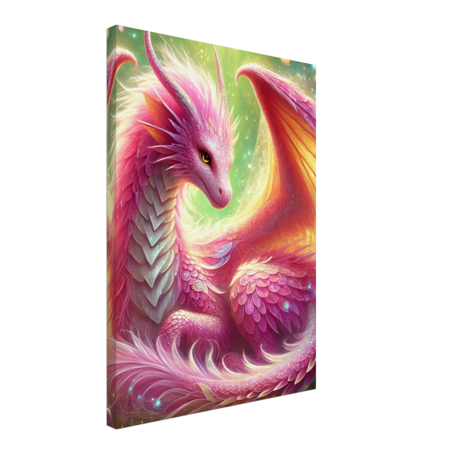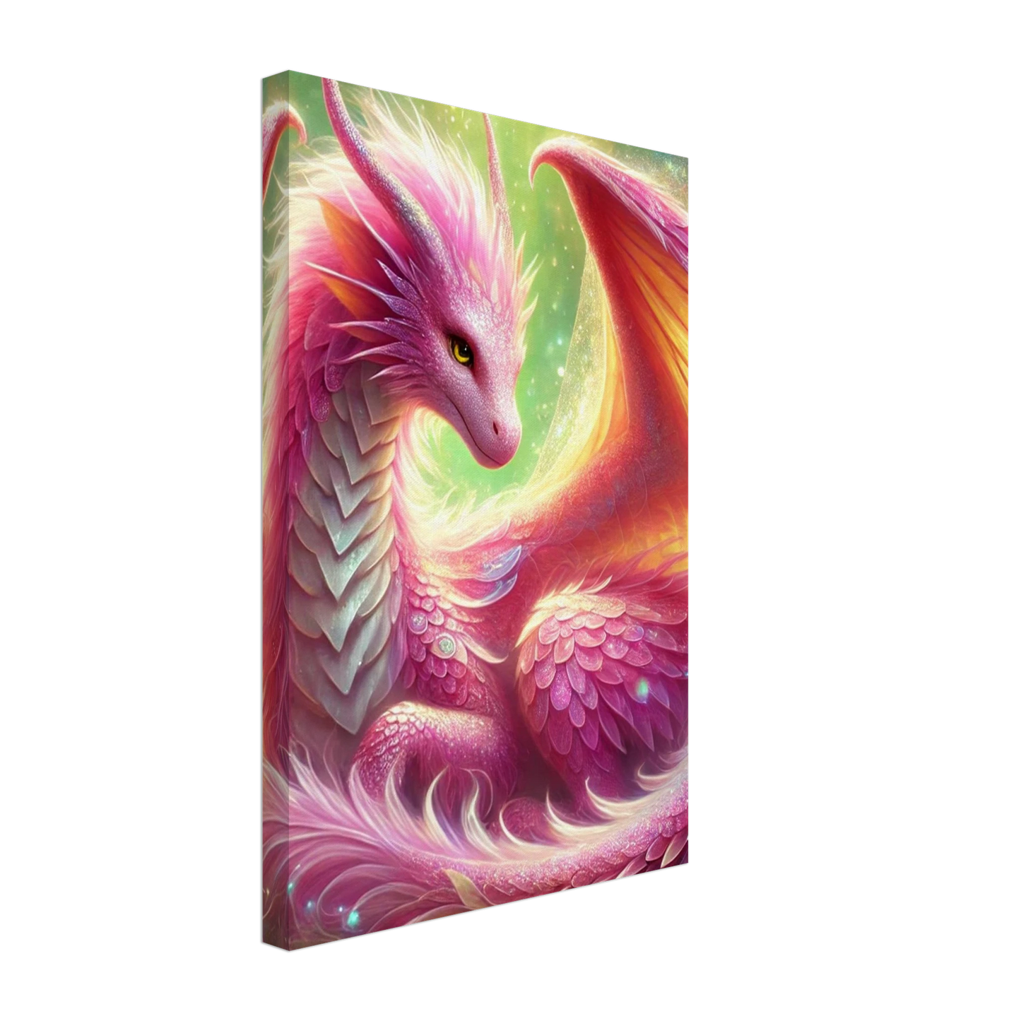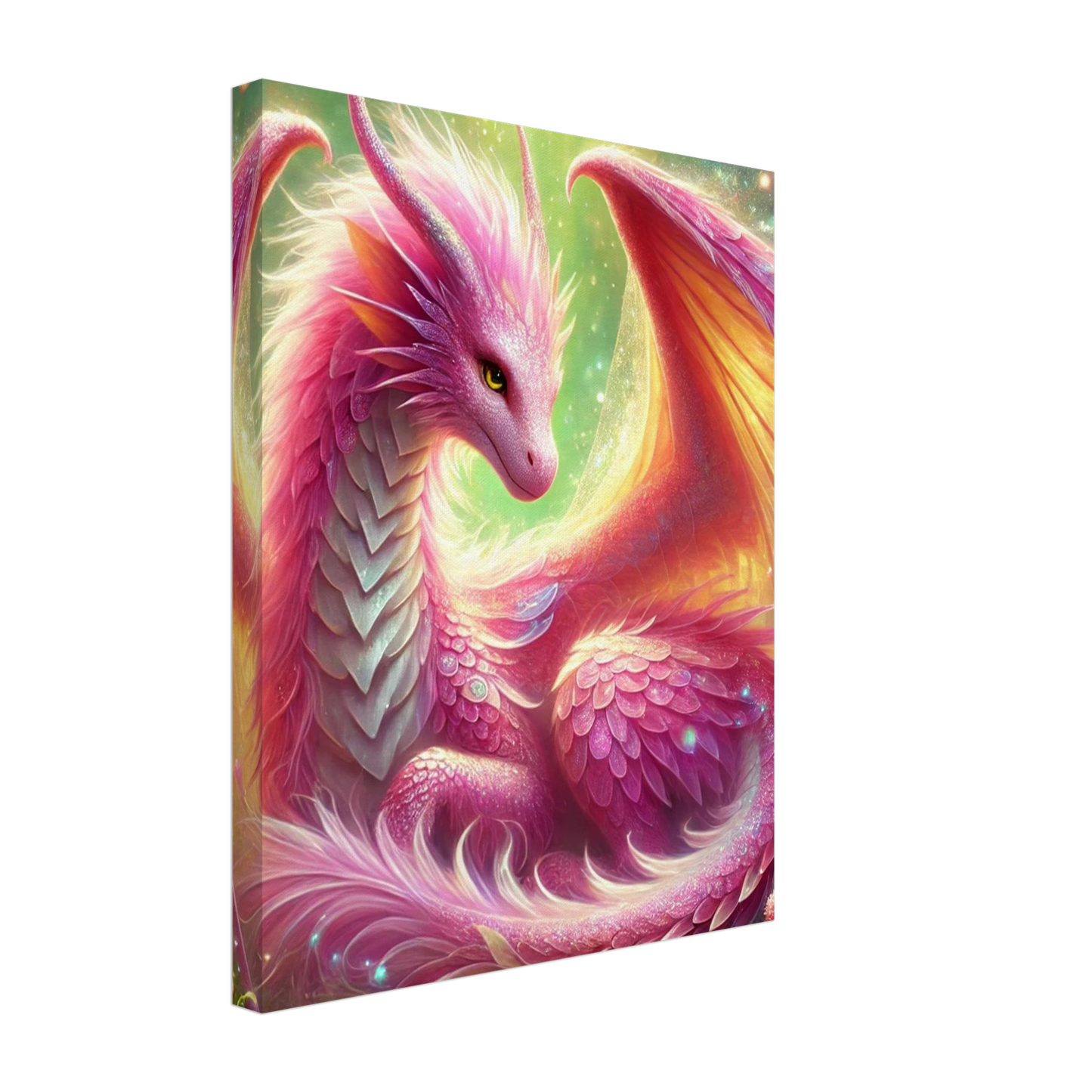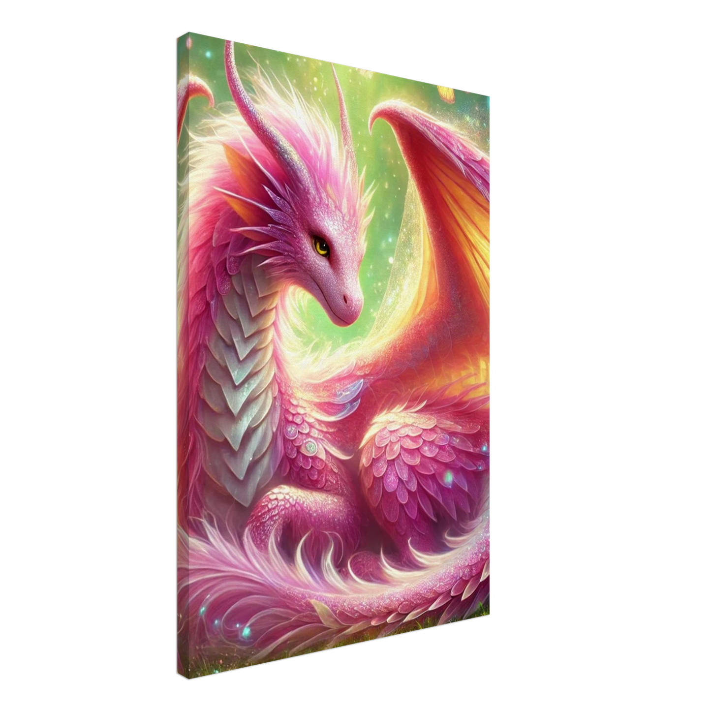 Verleihe deinem Raum ein Gefühl von Hoffnung, Magie und sanfter Energie mit dieser exklusiven Leinwandillustration von Auravelle, dem Blütendrachen des Lichts. Ihre zarten, rosafarbenen Schuppen, umgeben von Blüten und Schmetterlingen, erwachen durch die strukturierte Oberfläche der Leinwand zum Leben – ein visuelles und haptisches Erlebnis für die Sinne.