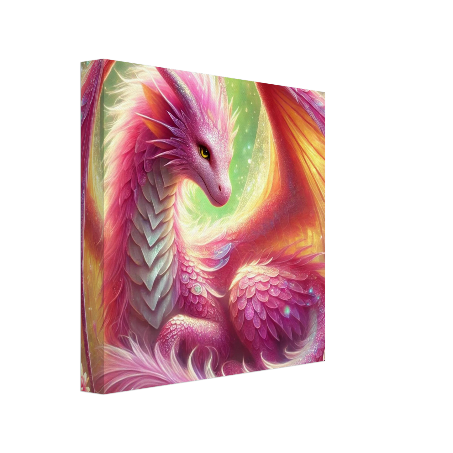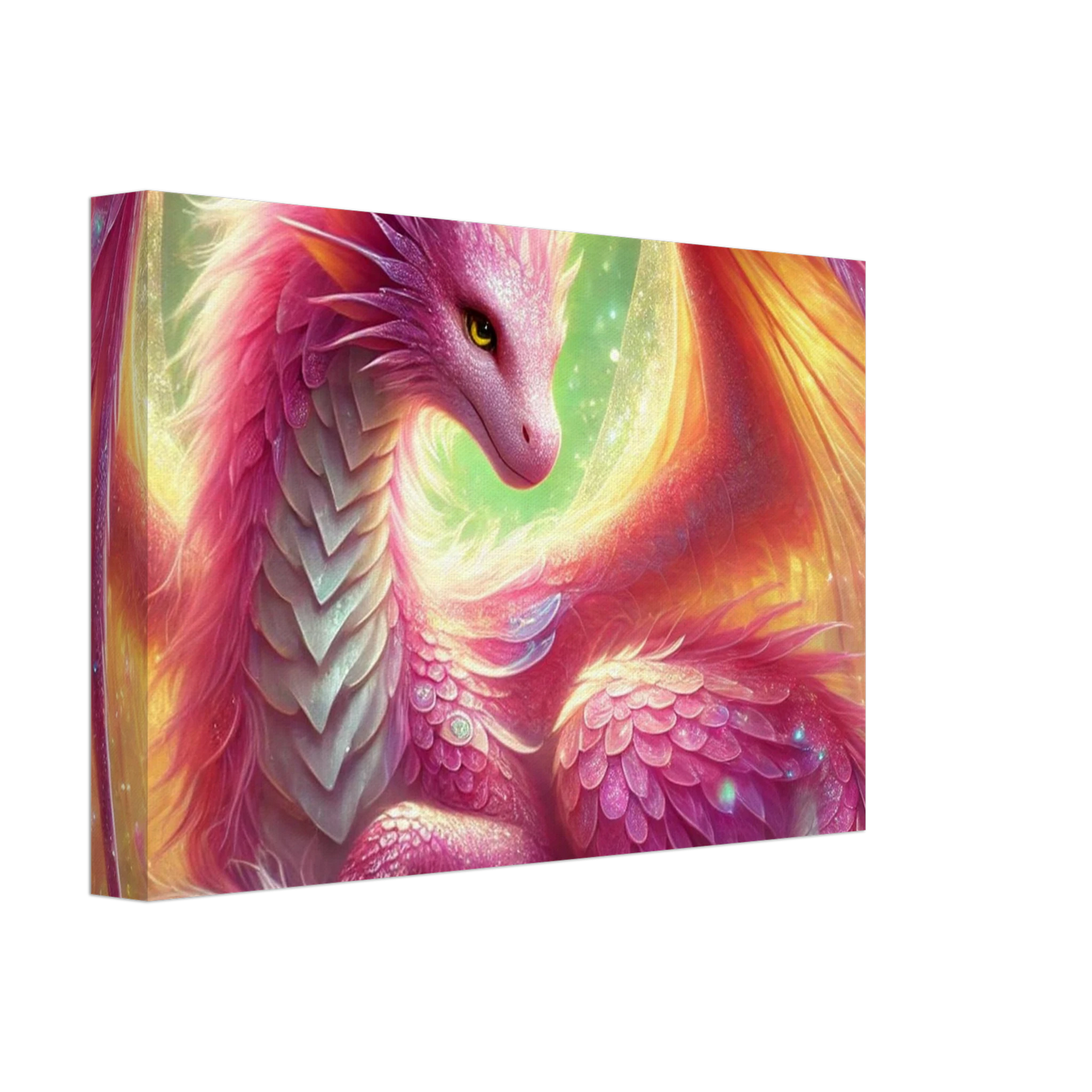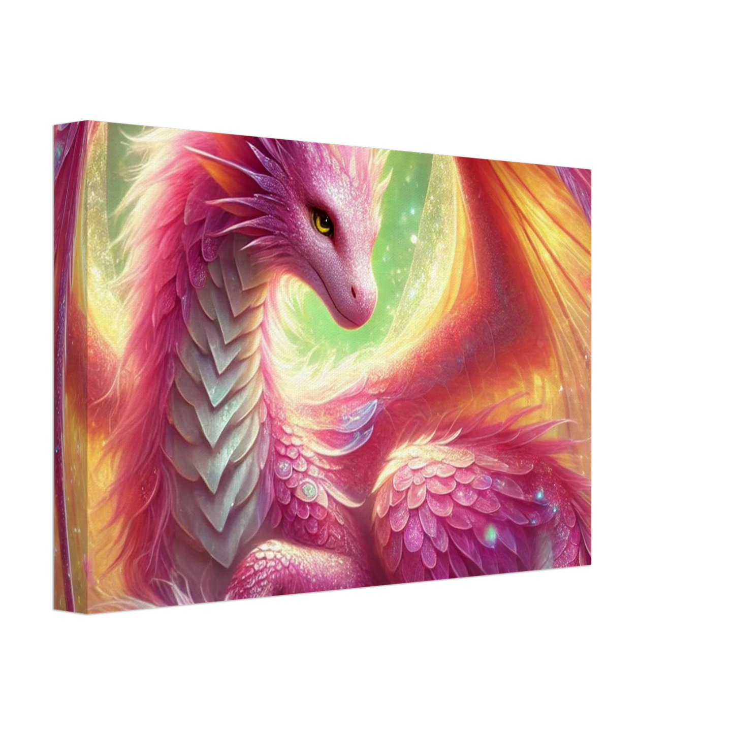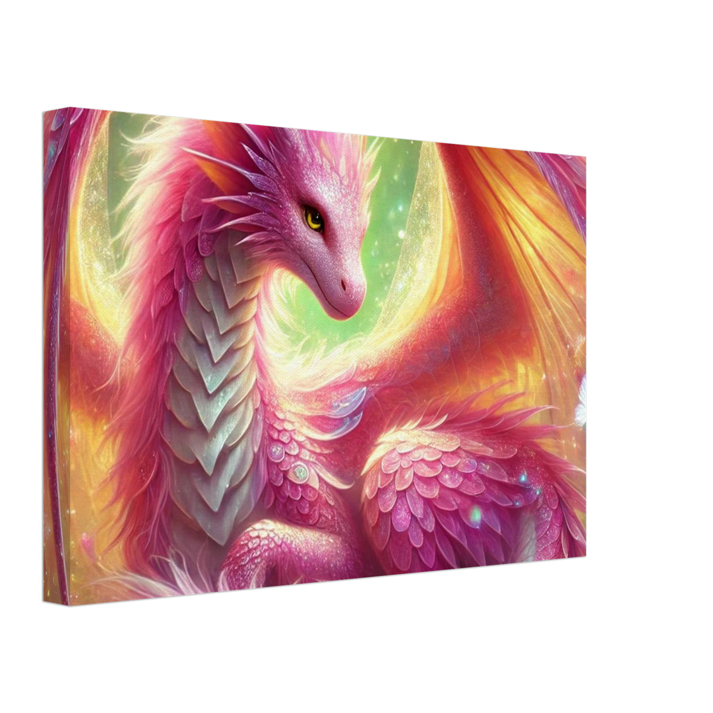 Verleihe deinem Raum ein Gefühl von Hoffnung, Magie und sanfter Energie mit dieser exklusiven Leinwandillustration von Auravelle, dem Blütendrachen des Lichts. Ihre zarten, rosafarbenen Schuppen, umgeben von Blüten und Schmetterlingen, erwachen durch die strukturierte Oberfläche der Leinwand zum Leben – ein visuelles und haptisches Erlebnis für die Sinne.