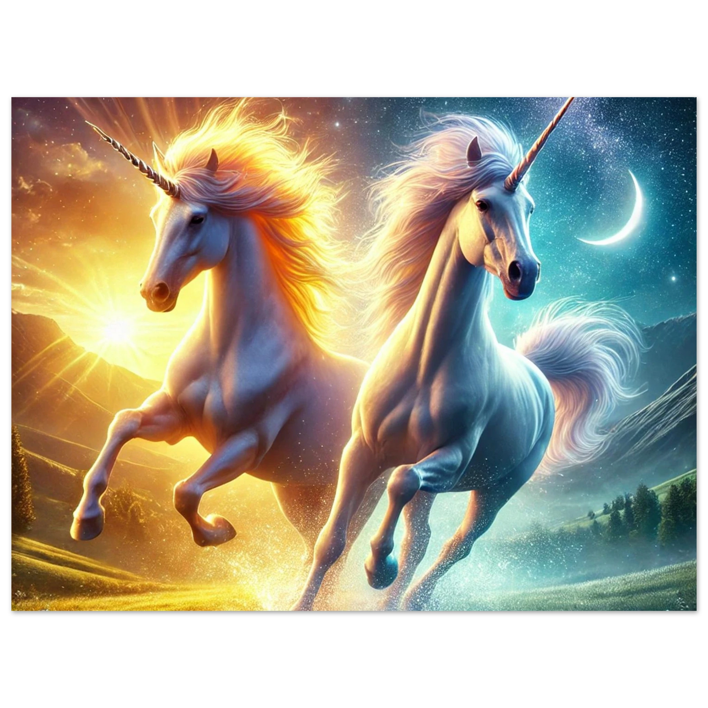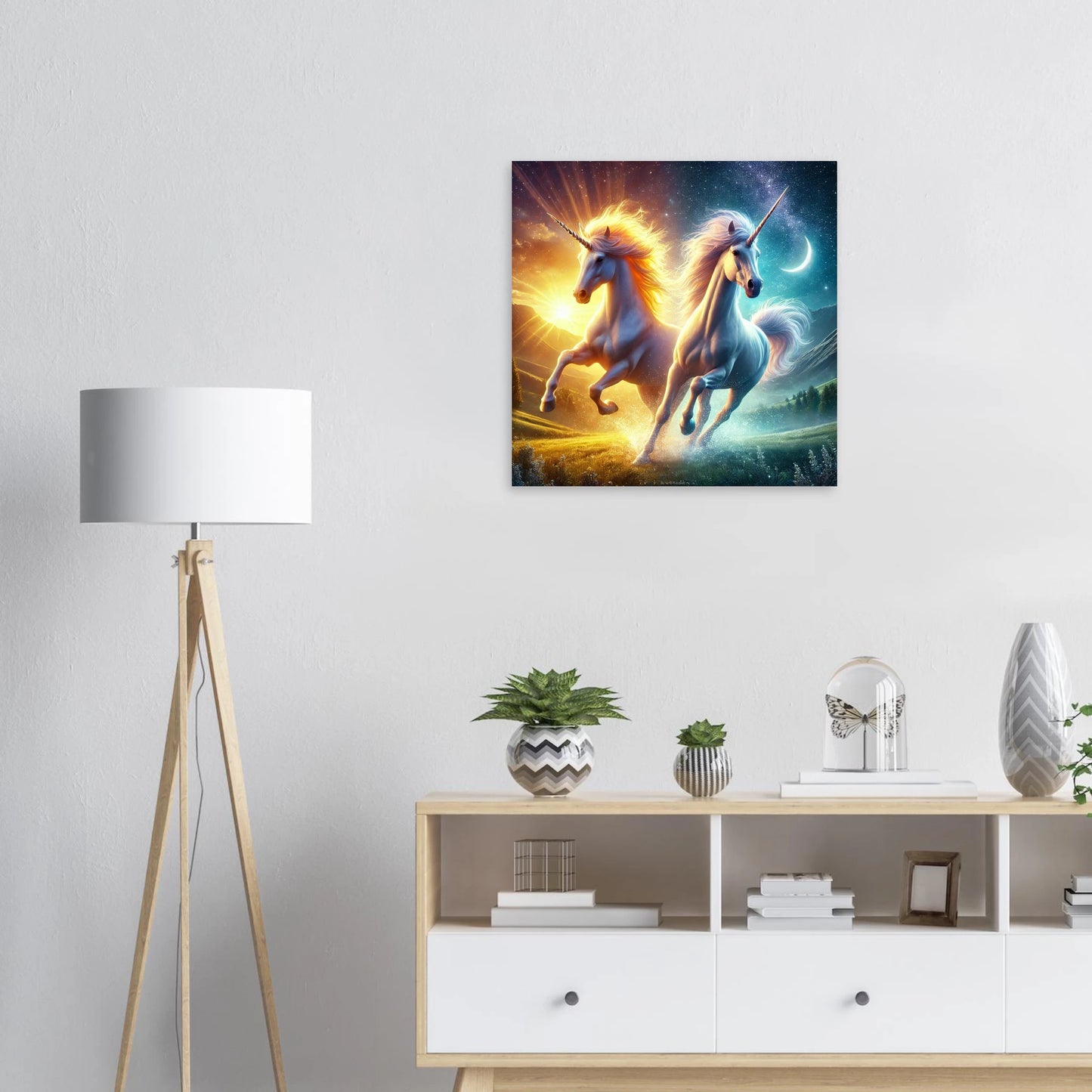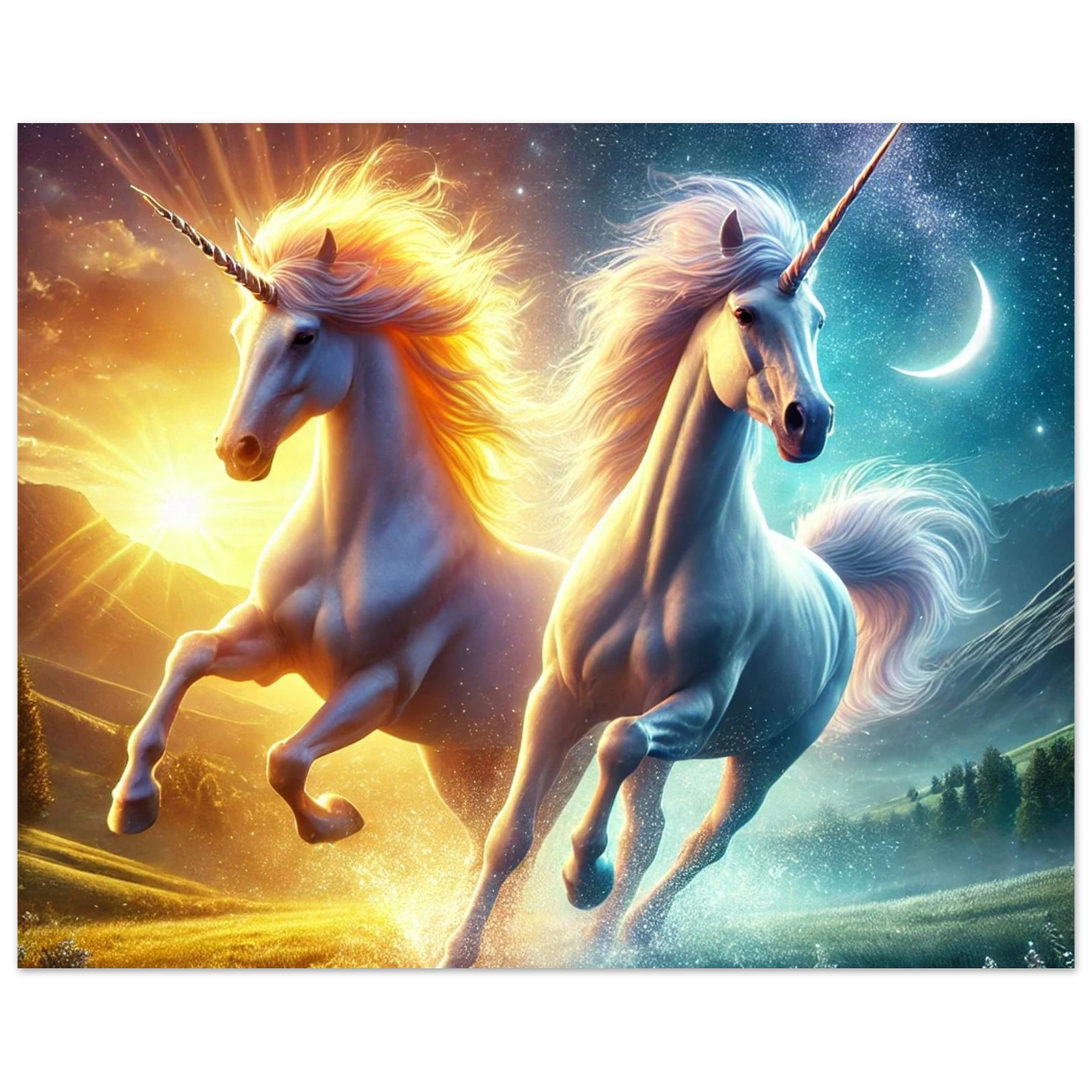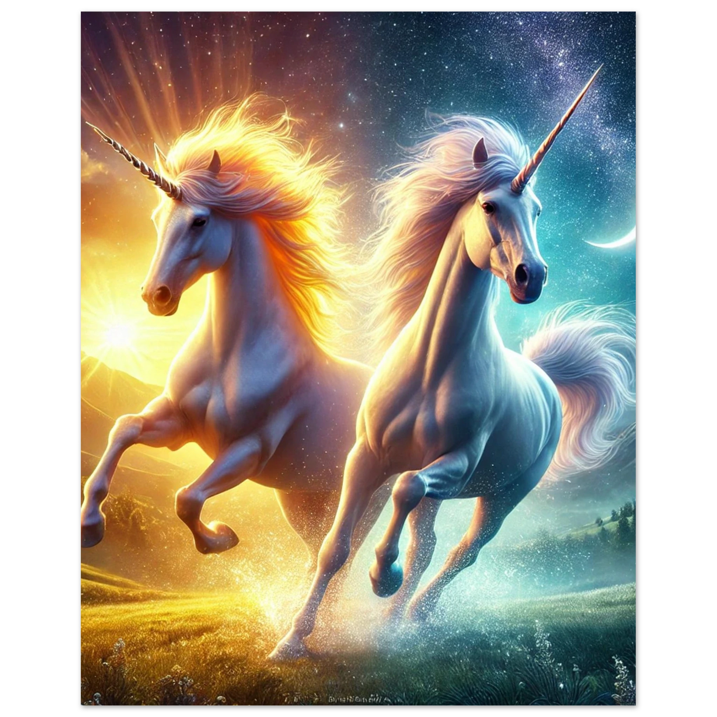 Erlebe die Harmonie von Tag und Nacht in einem beeindruckenden Wandkunstwerk: „Aurelion & Selene“ zeigt zwei majestätische Einhörner – eines im goldenen Glanz der Sonne, das andere im silbernen Licht des Mondes. Dieser Aluminiumdruck verbindet die spirituelle Tiefe der Geschichte mit moderner Eleganz – ein kraftvoller Blickfang für jede Wand.