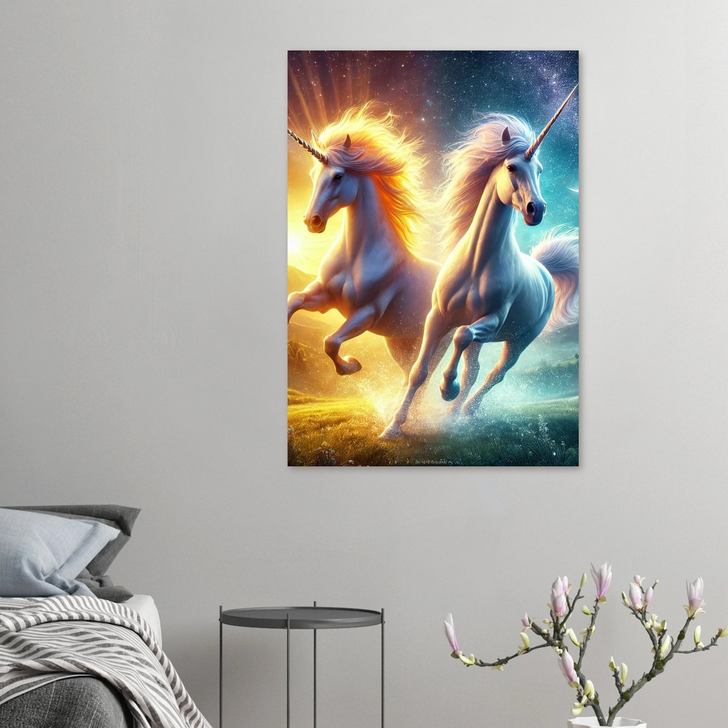 Bring die Harmonie von Tag und Nacht direkt an deine Wand – mit „Aurelion & Selene“ als eleganter Schaumstoffdruck. Die zwei magischen Einhörner, vereint im Moment der Dämmerung, erscheinen auf moderner, superleichter PVC-Platte mit brillanter Farbdarstellung und klaren Linien – perfekt für jeden Raum mit einem Hauch Fantasie und tiefer Bedeutung.