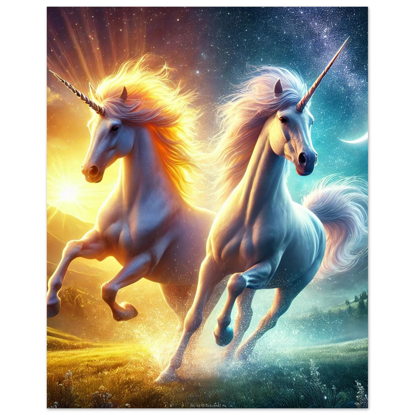 Aurelion, das Einhorn des Sonnenlichts, und Selene, das Wesen der stillen Nacht, beschützen gemeinsam das Gleichgewicht zwischen Licht und Dunkelheit. Sie begegnen sich nur in der magischen Minute der Dämmerung – ein Sinnbild für Balance, Hoffnung und stille Kraft.