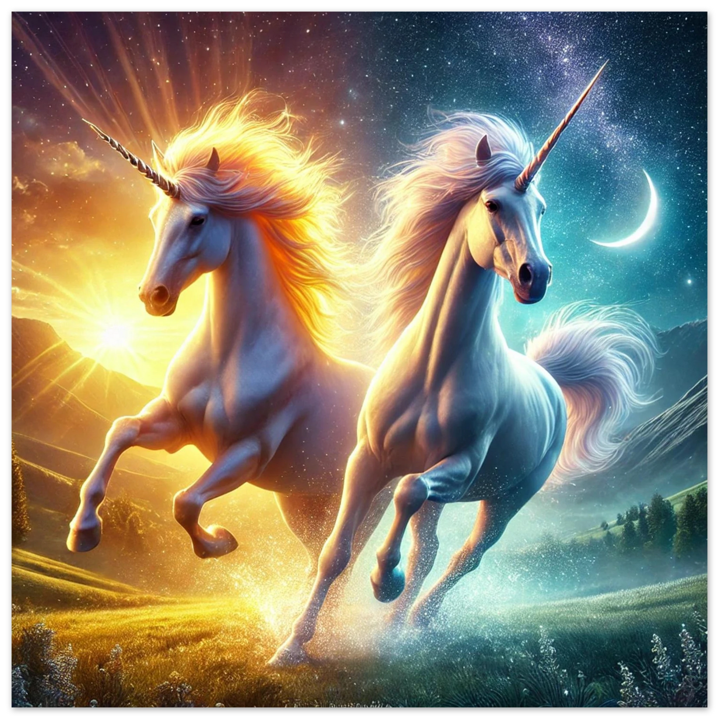 Aurelion, das Einhorn des Sonnenlichts, und Selene, das Wesen der stillen Nacht, beschützen gemeinsam das Gleichgewicht zwischen Licht und Dunkelheit. Sie begegnen sich nur in der magischen Minute der Dämmerung – ein Sinnbild für Balance, Hoffnung und stille Kraft.