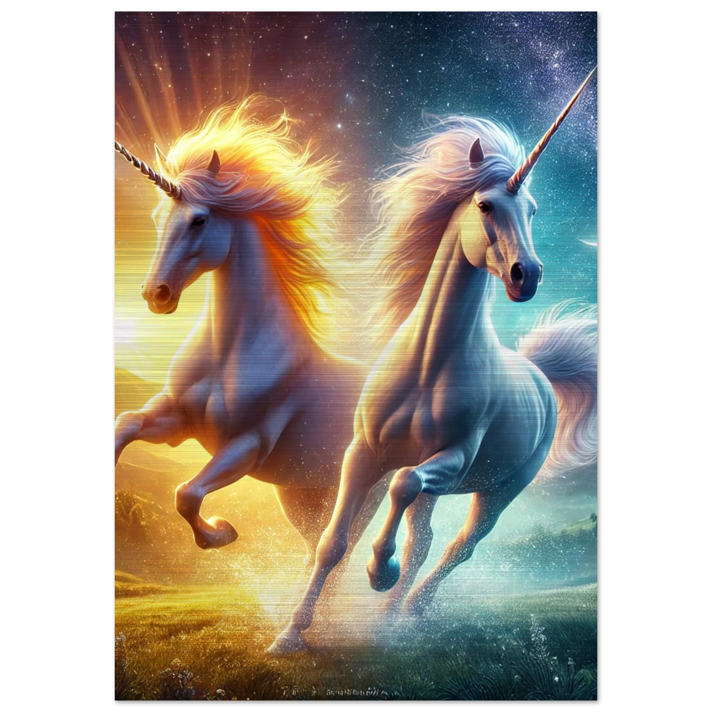 Licht trifft Schatten, Gold begegnet Silber – „Aurelion & Selene“ fängt den magischen Augenblick ein, in dem sich Tag und Nacht berühren. Diese hochwertige Fantasie-Illustration zweier Einhörner – eines strahlend im Sonnenlicht, das andere ruhig im Mondschein – entfaltet auf gebürstetem Aluminium eine besondere Tiefe und Dynamik.