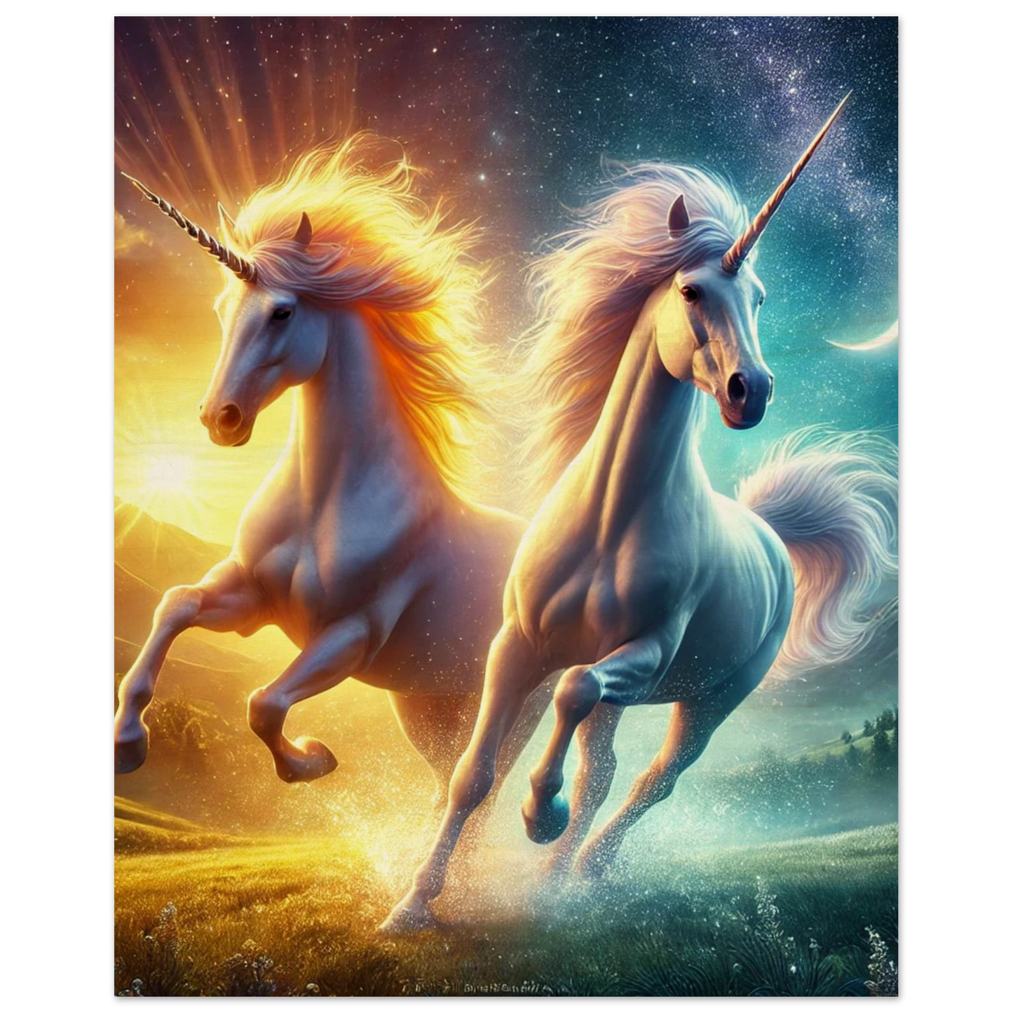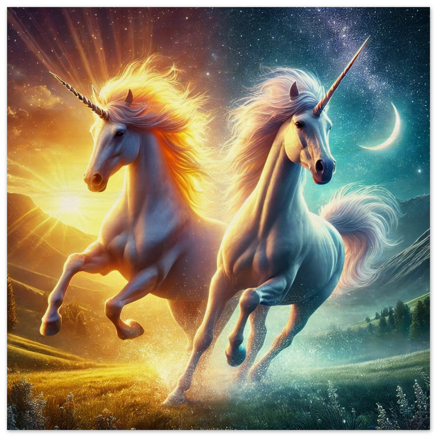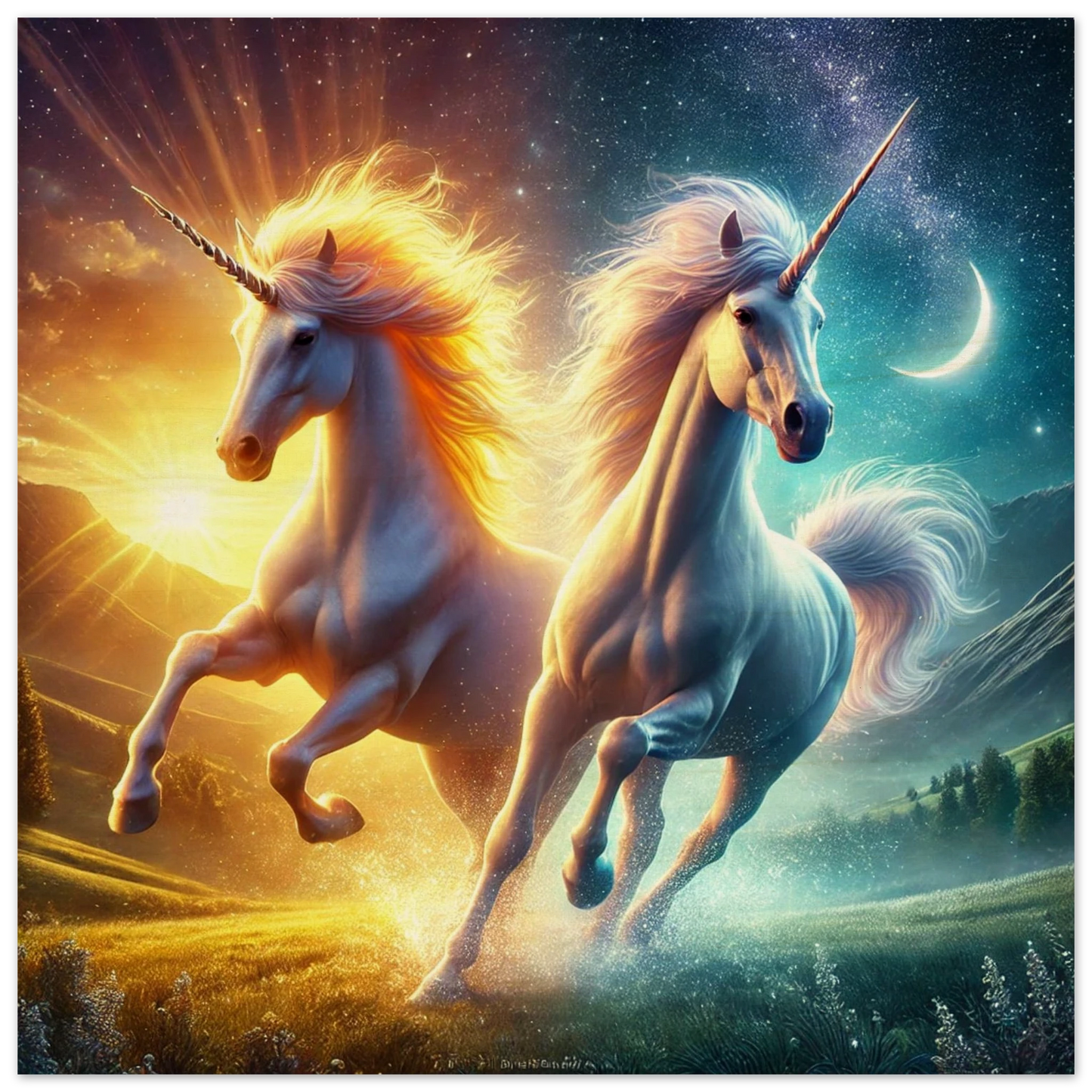 Aurelion, das goldene Einhorn des Tages, und Selene, das silberne Einhorn der Nacht, beschützen das Gleichgewicht von Licht und Dunkel. Sie begegnen sich nur in der Dämmerung – ein Moment voller Magie, in dem Hoffnung, Stille und Kraft miteinander tanzen.