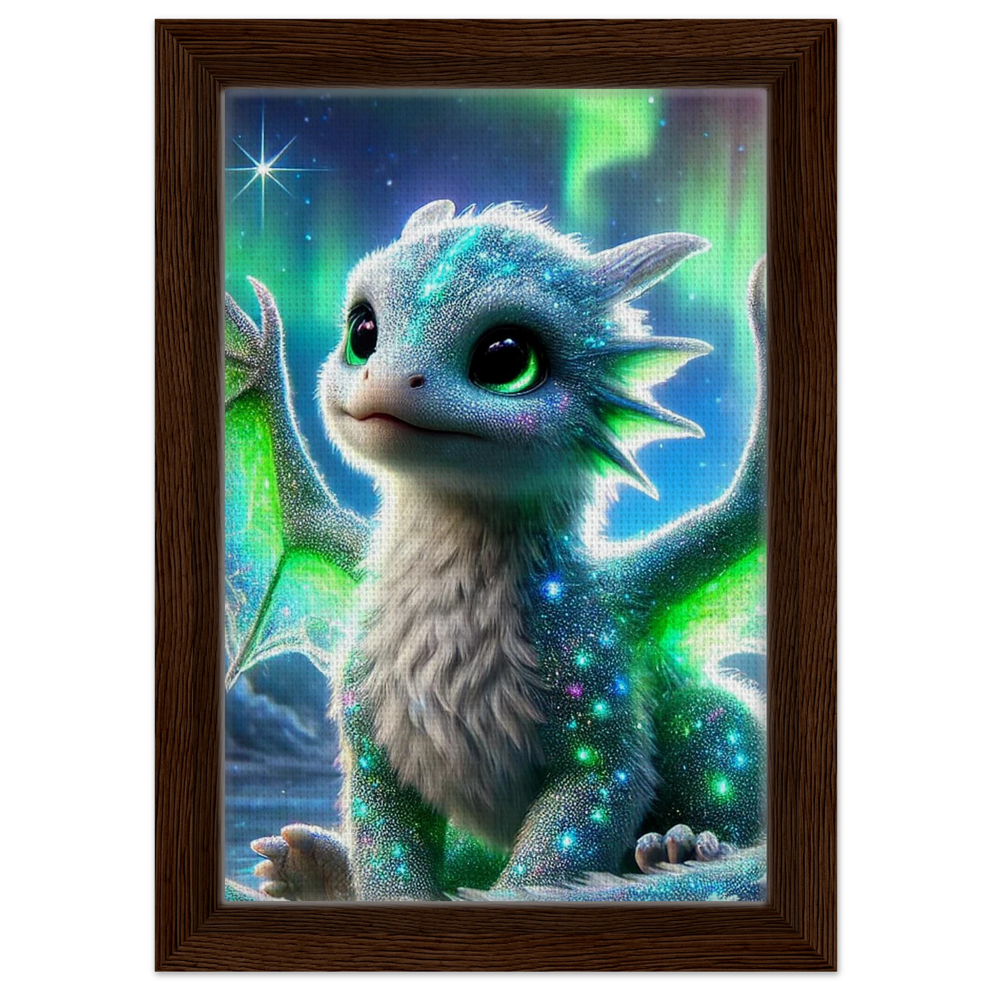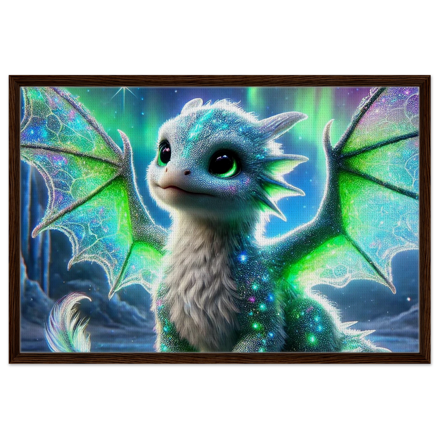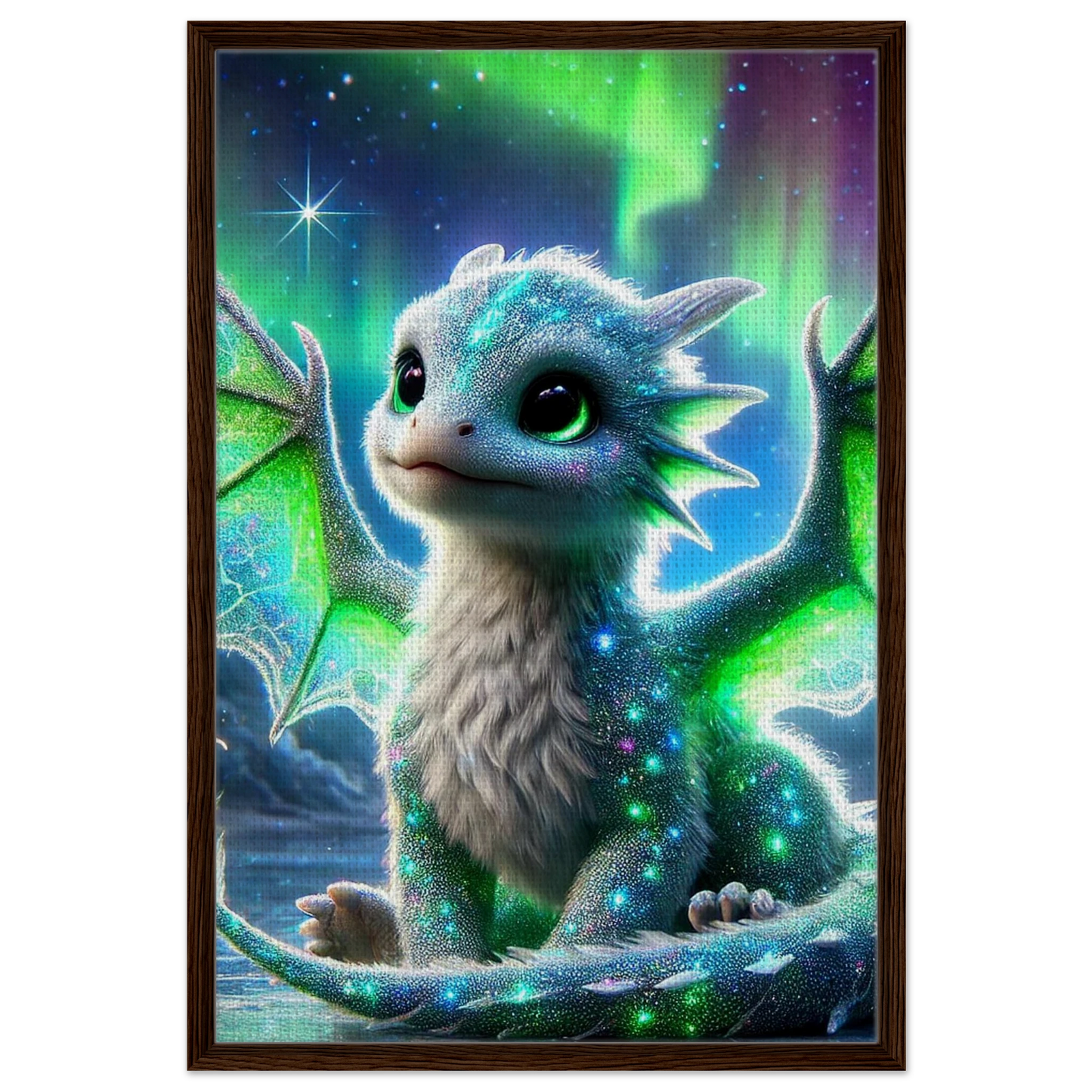 Lass dich von der stillen Magie des Nordlichts verzaubern: Der gerahmte Leinwanddruck Aurilux – Wächter des Nordlichts bringt die schimmernden Farben und die ruhige Präsenz des kleinen Eisdrachen direkt in dein Zuhause. Die feine Textur der Leinwand verleiht dem Motiv Tiefe, während der hochwertige Rahmen dem Werk Eleganz und Haltbarkeit schenkt.