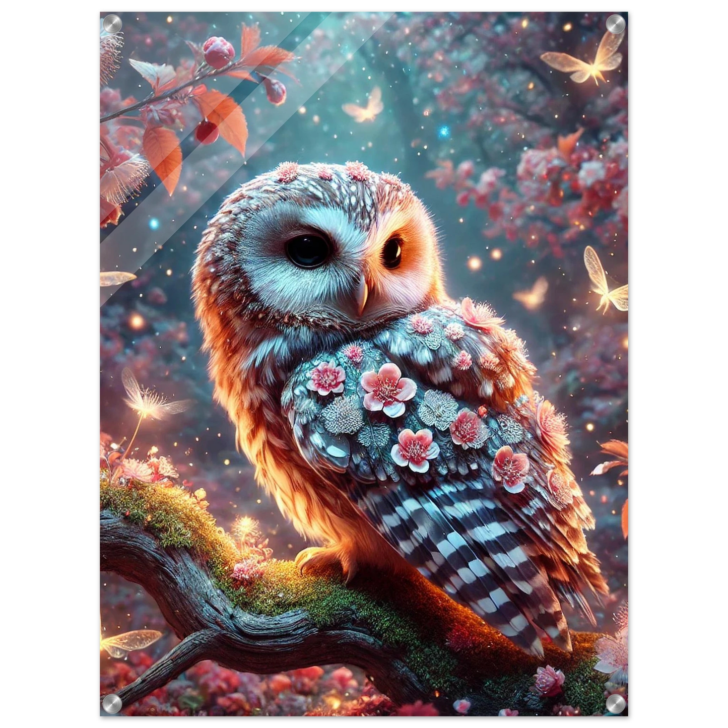 Lass dich von Blütenflügel, der mystischen Eule der Dämmerung, verzaubern – als hochwertiger Acrylglasdruck mit brillanter Tiefenwirkung und strahlenden Farben. Dieses kunstvolle Werk fängt den stillen Moment zwischen Tag und Nacht ein – mit schimmernden Blüten, funkelnden Nachtfaltern und friedvoller Eleganz.