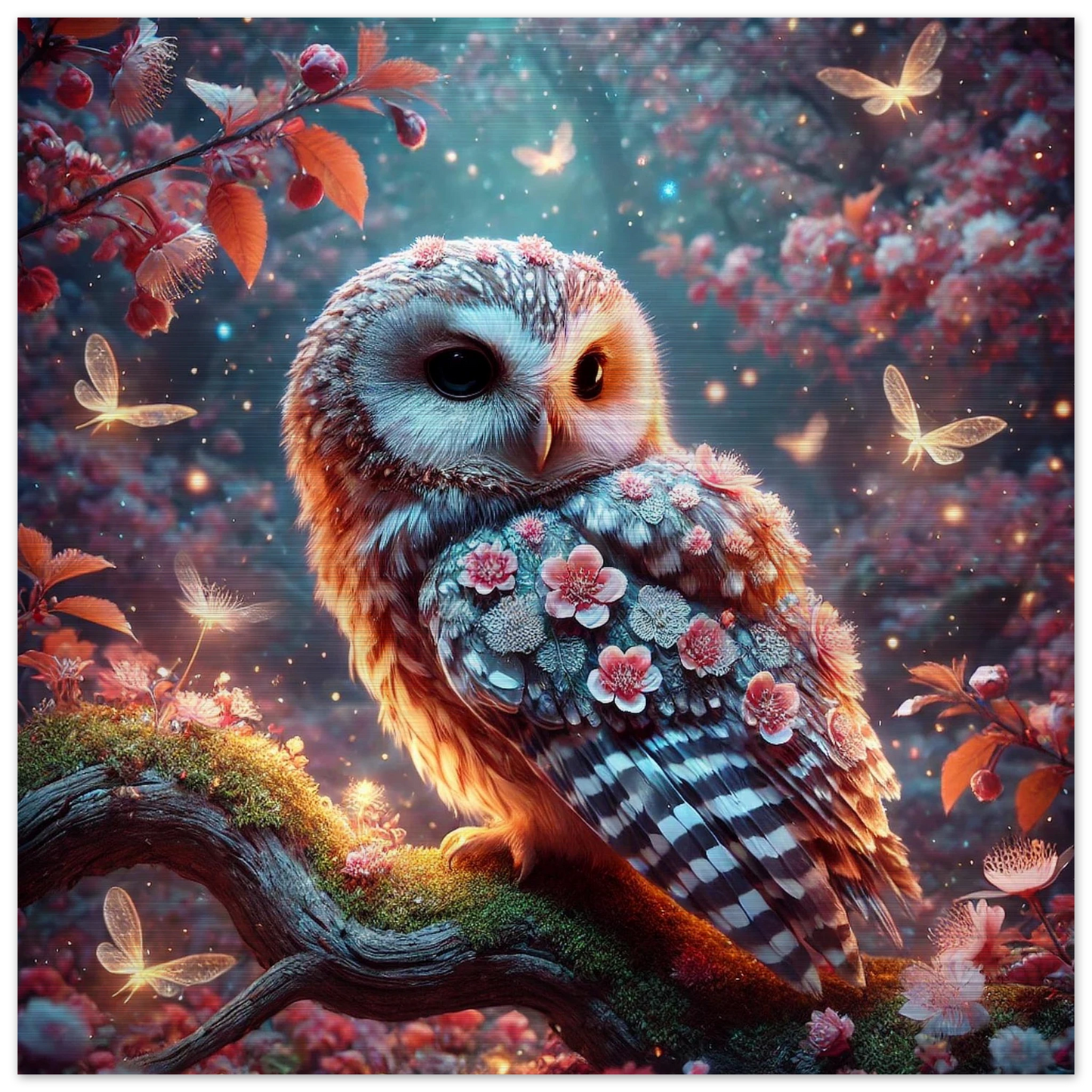 Erlebe Blütenflügel, die magische Eule der Dämmerung, auf gebürstetem Aluminium – ein Kunstwerk, das Natur, Fantasie und stille Poesie auf edlem Metall vereint. Ihr von Blüten durchzogenes Gefieder und die zarten Nachtfalter erwachen durch die metallic-schimmernde Oberfläche zu neuem Leben.