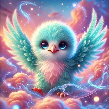 „Celira“ ist ein bezaubernder, himmlischer Fantasievogel mit türkisblauem Gefieder und leuchtenden Augen, der zwischen rosa Wolken und funkelnden Lichtwirbeln tanzt.