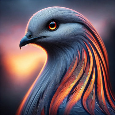 Wenn die Sonne untergeht und der Himmel in Flammen zu stehen scheint, erscheint Cendris – ein Bote zwischen Licht und Schatten. Seine Federn tragen das Glühen der untergehenden Sonne, sein Auge spiegelt die Weisheit alter Feuergeister.