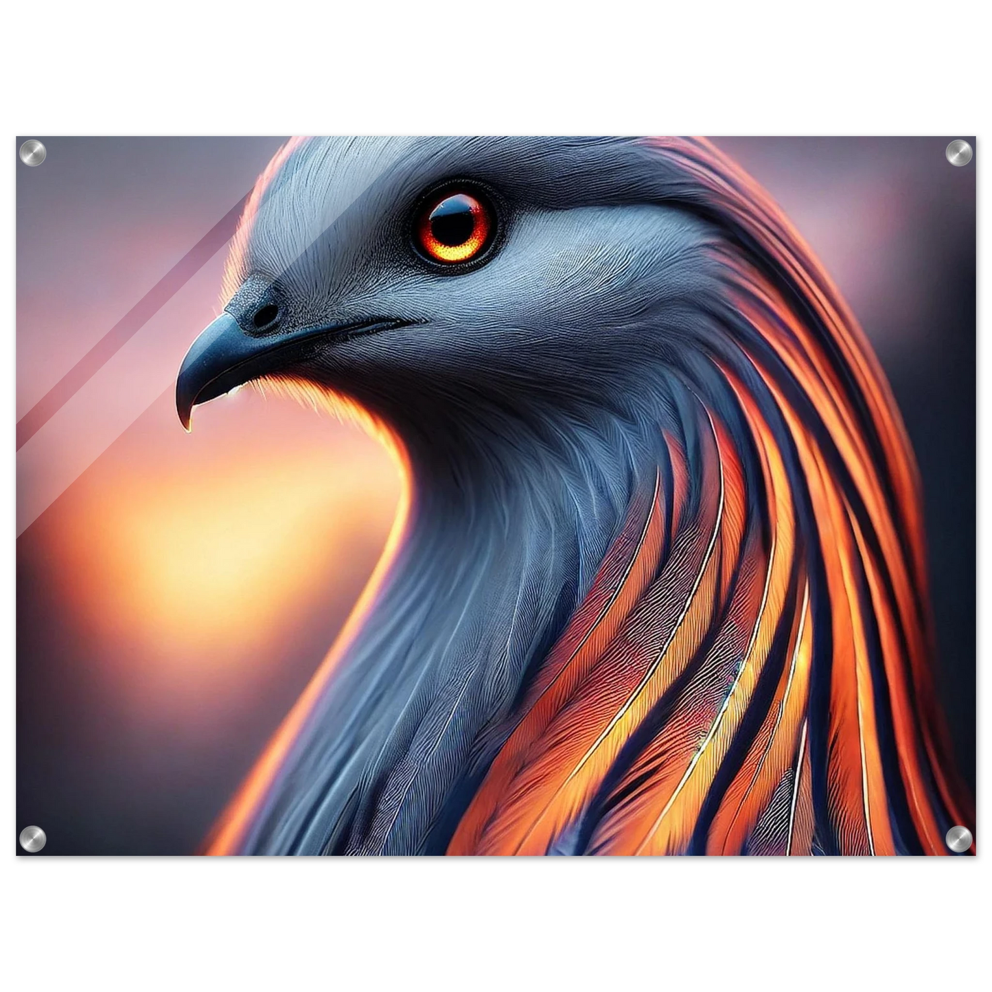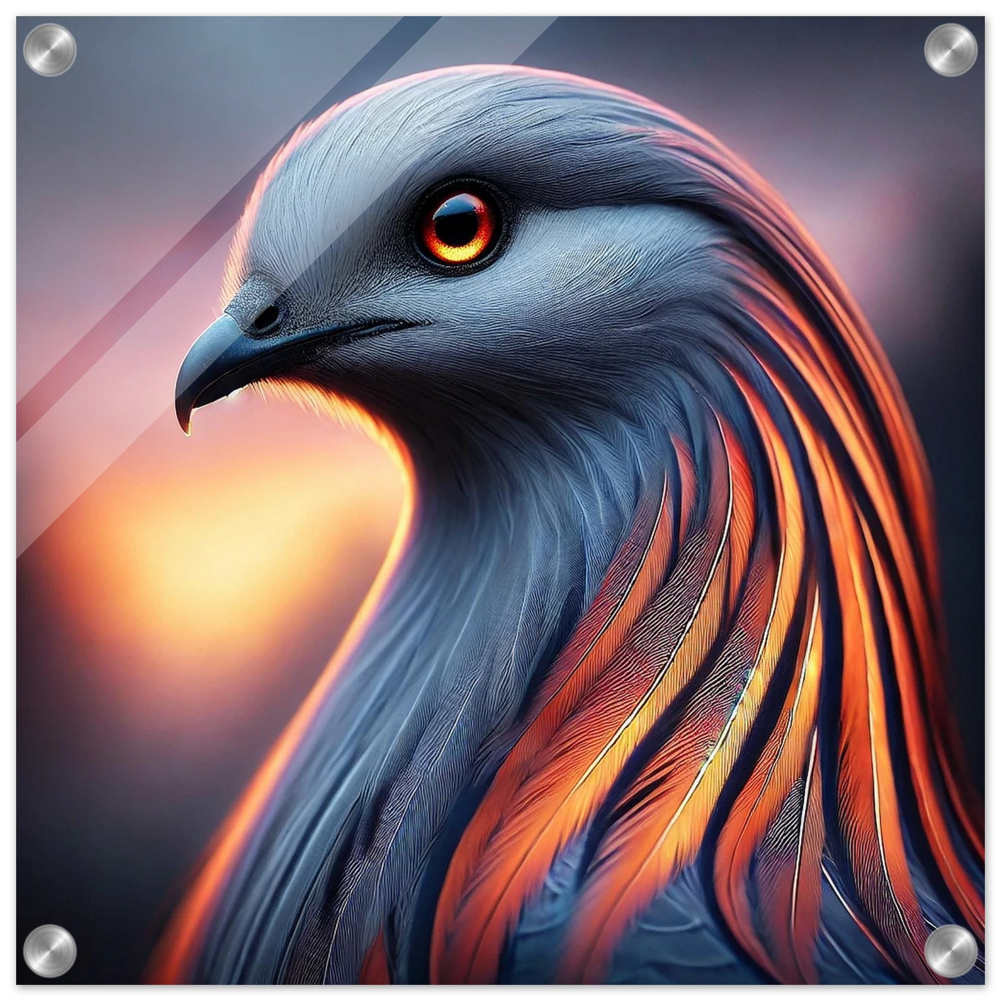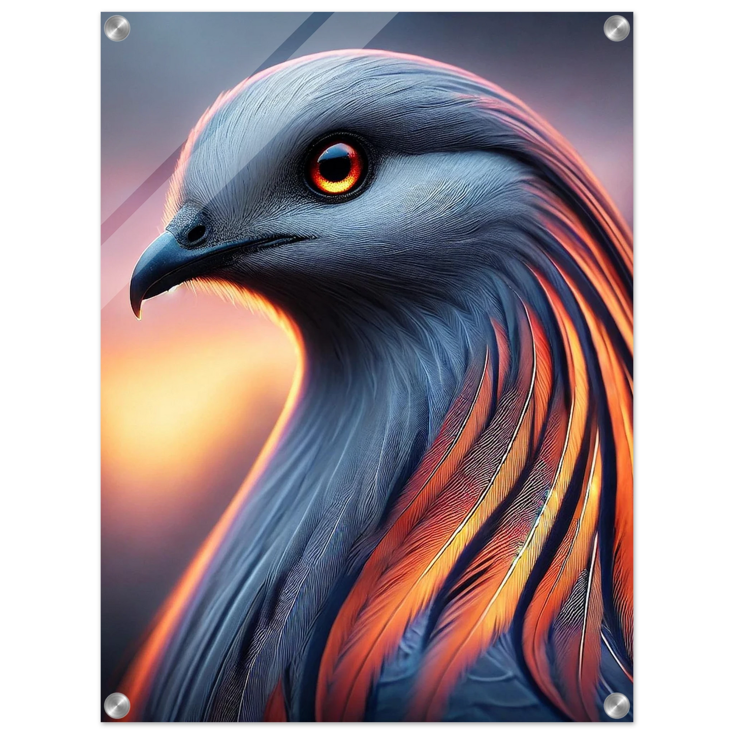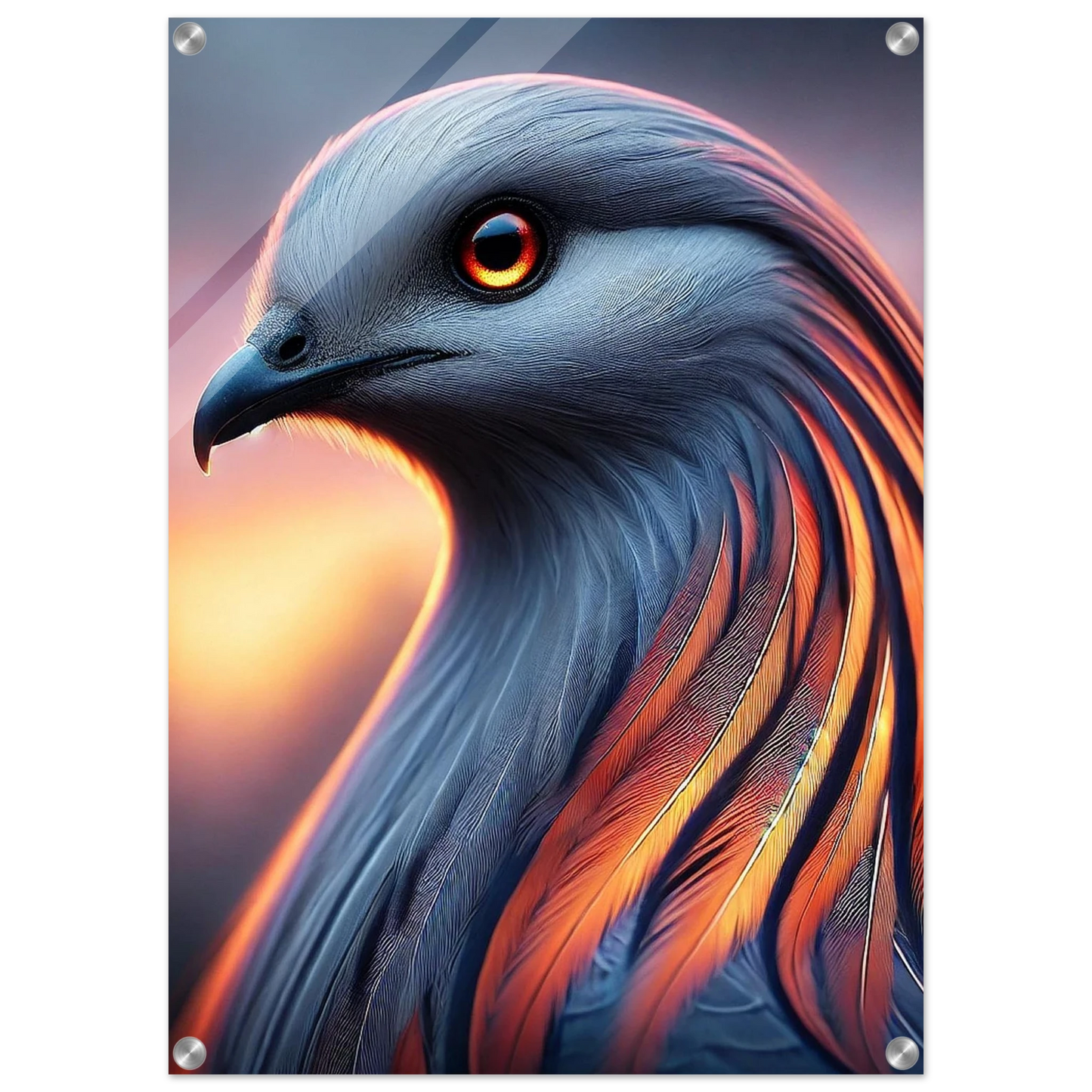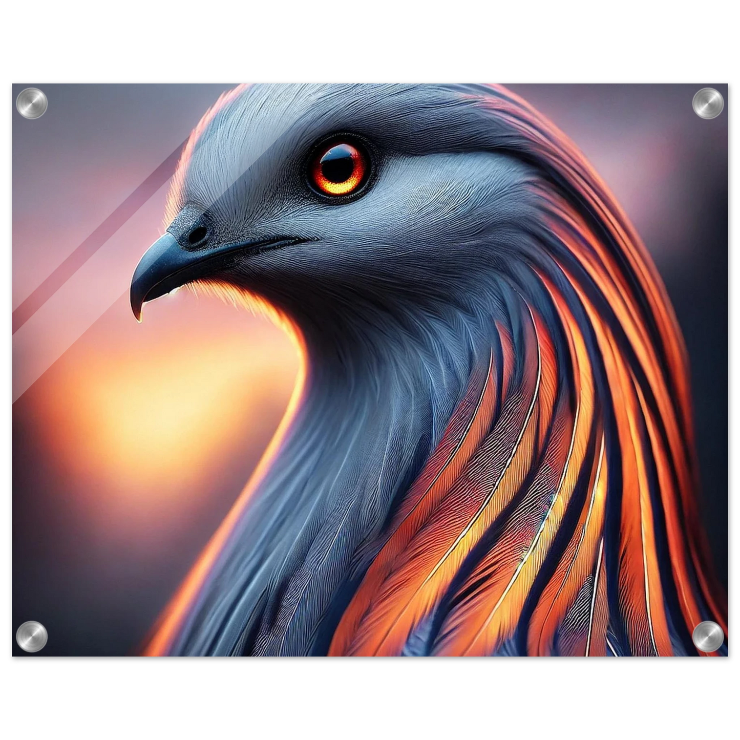 „Cendris“ – ein mystischer Bote aus Licht und Glut – entfaltet auf Acrylglas seine volle Strahlkraft. Seine kupfernen Federn leuchten intensiv, als würde das letzte Licht des Tages in ihnen brennen. Ein Werk, das innere Ruhe und kraftvolle Veränderung ausstrahlt – perfekt für Räume, die Tiefe und Ausdruck suchen.