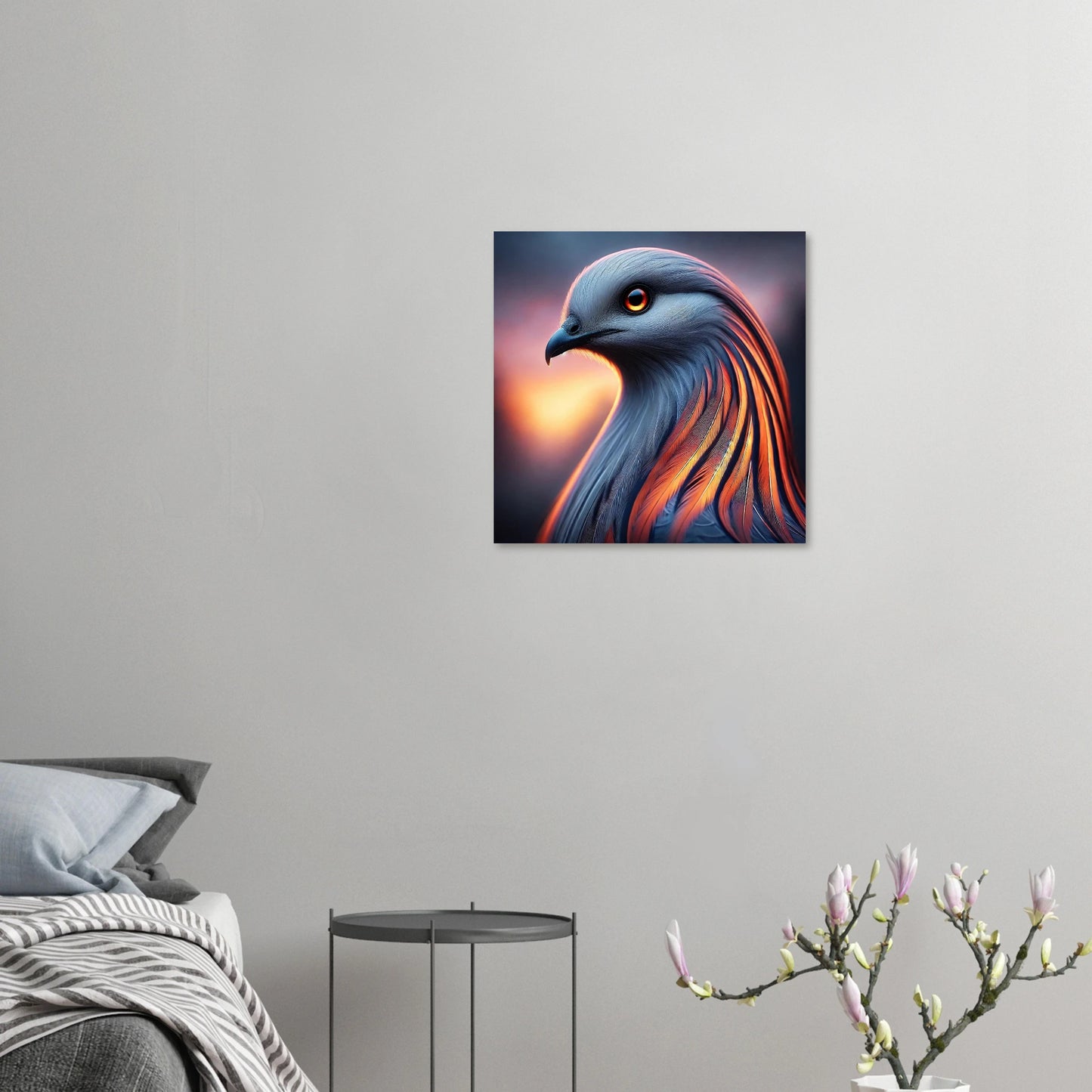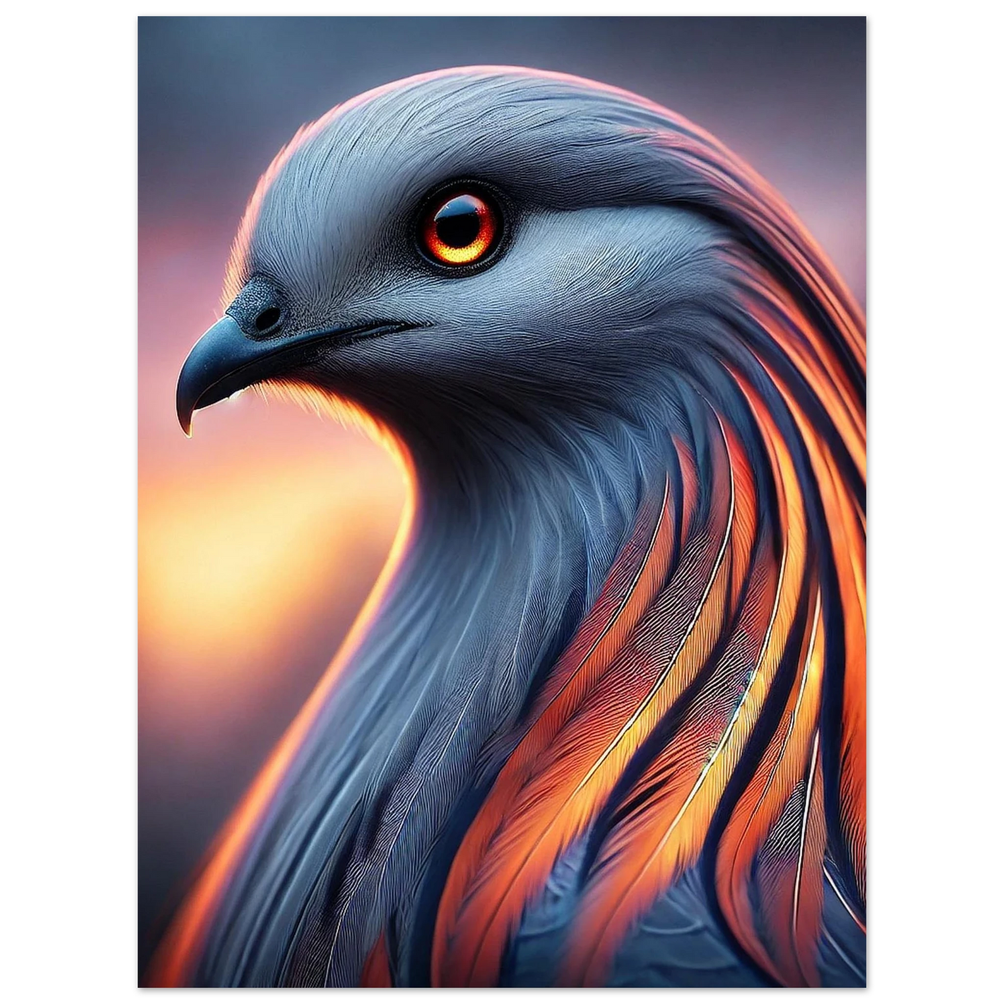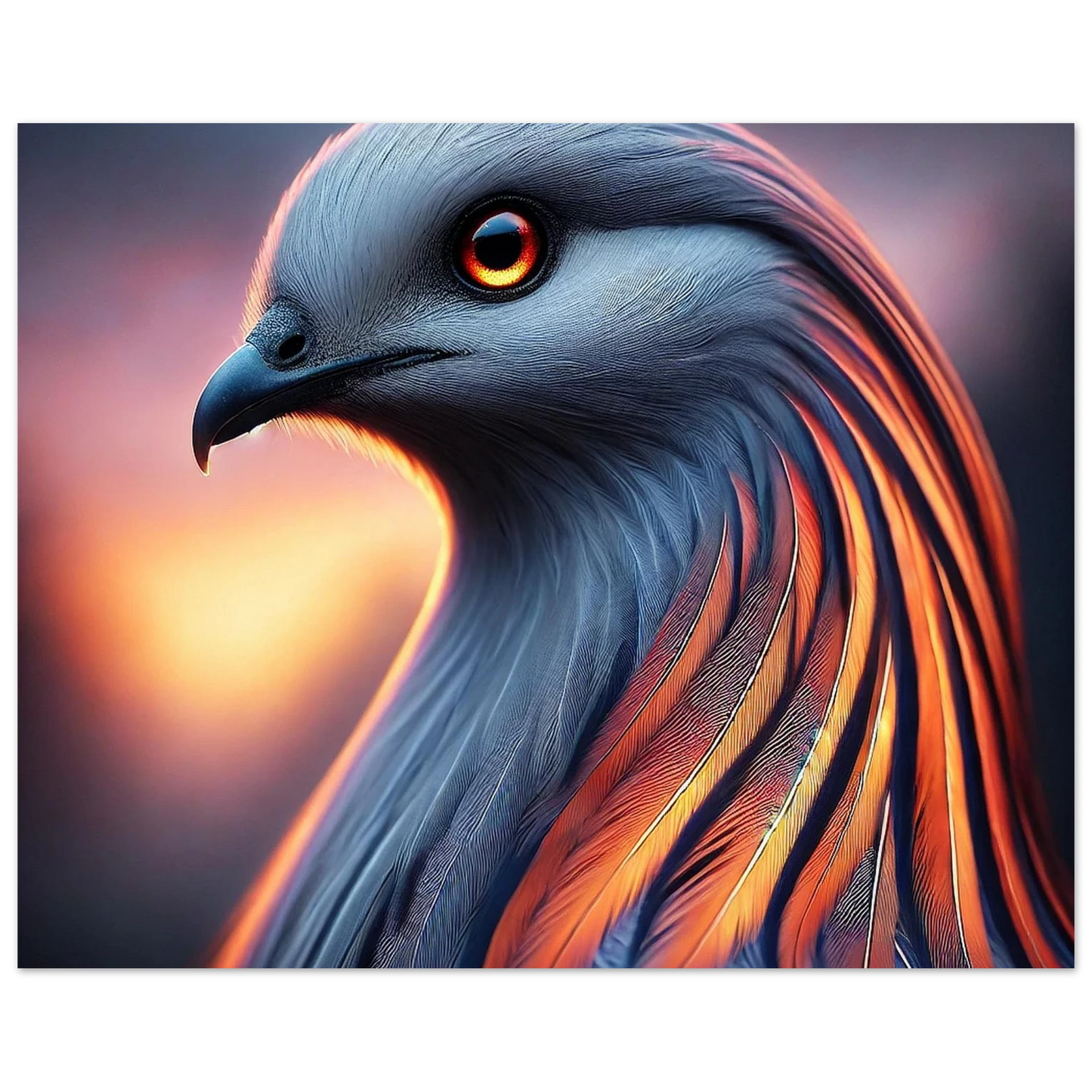 „Cendris“ verkörpert die Magie der Dämmerung – ein mystischer Fantasievogel mit glühendem Kupfer- und Feuerschimmer, dessen durchdringender Blick das letzte Licht des Tages einfängt. Er steht für Transformation, Stärke und inneren Frieden – ein visuell kraftvolles Kunstwerk für Menschen im Wandel.