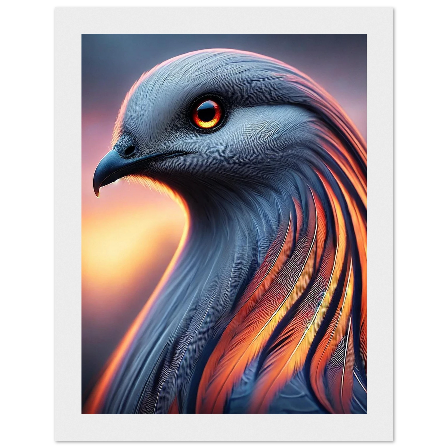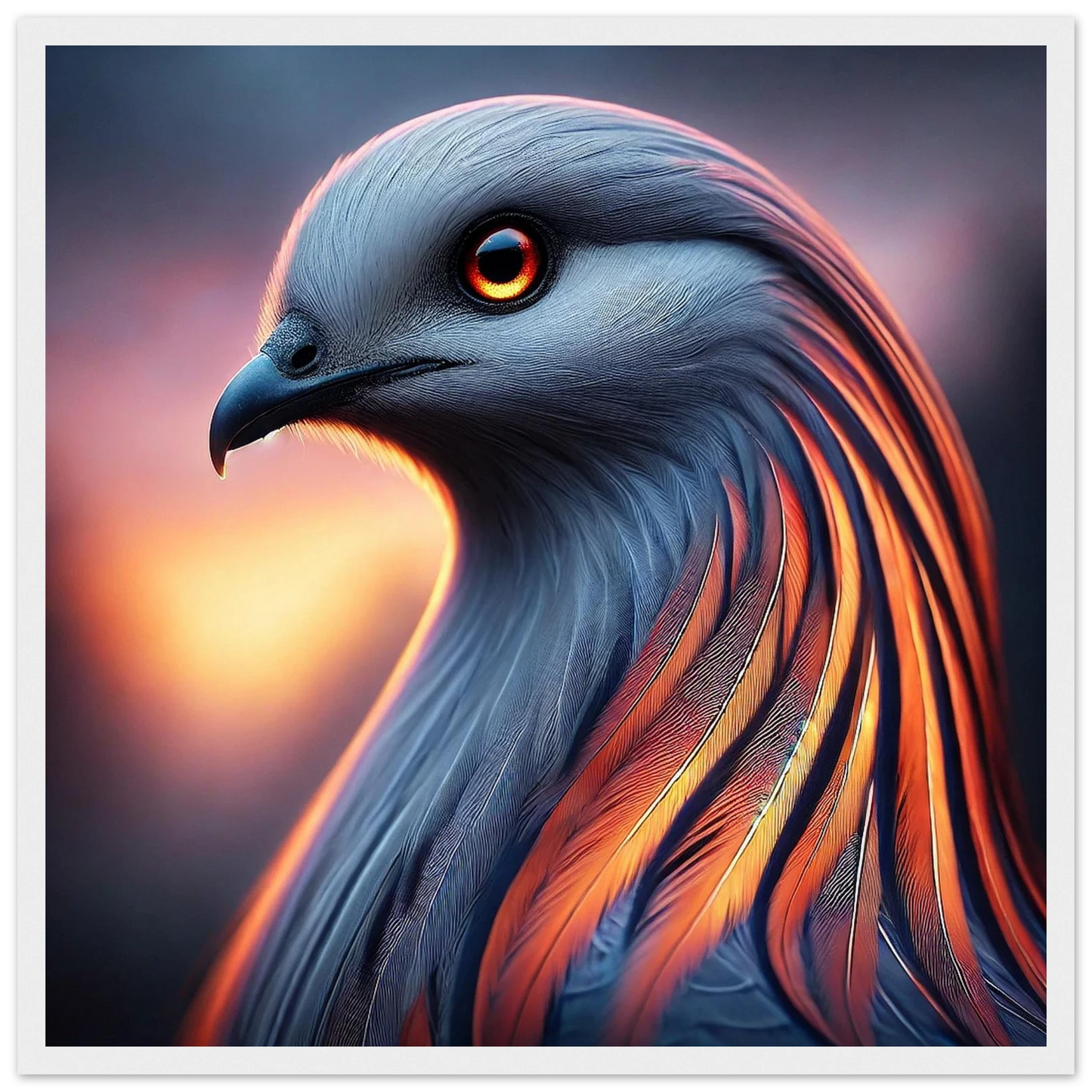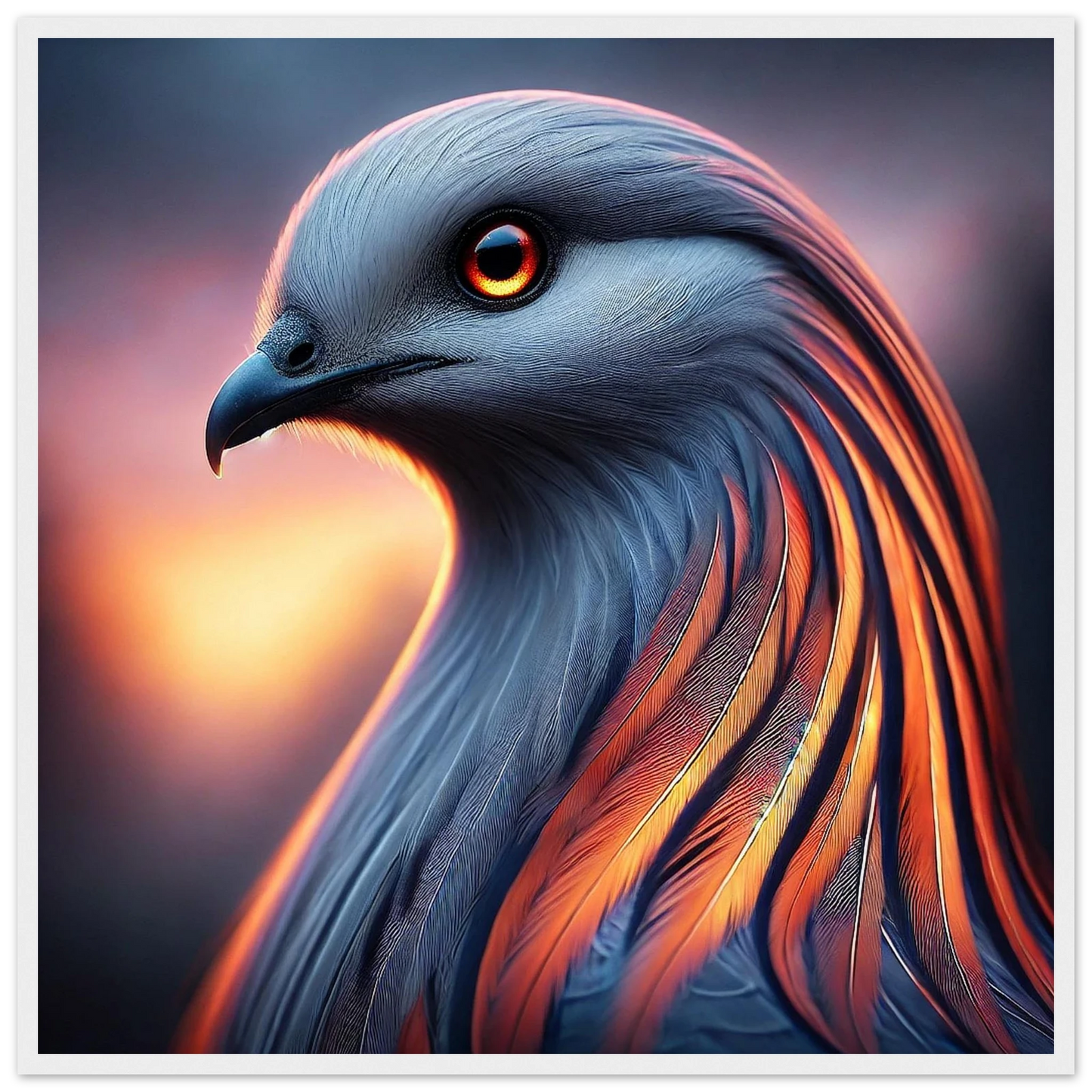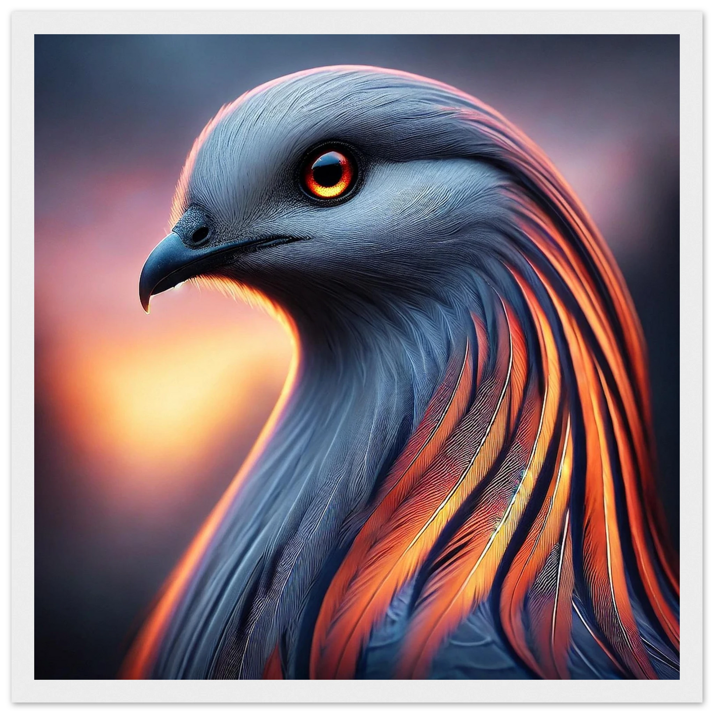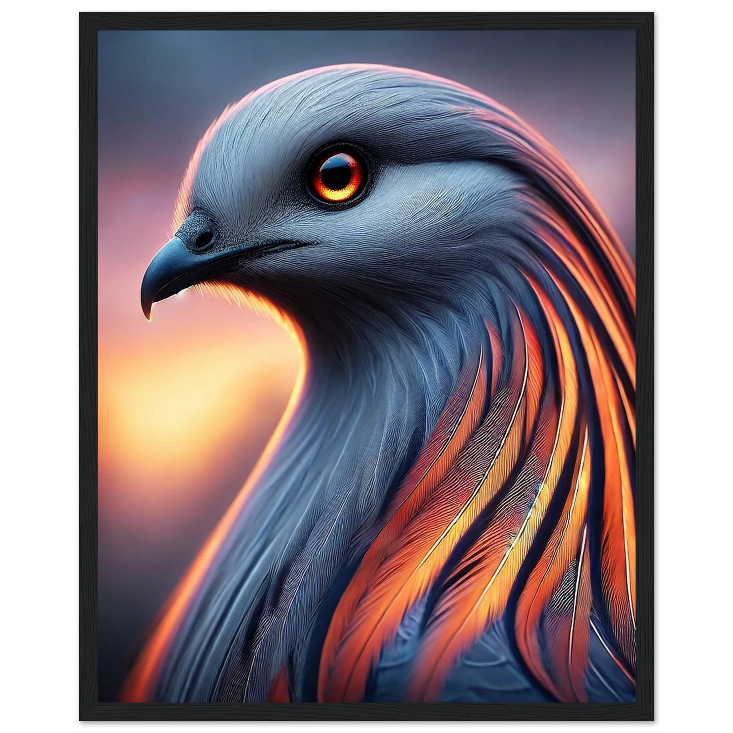 Tauche ein in die mystische Kraft der Dämmerung: „Cendris“ ist ein majestätischer Fantasievogel mit feurigem, metallisch schimmerndem Gefieder – ein Hüter des Übergangs zwischen Licht und Schatten. Mit seinem durchdringenden Blick und seiner kraftvollen Aura bringt dieses Kunstwerk Stärke, Ruhe und spirituelle Tiefe an jede Wand.