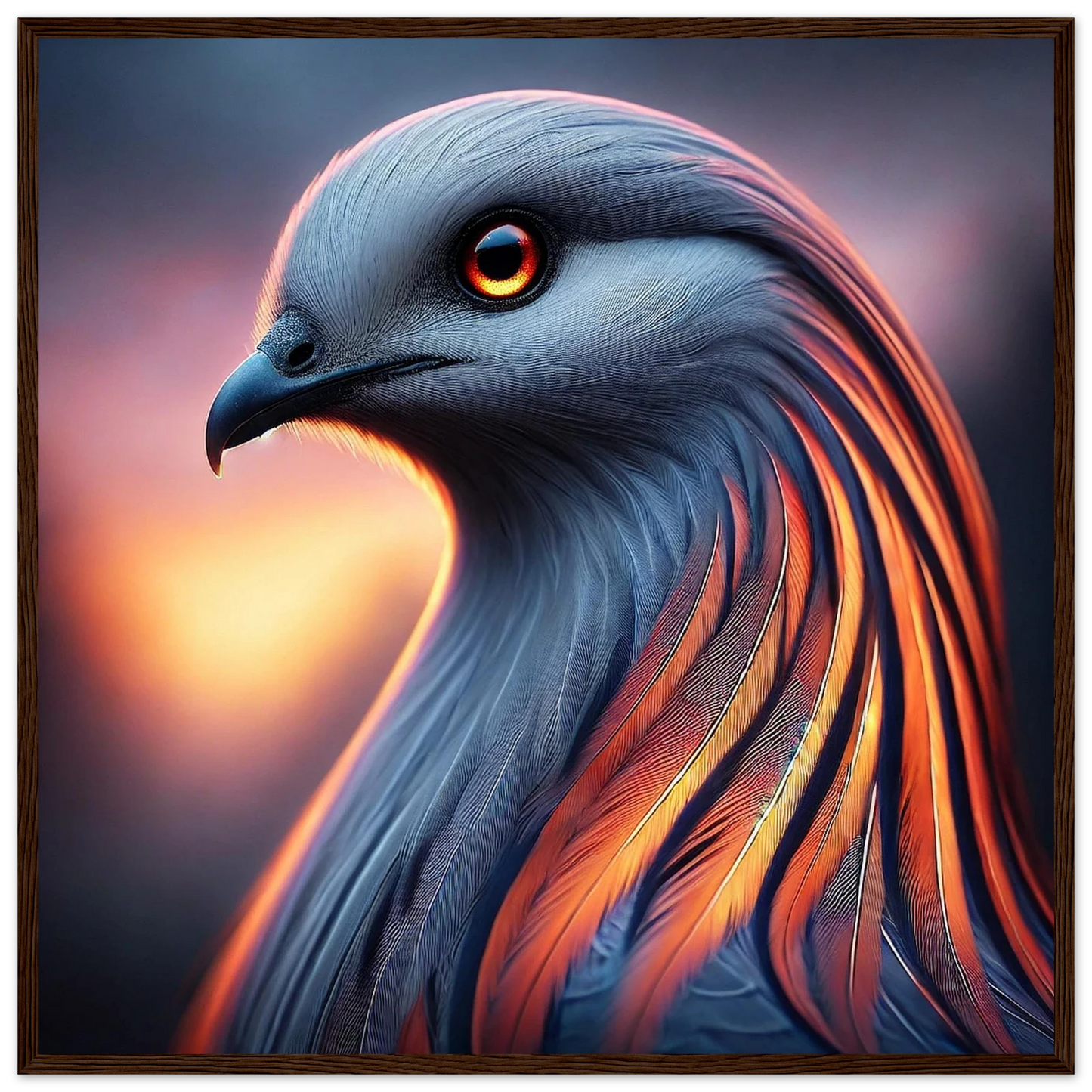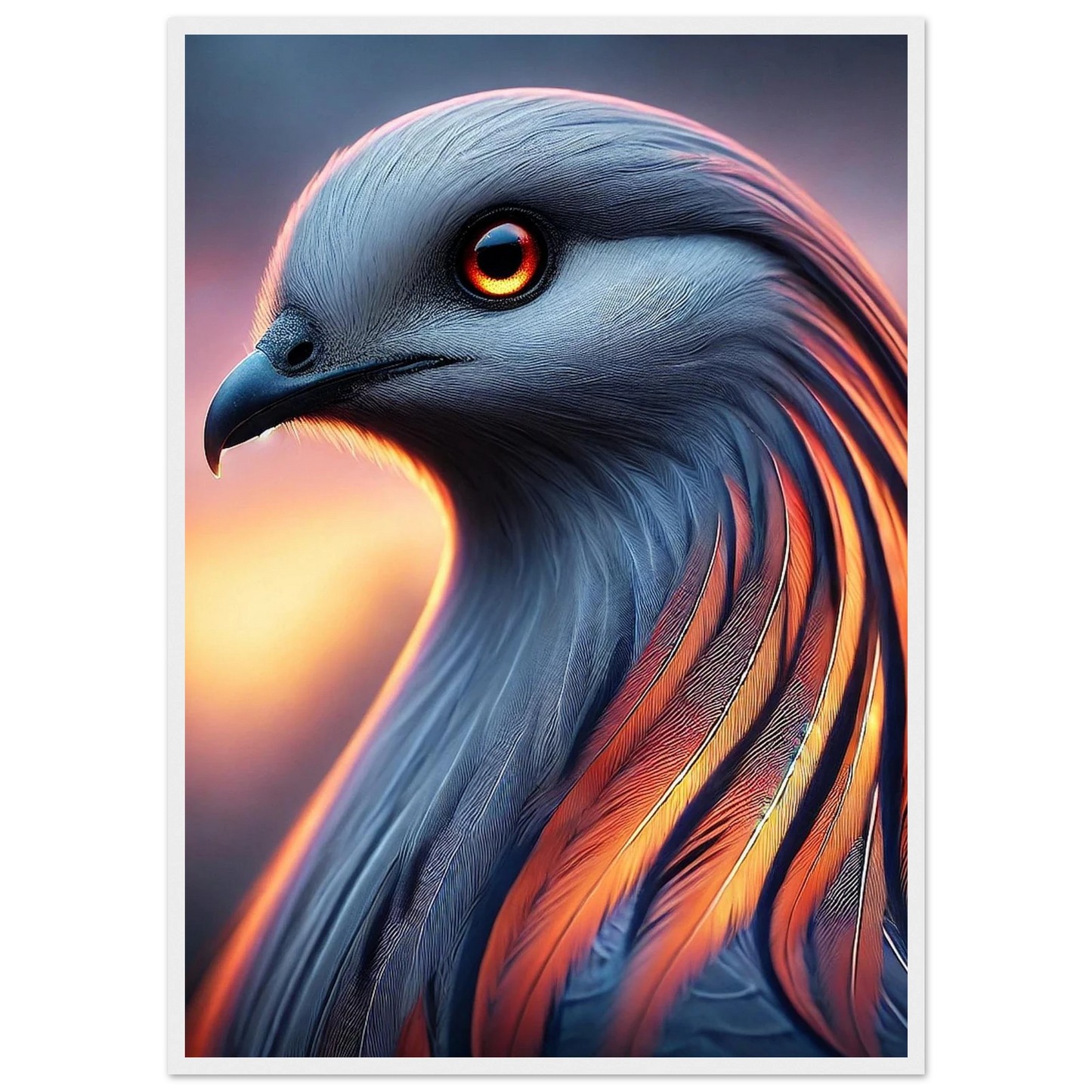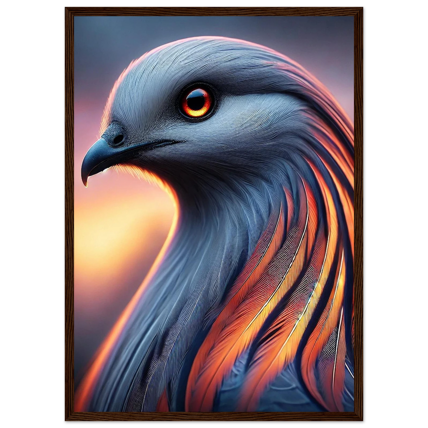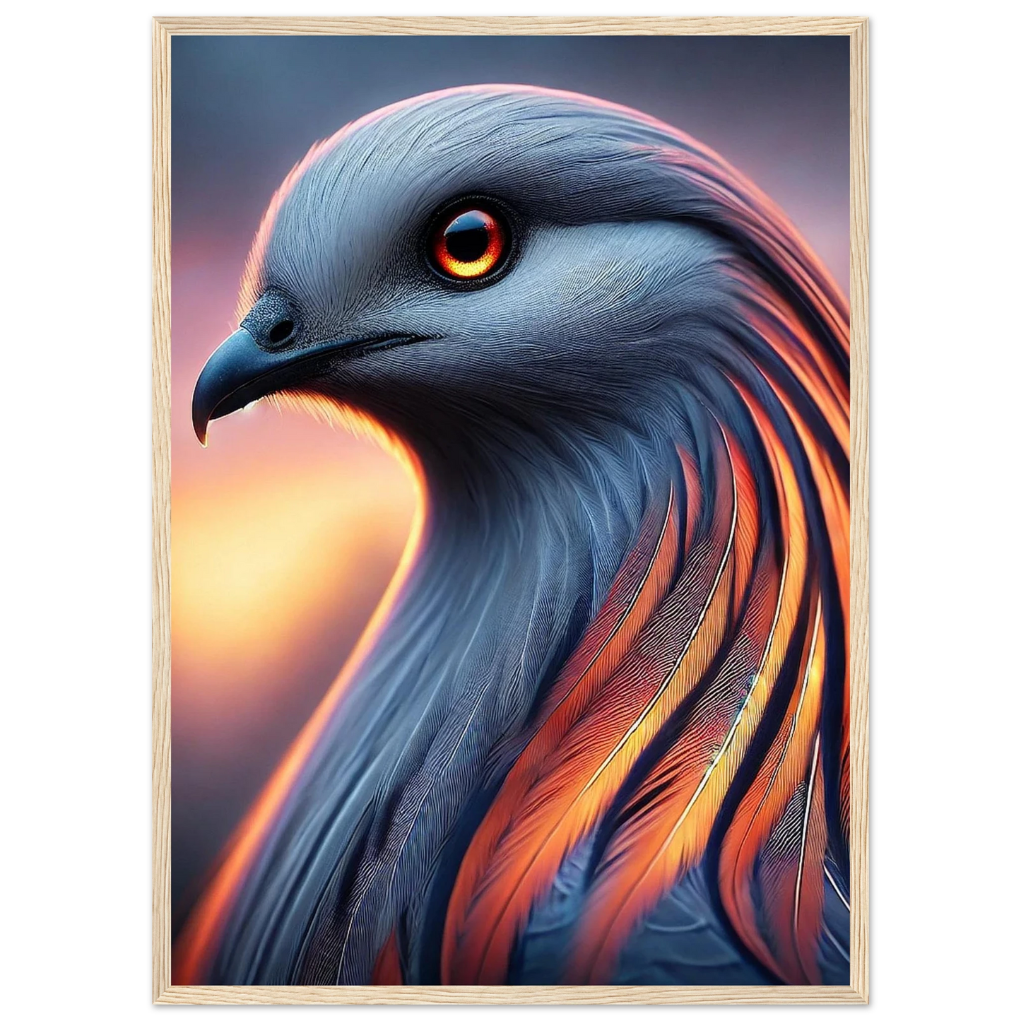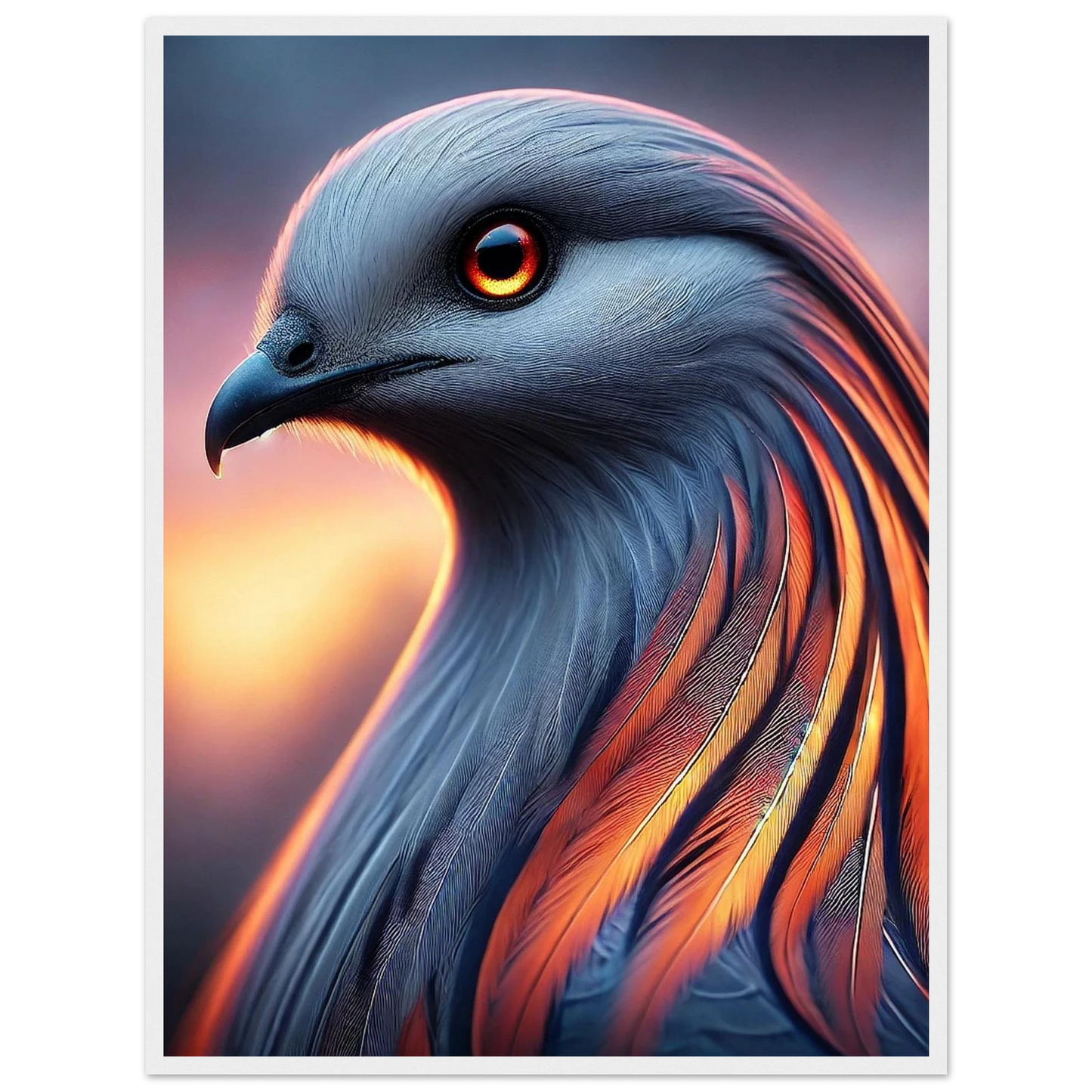 Tauche ein in die mystische Kraft der Dämmerung: „Cendris“ ist ein majestätischer Fantasievogel mit feurigem, metallisch schimmerndem Gefieder – ein Hüter des Übergangs zwischen Licht und Schatten. Mit seinem durchdringenden Blick und seiner kraftvollen Aura bringt dieses Kunstwerk Stärke, Ruhe und spirituelle Tiefe an jede Wand.