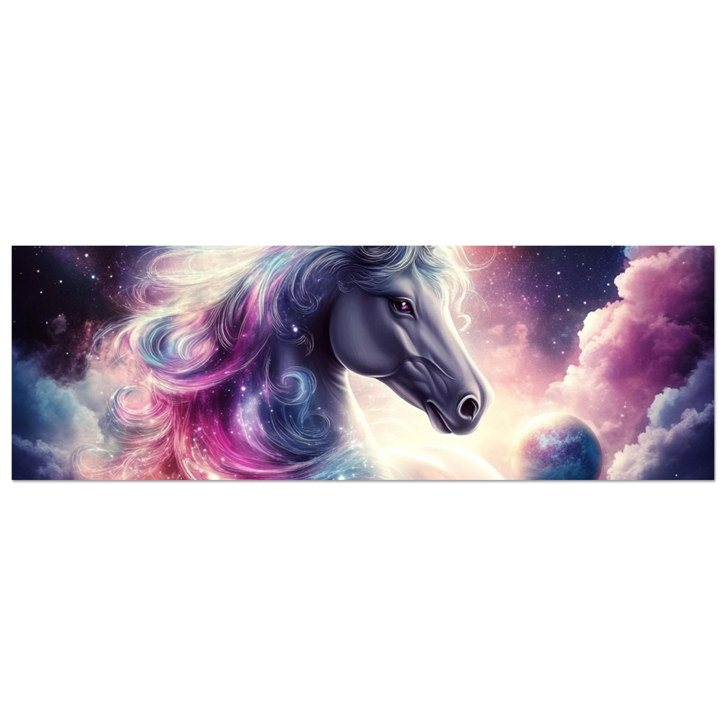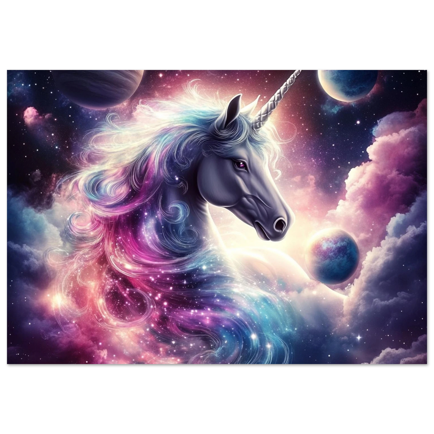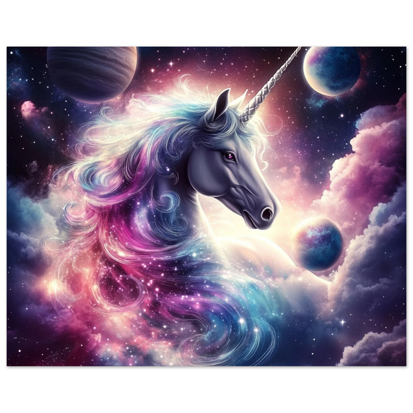 „Cosmara“ ist das Einhorn des Kosmos – ein magisches Wesen, geboren aus Sternennebeln und Licht. Ihr Schweif leuchtet wie ein galaktischer Nebel, ihr Blick spiegelt ferne Welten. Dieses Kunstwerk bringt eine zauberhafte Verbindung aus Mystik, Farbe und universeller Weisheit in dein Zuhause.