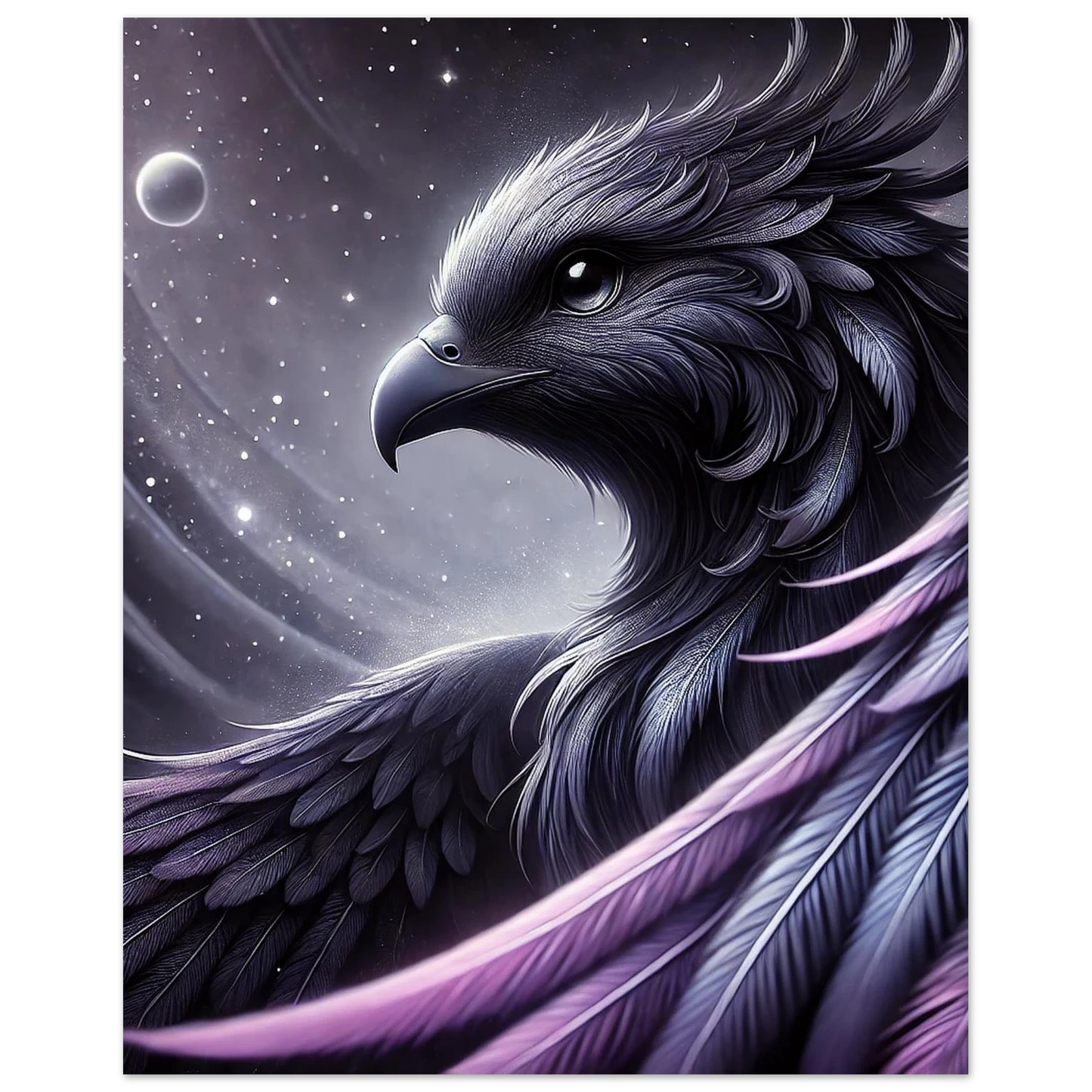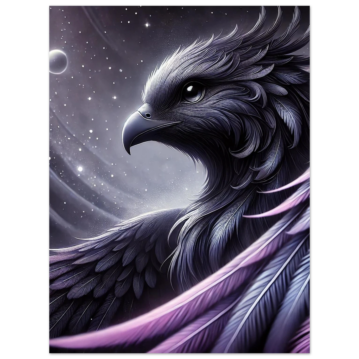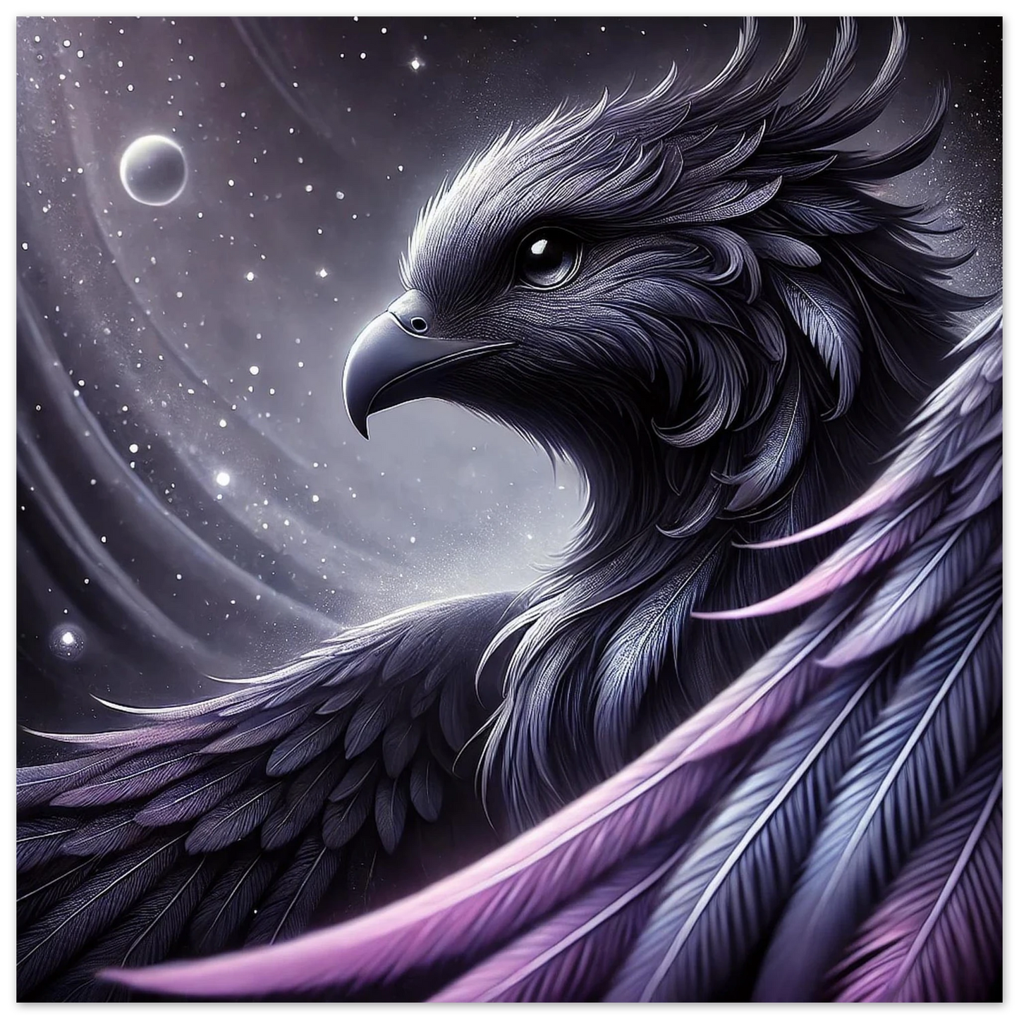 „Eclipsar“ – ein geheimnisvolles Wesen aus dem Herzen des Universums. Mit schimmernden, violett-schwarzen Federn gleitet er durch die Leere des Alls. Geboren aus einer Sonnenfinsternis und dunkler Materie, symbolisiert er Wandel, Weisheit und das kosmische Gleichgewicht. Wer seinen Schatten sieht, erfährt keinen Abschied – sondern einen Neubeginn.