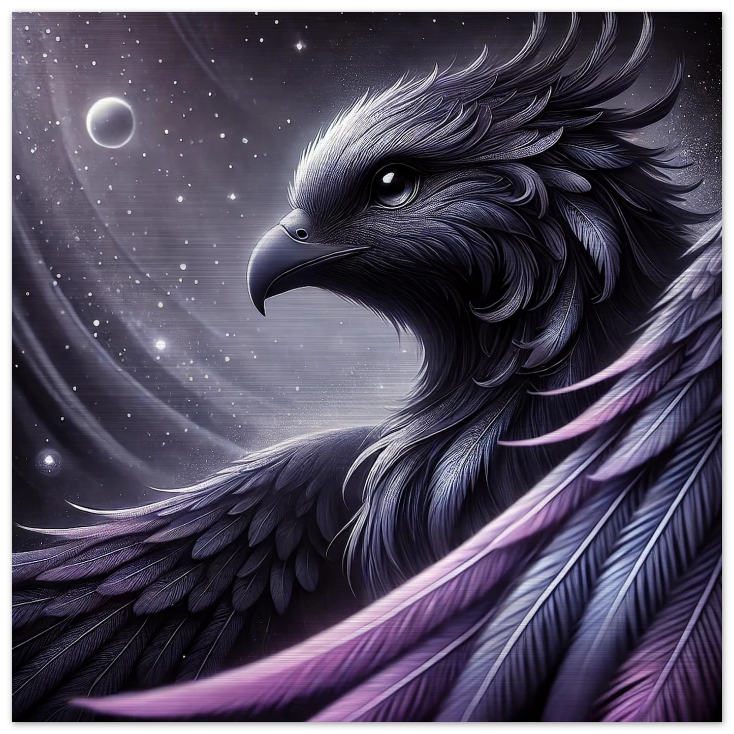 „Eclipsar“ ist ein majestätischer Himmelsbote aus dunkler Materie und Sternenstaub. Seine schimmernden, violett-schwarzen Federn durchdringen lautlos die Galaxien. Entstanden aus einer Sonnenfinsternis und dem ersten Flügelschlag kosmischer Dunkelheit, wacht er als stiller Hüter über Gleichgewicht und Wandel. Wenn sein Schatten dich berührt, beginnt etwas Neues.