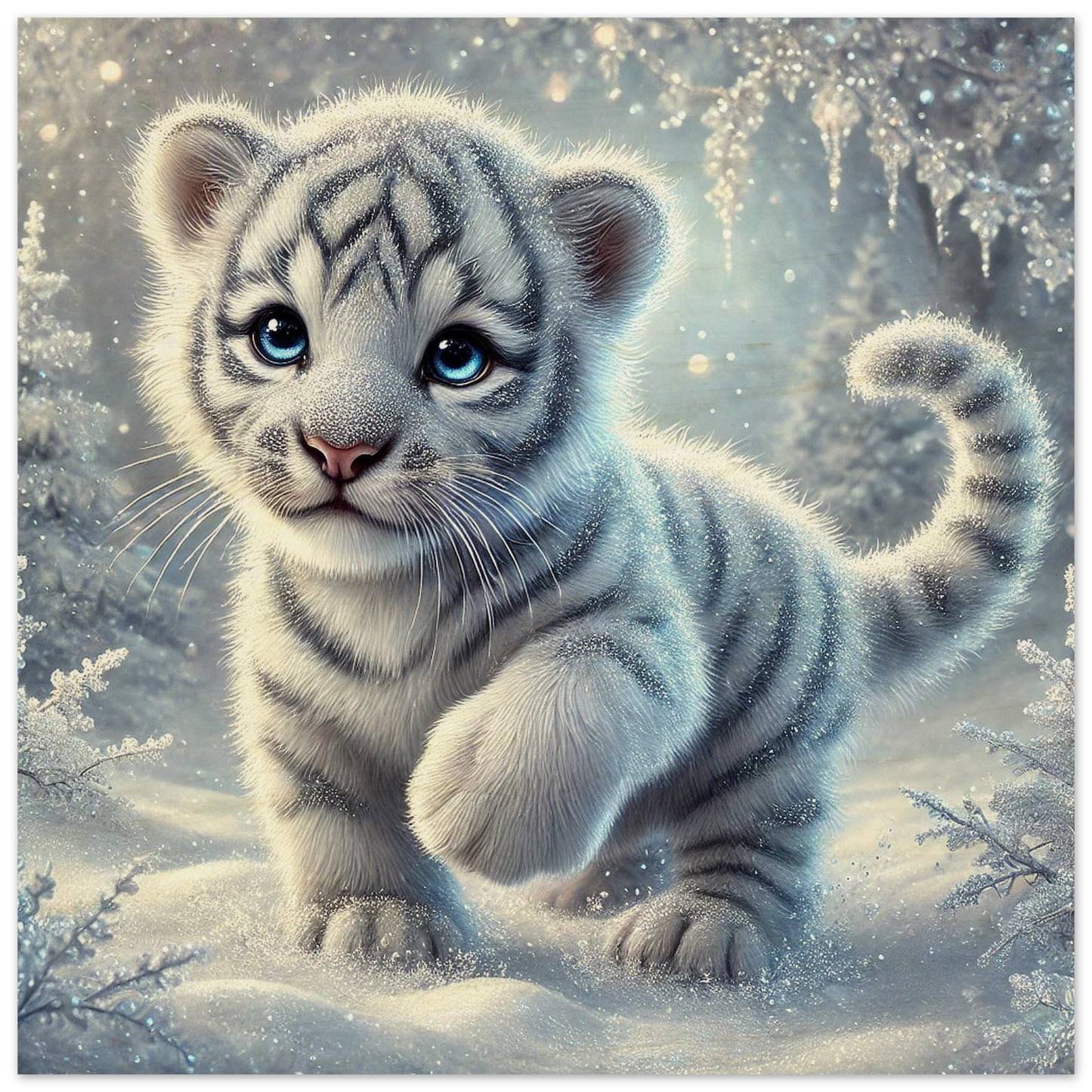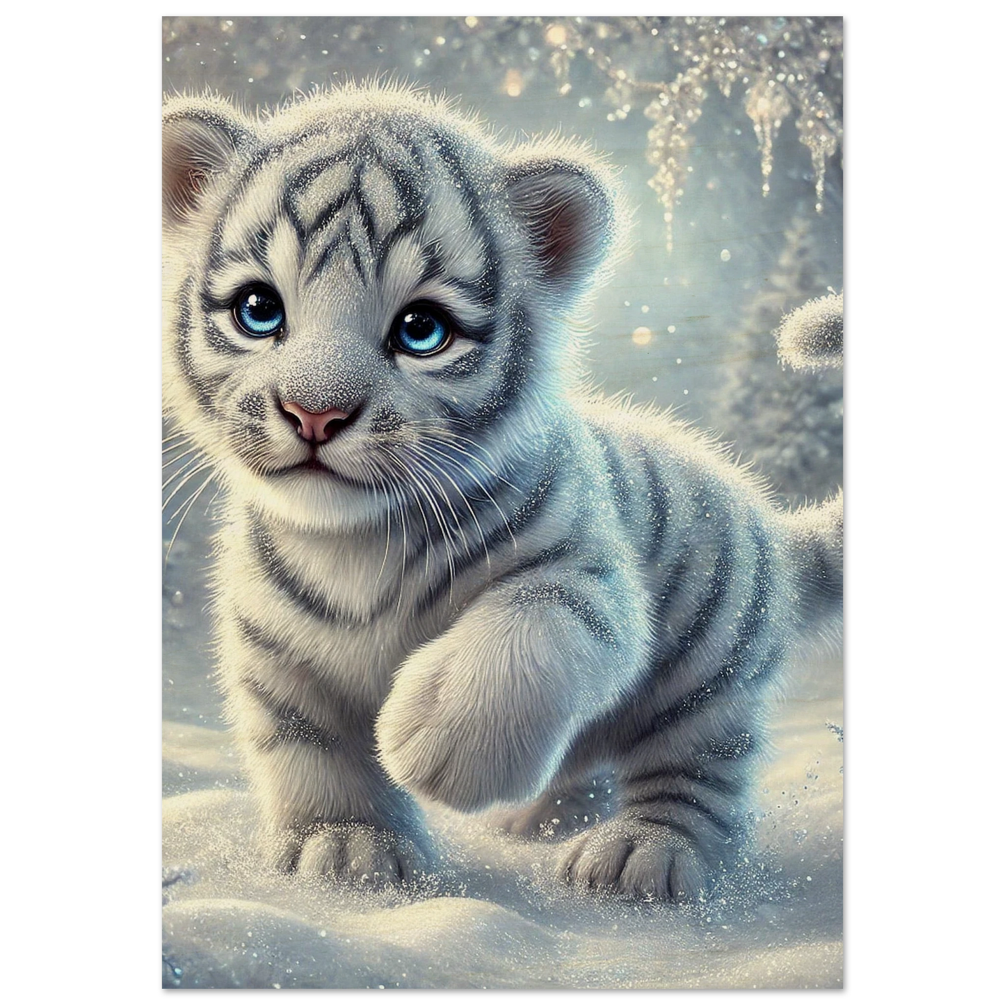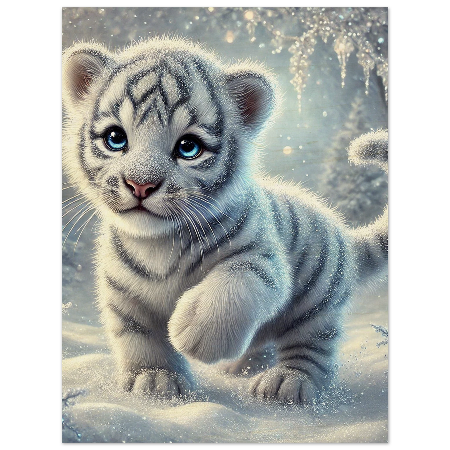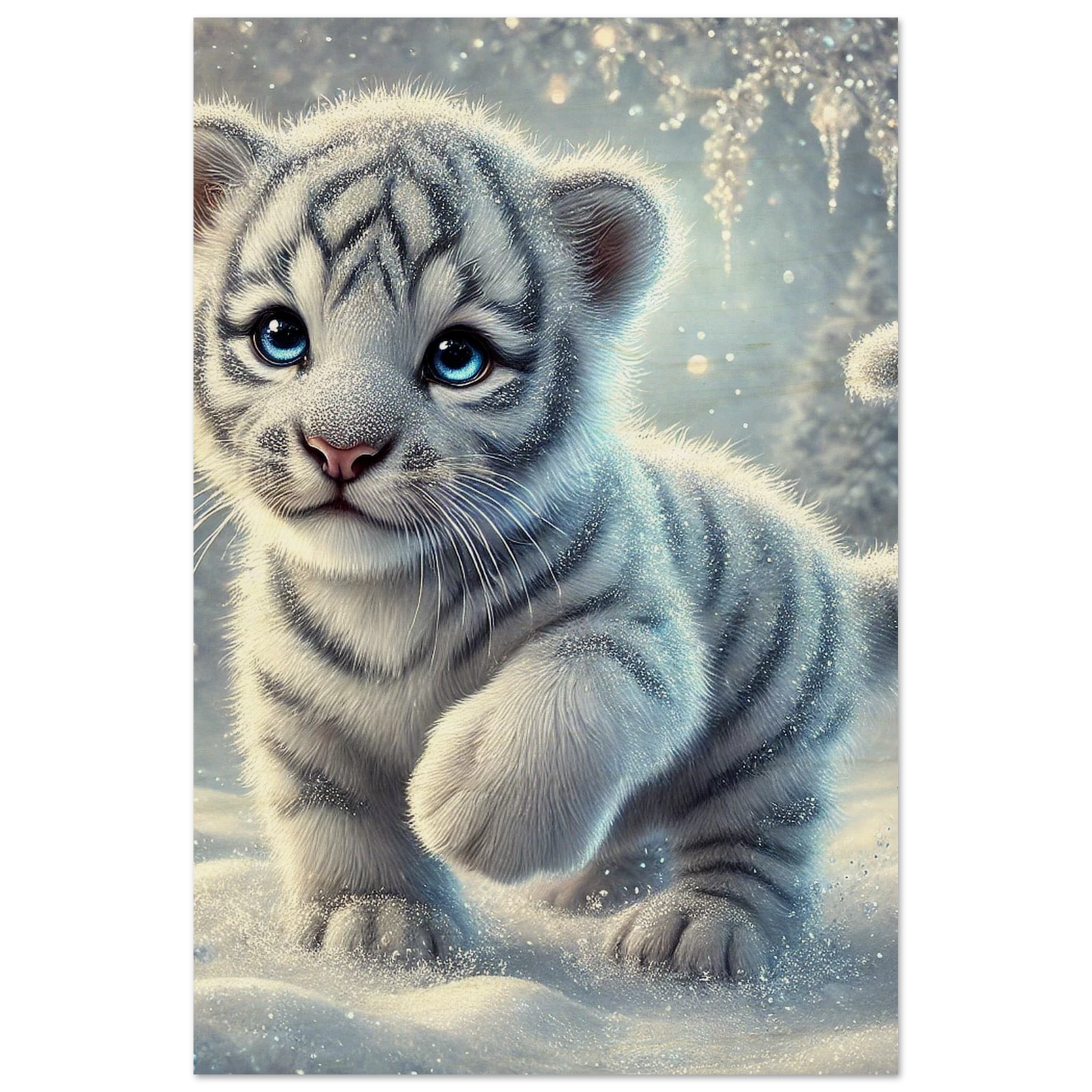 Zart, verspielt und voller Hoffnung – Eira ist ein kleines Tigerjunge, geboren unter den tanzenden Polarlichtern. Ihr weißes Fell und ihre blauen Augen bringen Licht selbst in die dunkelsten Wintertage. Sie steht für neue Anfänge, kindliche Reinheit und stille Stärke.