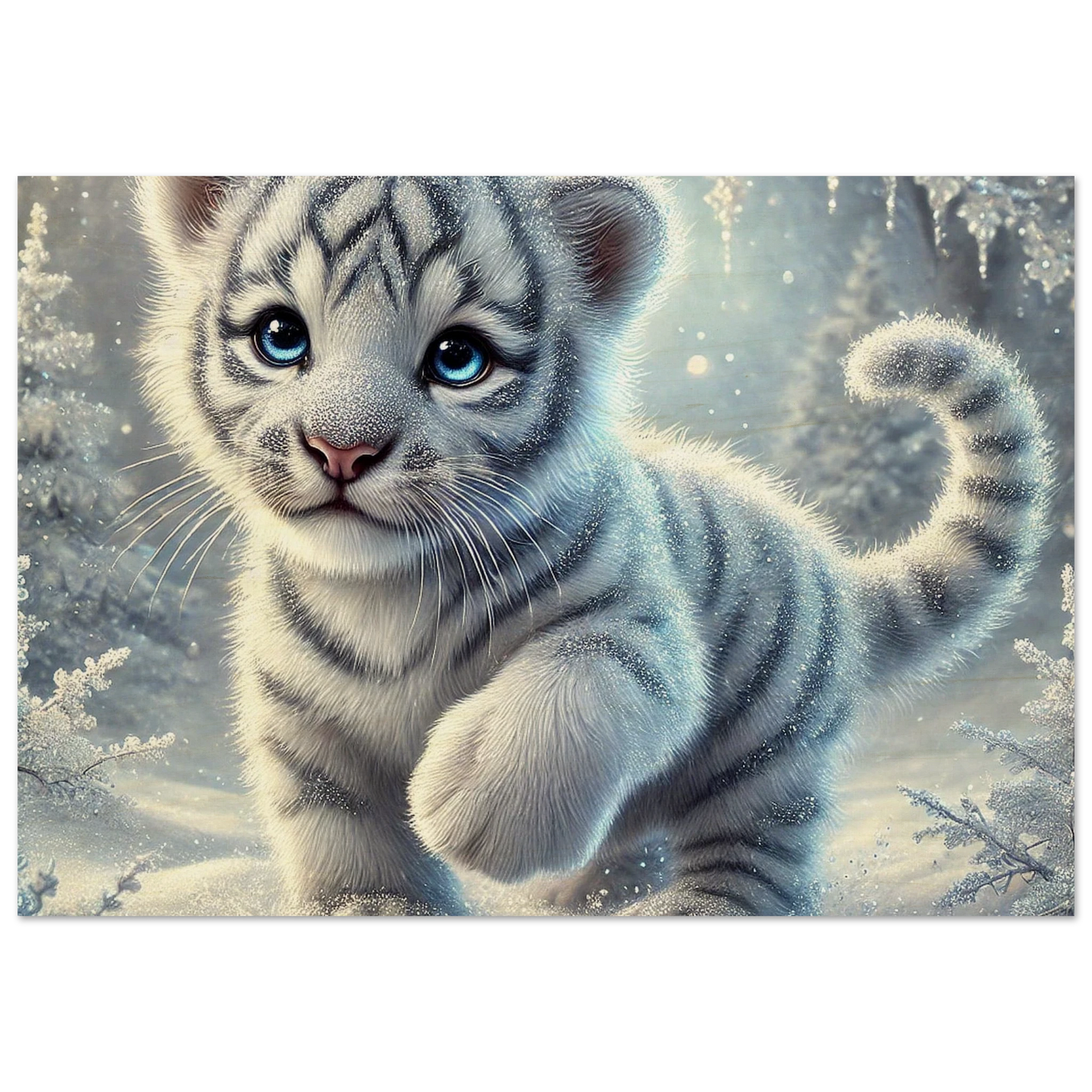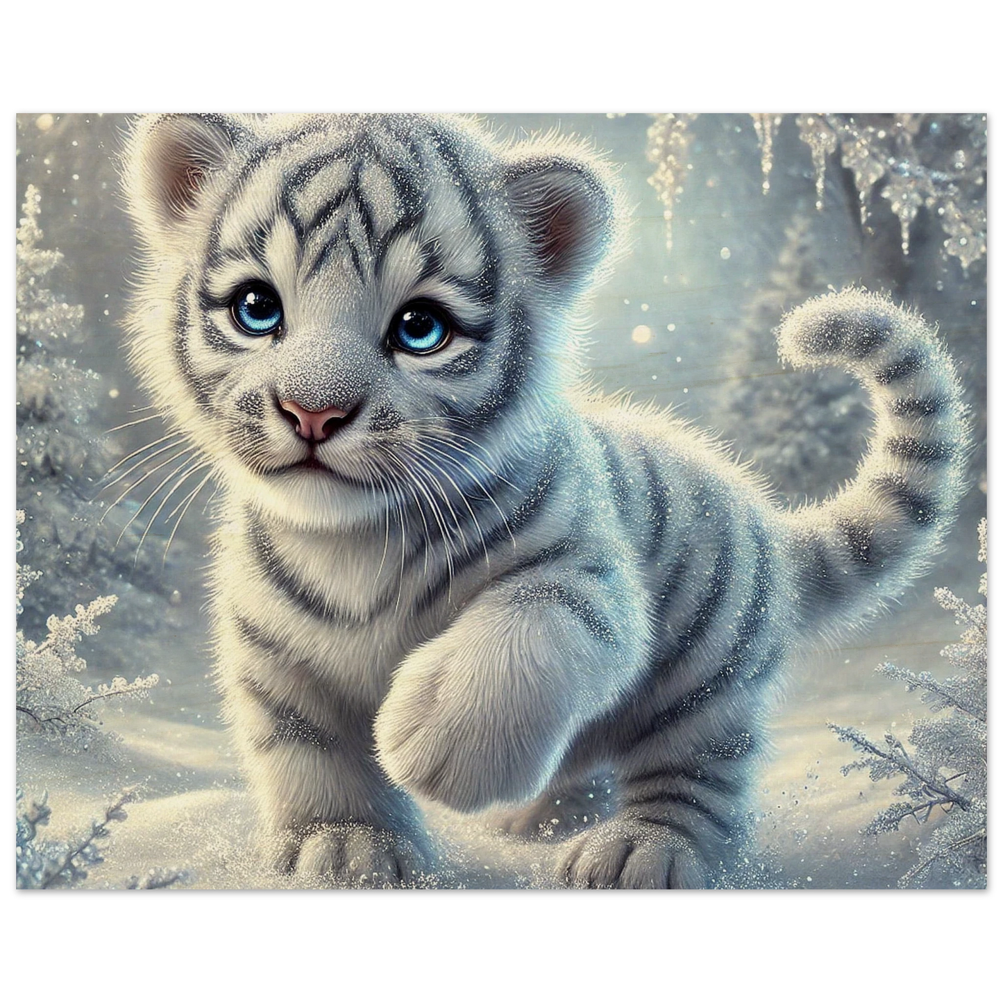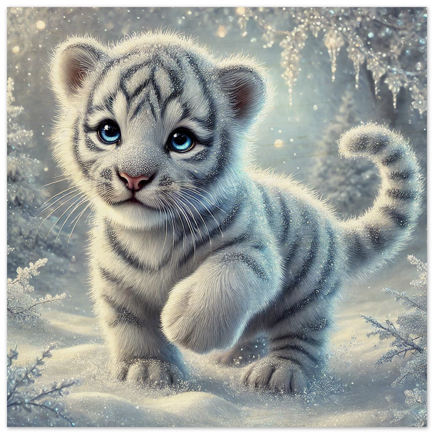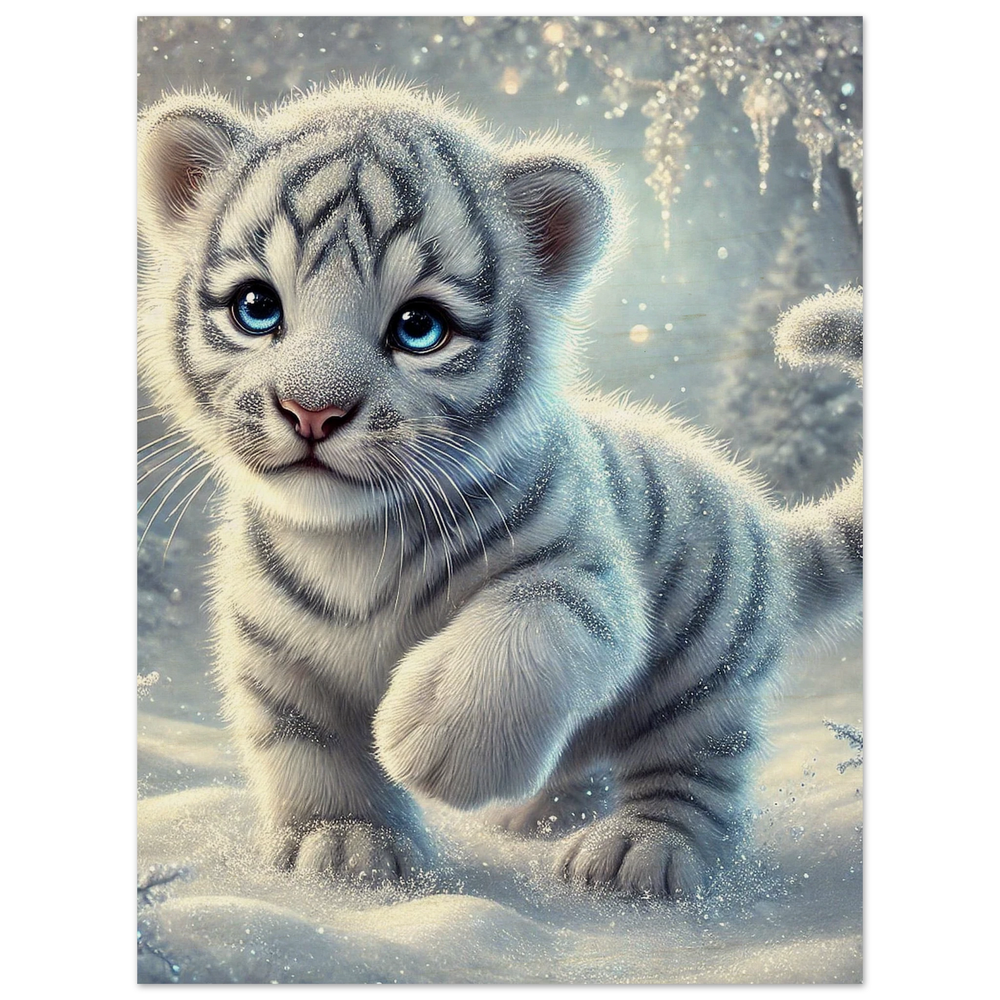 Zart, verspielt und voller Hoffnung – Eira ist ein kleines Tigerjunge, geboren unter den tanzenden Polarlichtern. Ihr weißes Fell und ihre blauen Augen bringen Licht selbst in die dunkelsten Wintertage. Sie steht für neue Anfänge, kindliche Reinheit und stille Stärke.