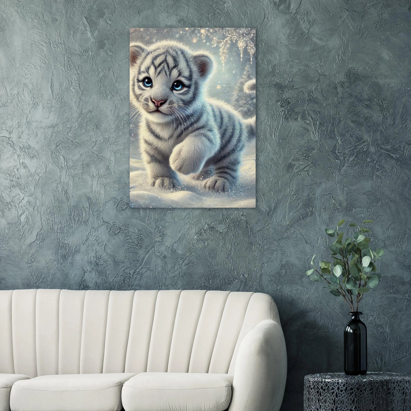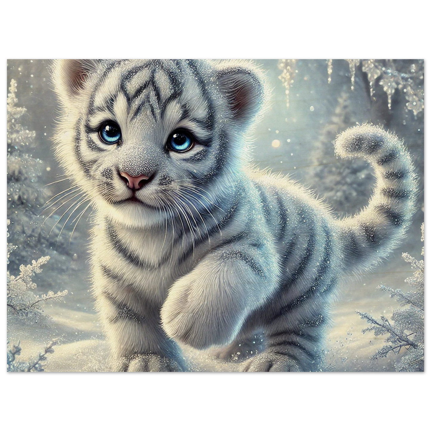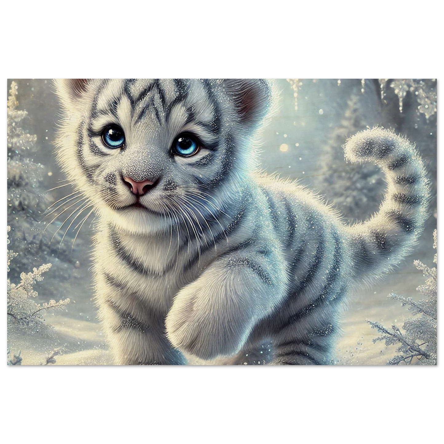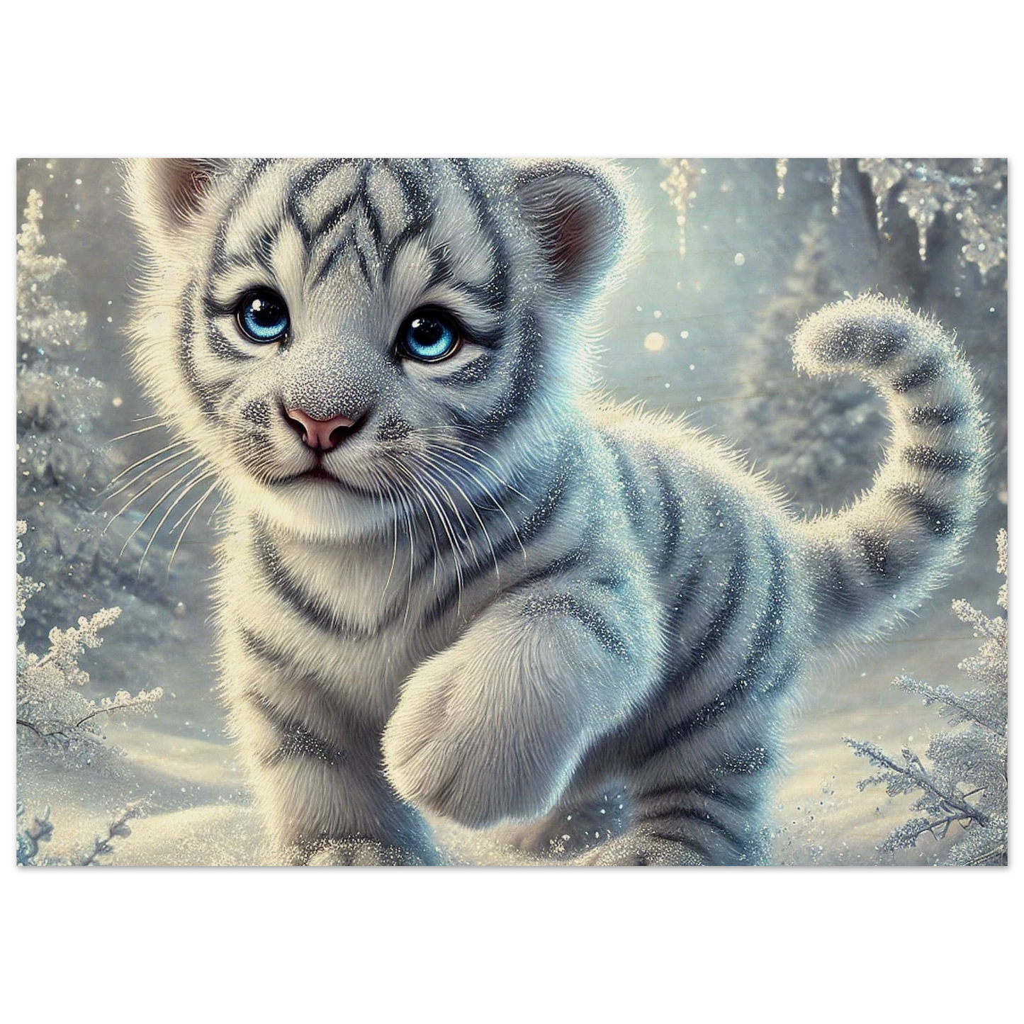 Zart, verspielt und voller Hoffnung – Eira ist ein kleines Tigerjunge, geboren unter den tanzenden Polarlichtern. Ihr weißes Fell und ihre blauen Augen bringen Licht selbst in die dunkelsten Wintertage. Sie steht für neue Anfänge, kindliche Reinheit und stille Stärke.