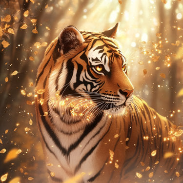 Elyros ist ein majestätischer Tiger, der durch die goldenen Wälder des ewigen Herbstes streift. Umgeben von fallenden Blättern und warmem Licht verkörpert er Stärke, Anmut und tiefe Weisheit – ein Wesen zwischen Natur und Legende.