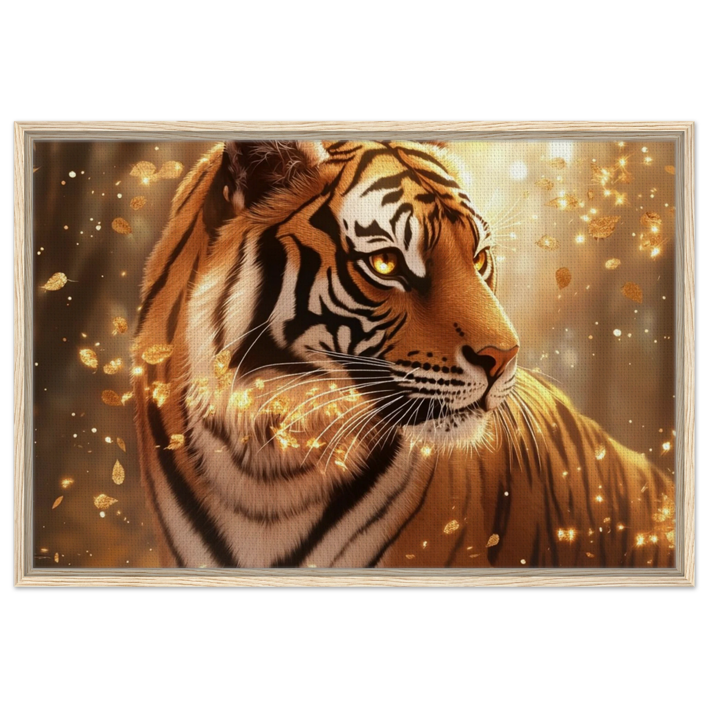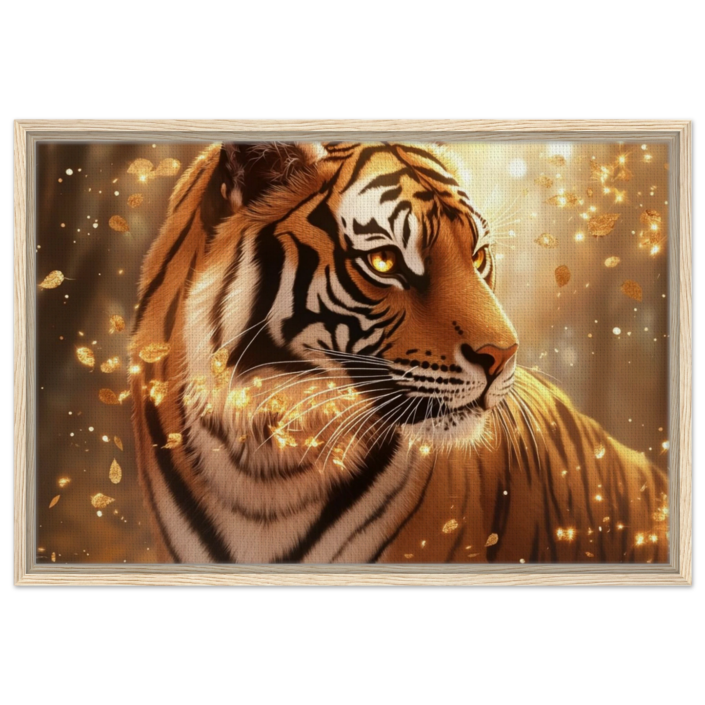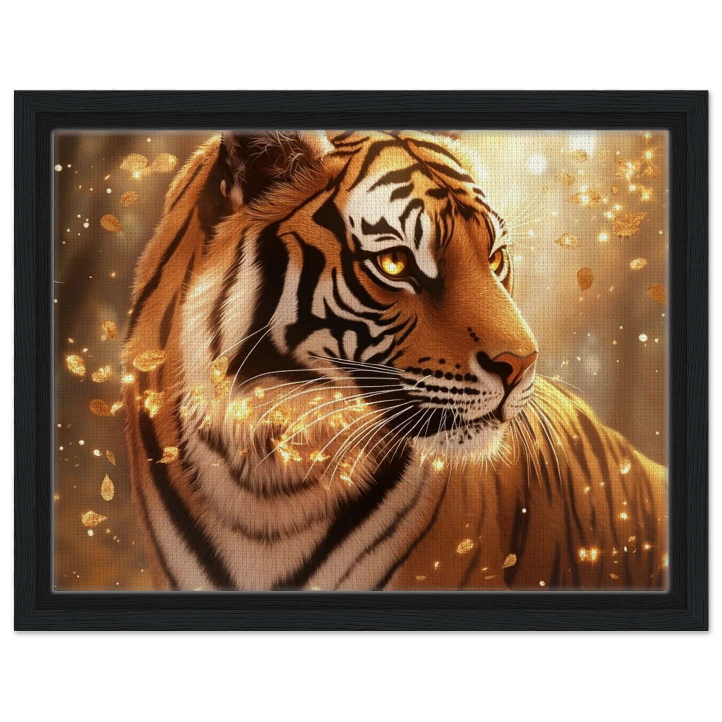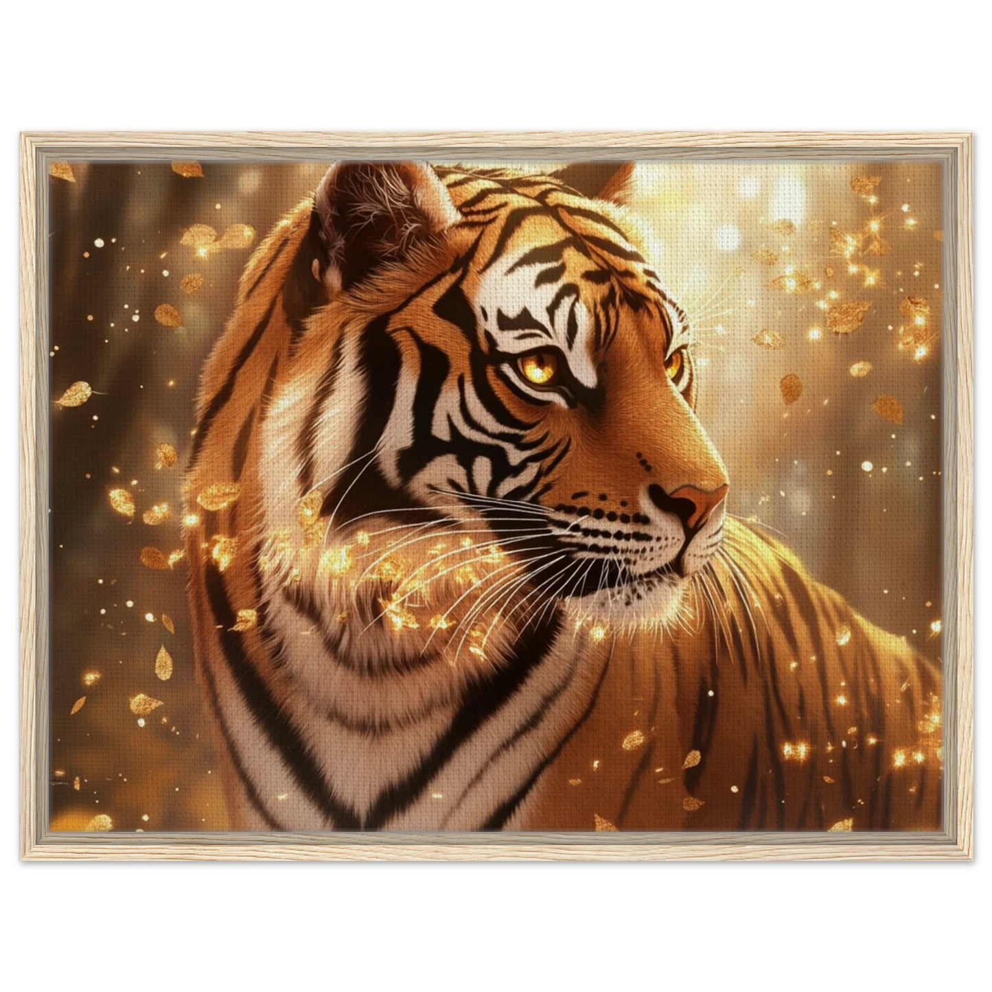 Der strukturierte Leinwanddruck in edler Rahmenfassung betont jedes Detail – von seinem majestätischen Blick bis zum goldenen Schimmer des Waldes.