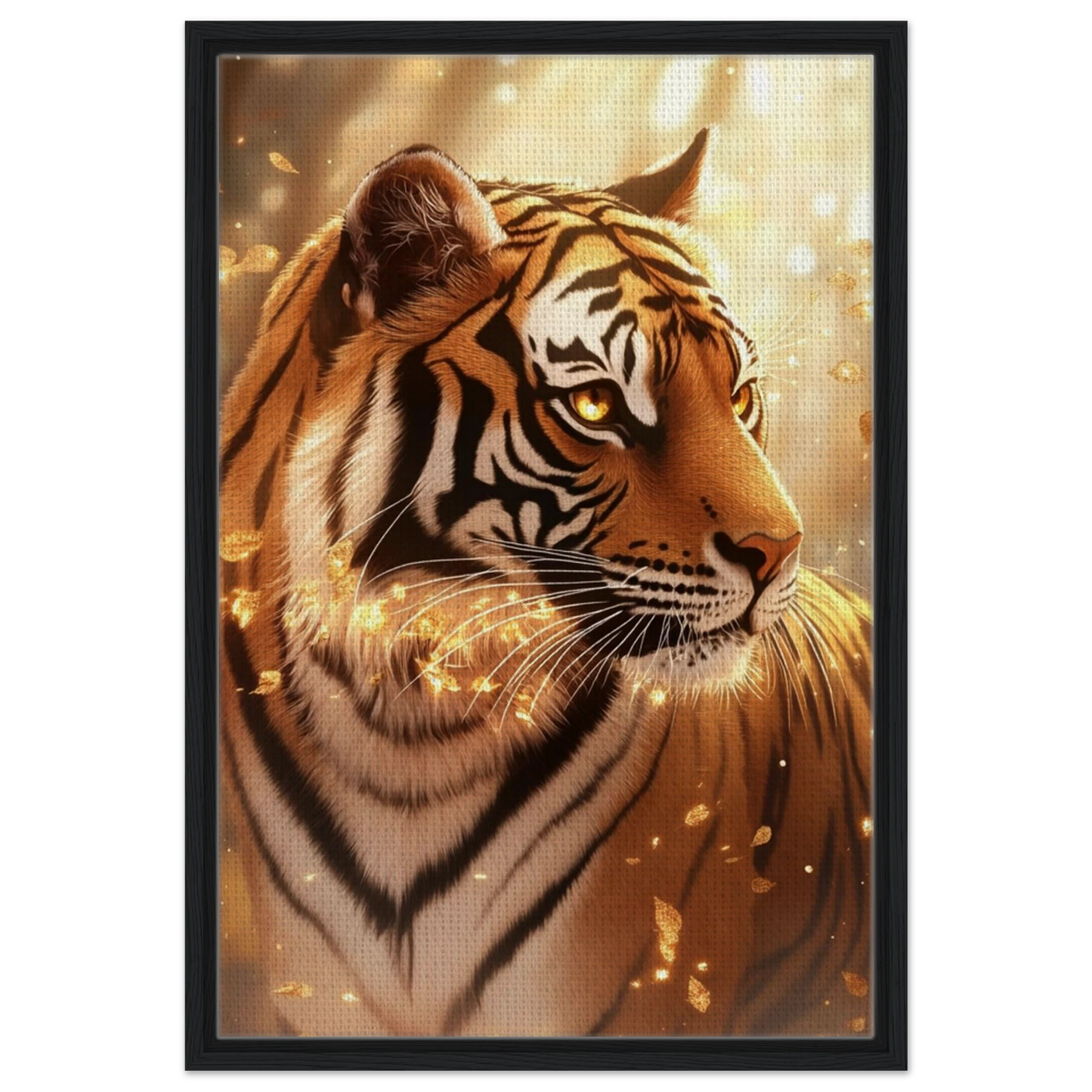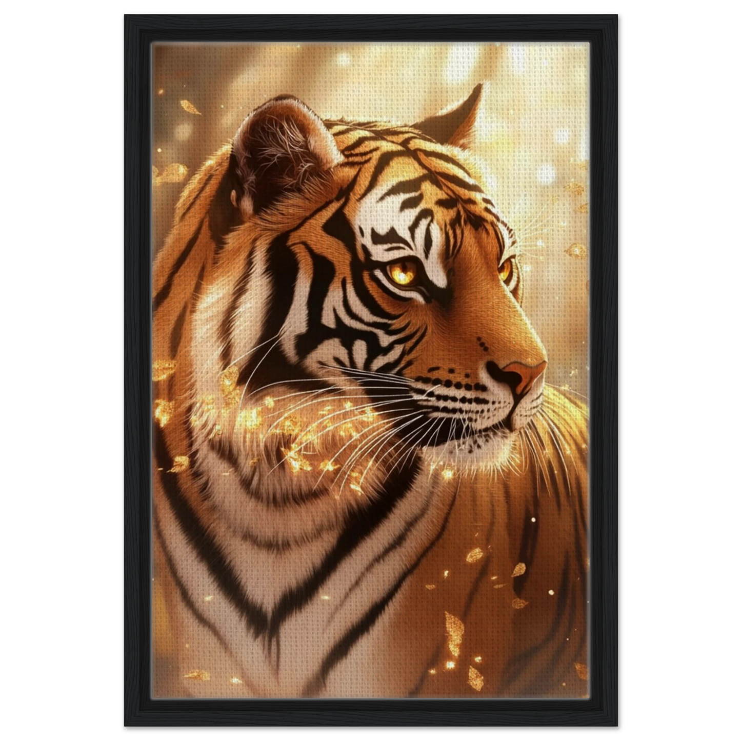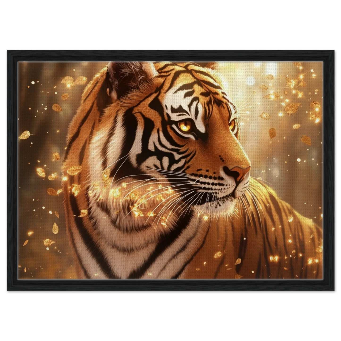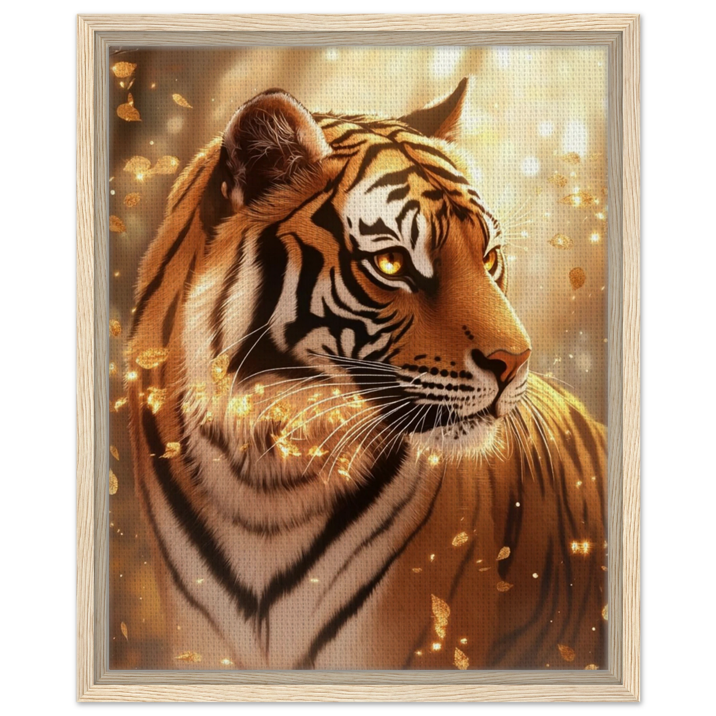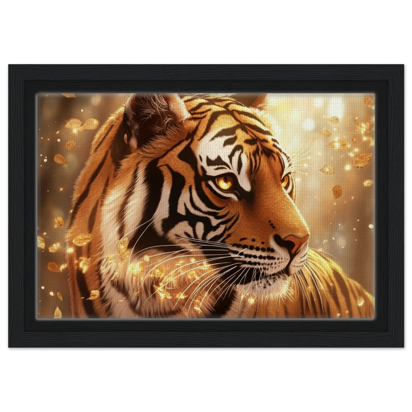 Der strukturierte Leinwanddruck in edler Rahmenfassung betont jedes Detail – von seinem majestätischen Blick bis zum goldenen Schimmer des Waldes.