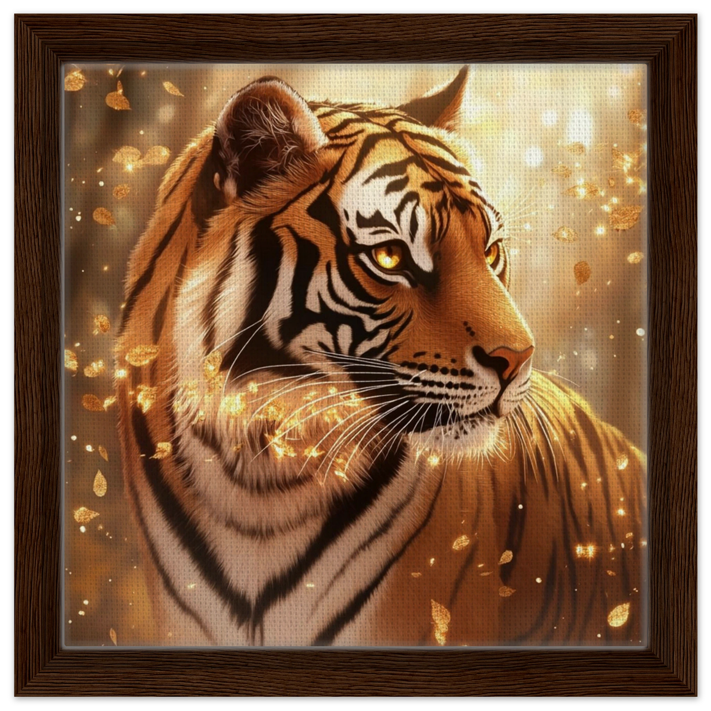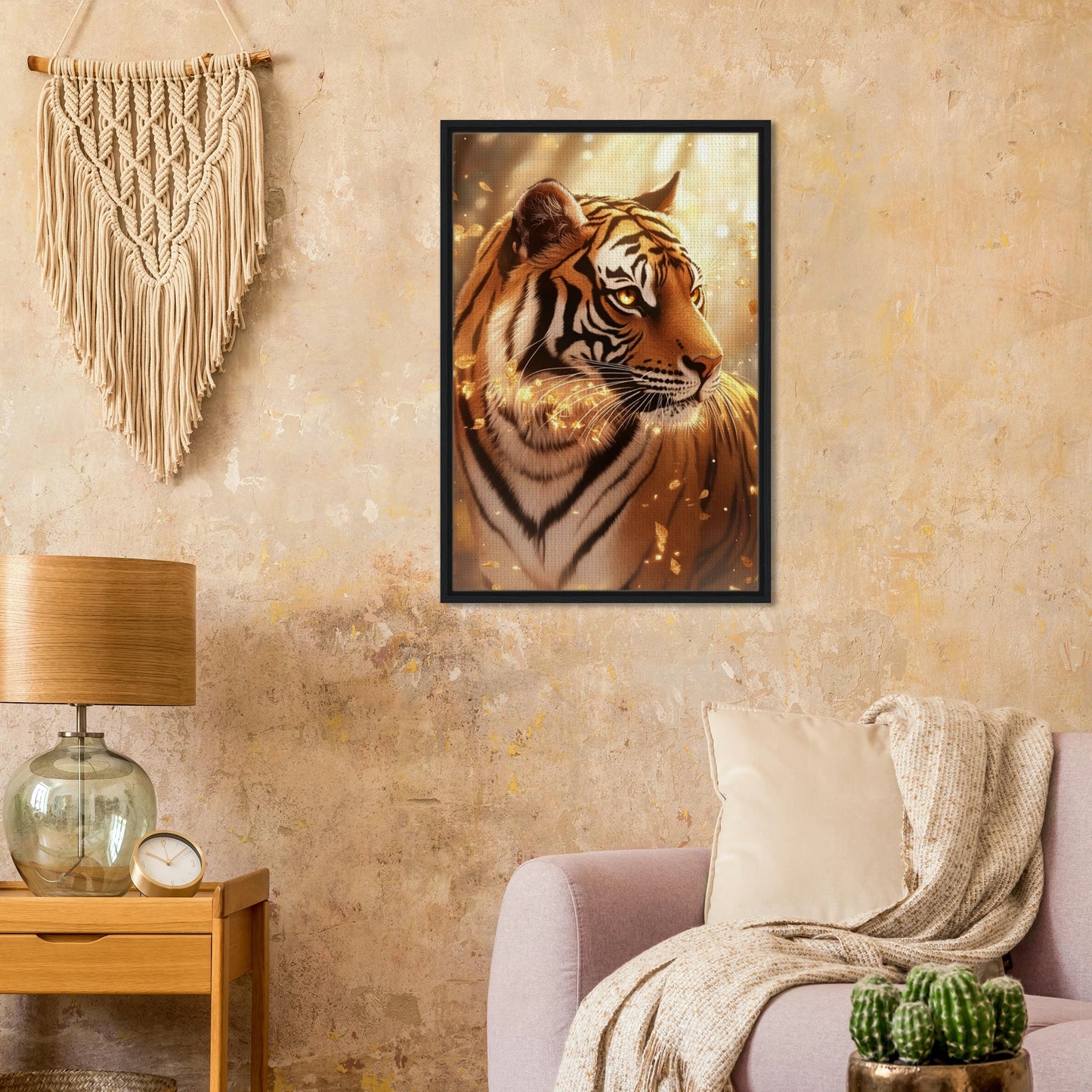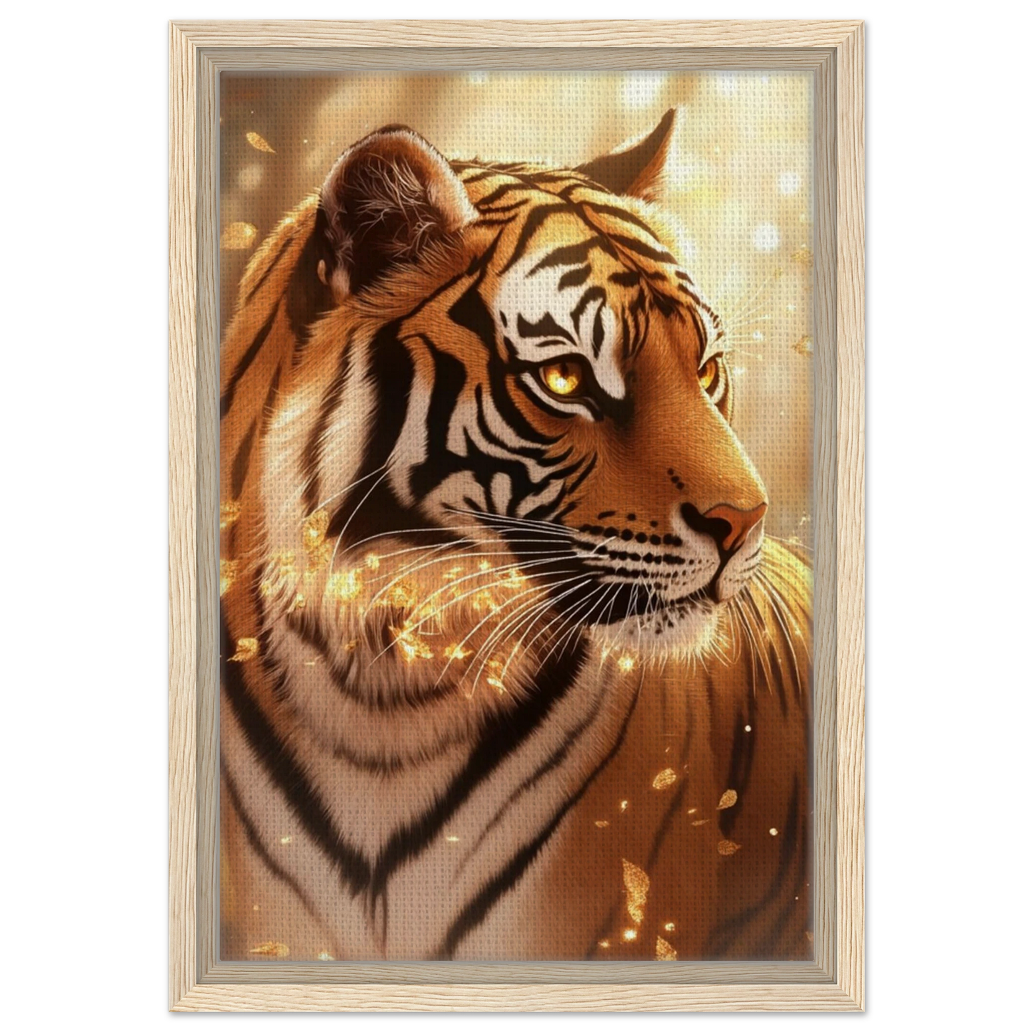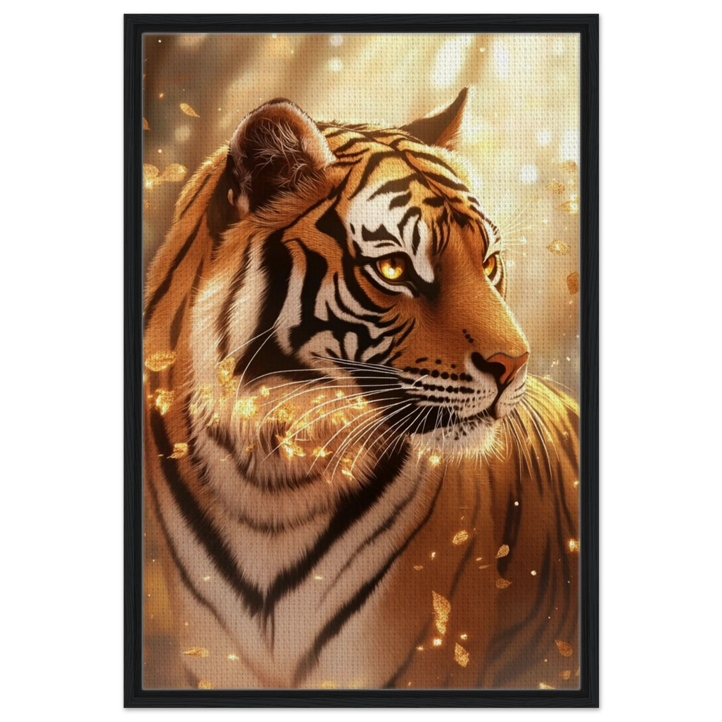 Der strukturierte Leinwanddruck in edler Rahmenfassung betont jedes Detail – von seinem majestätischen Blick bis zum goldenen Schimmer des Waldes.