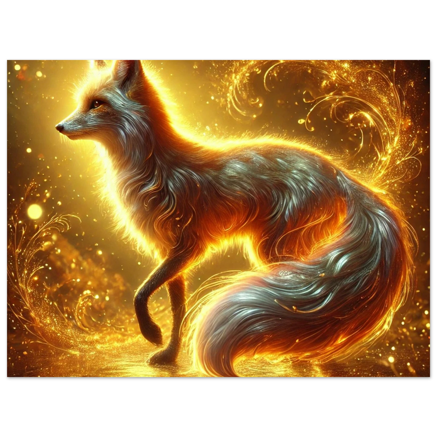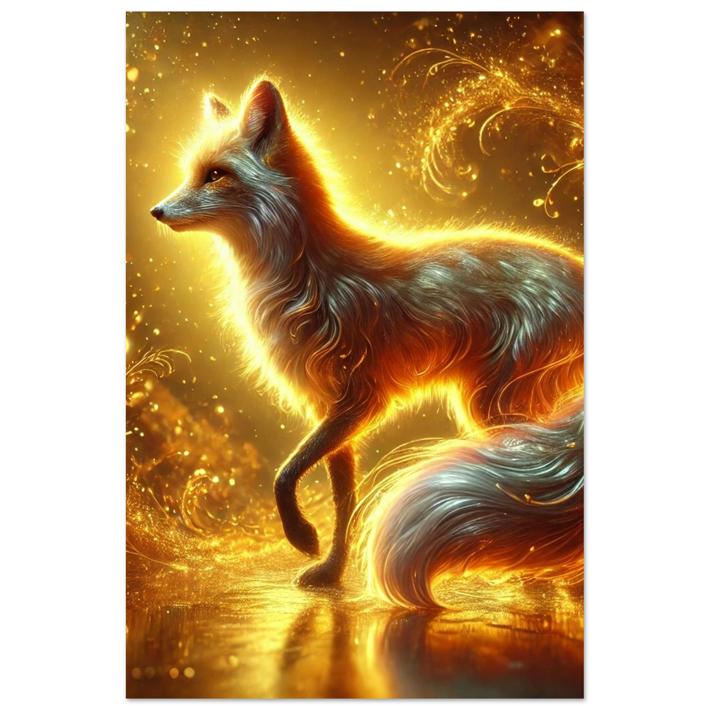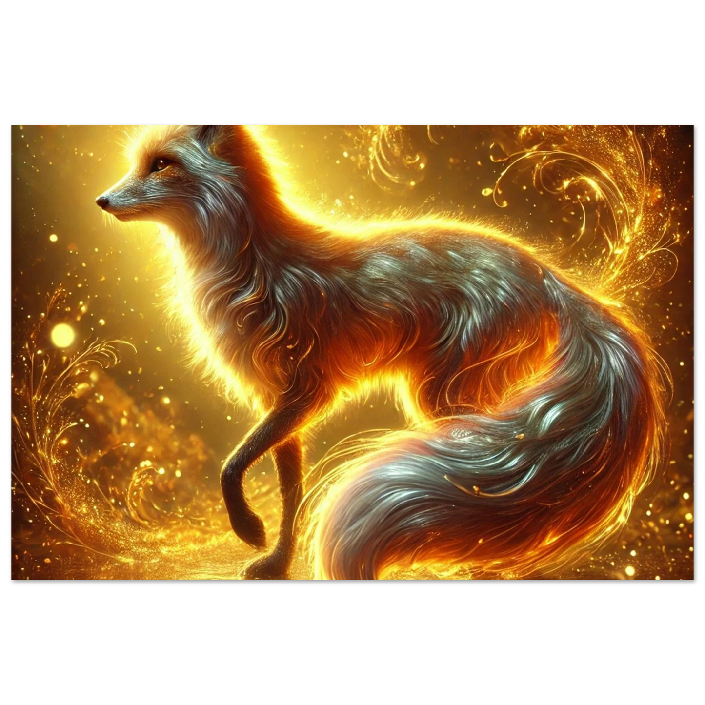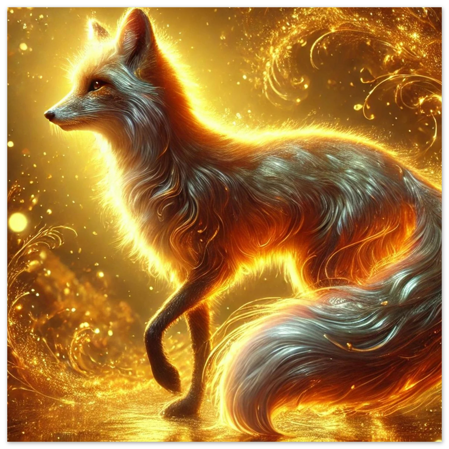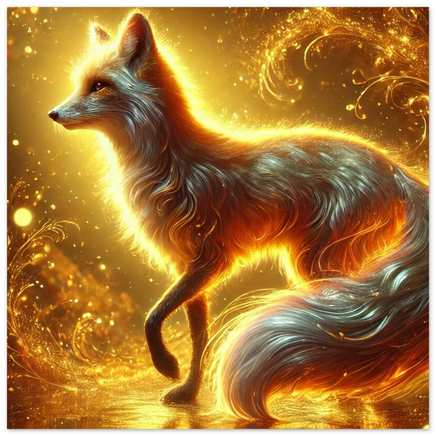 Wenn die Sonne ihre letzten Strahlen über den Horizont sendet, gleitet Emberis – der Flammenfuchs – lautlos durch das goldene Licht. Sein Fell schimmert wie Glut, seine Erscheinung erinnert an verlorene Wünsche, die in der Stille des Abends leuchten. Dieses Werk fängt die Wärme, Magie und leuchtende Kraft dieses Moments ein.