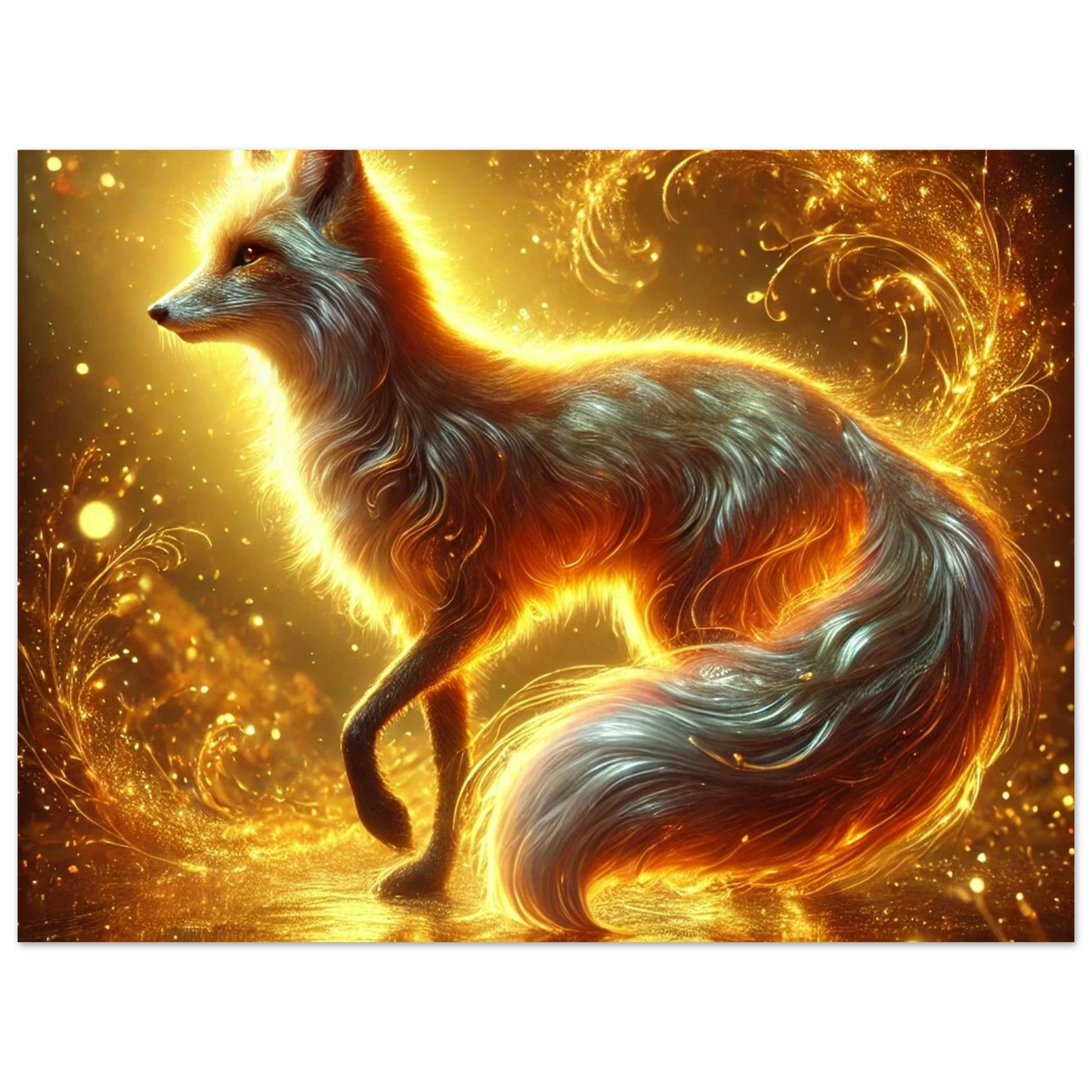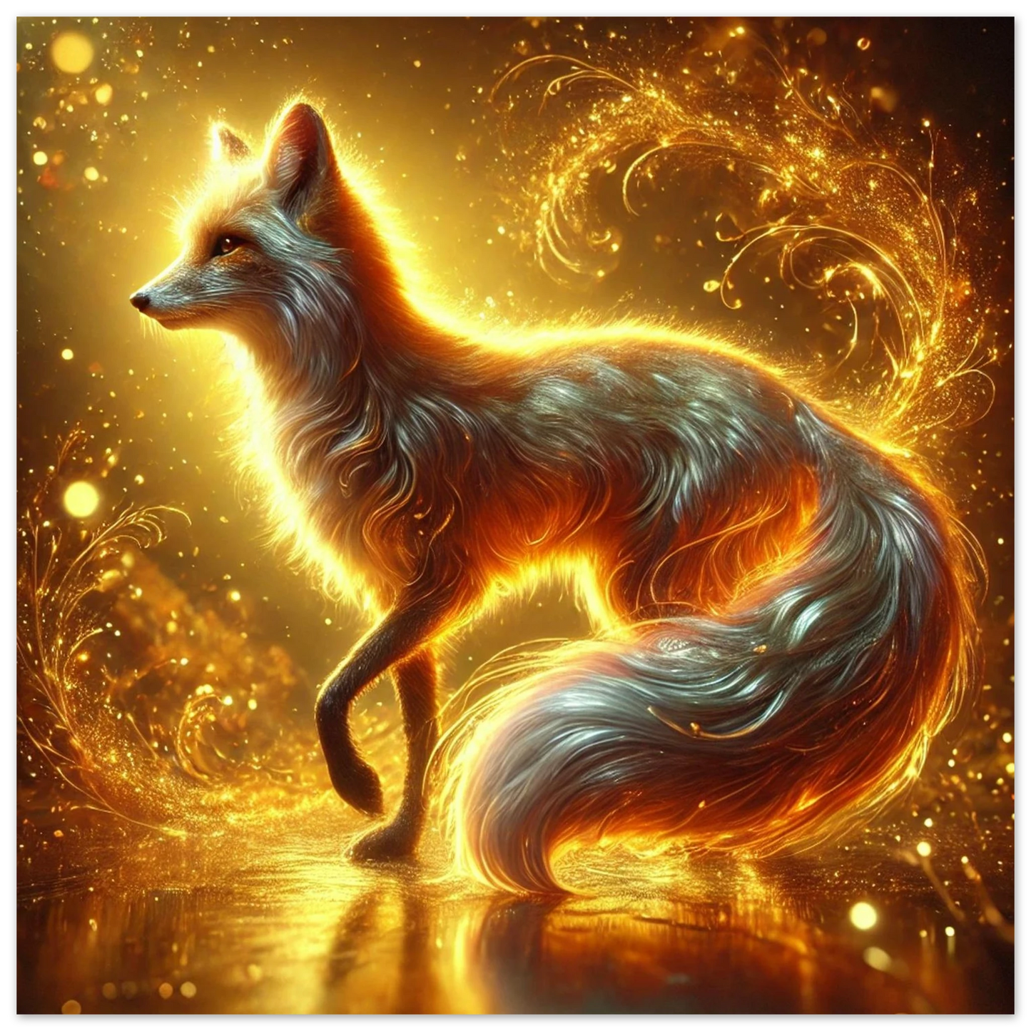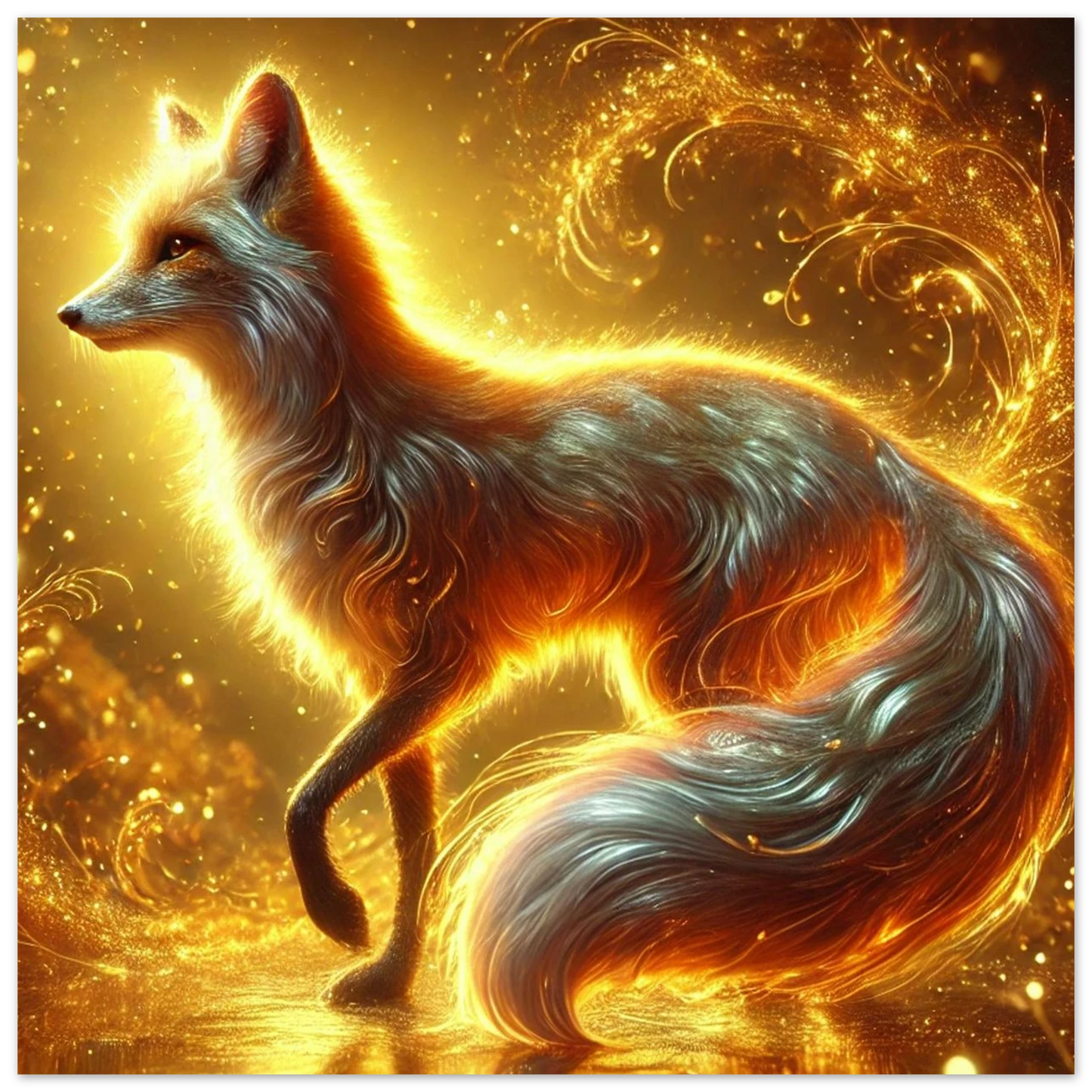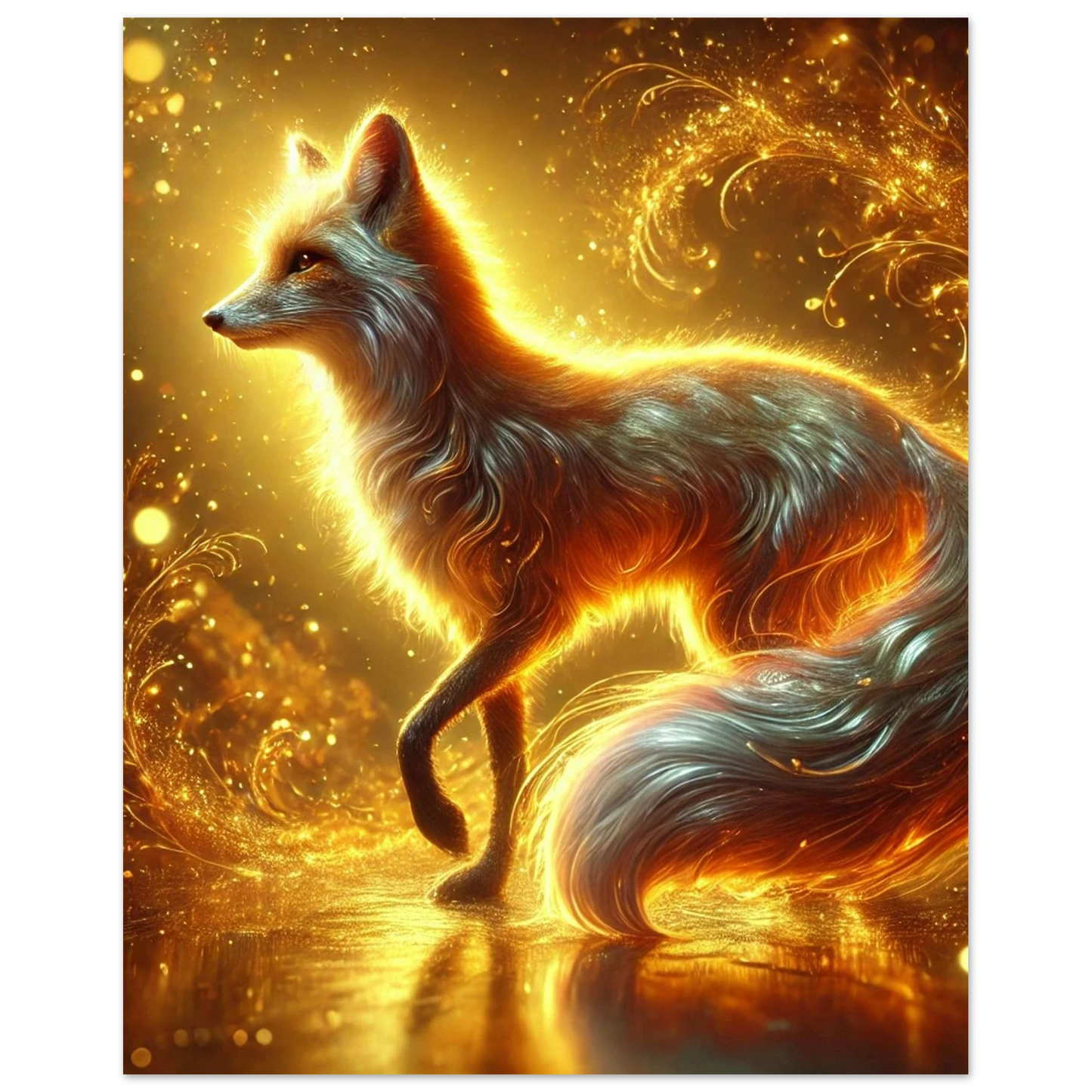 Wenn die Sonne ihre letzten Strahlen über den Horizont sendet, gleitet Emberis – der Flammenfuchs – lautlos durch das goldene Licht. Sein Fell schimmert wie Glut, seine Erscheinung erinnert an verlorene Wünsche, die in der Stille des Abends leuchten. Dieses Werk fängt die Wärme, Magie und leuchtende Kraft dieses Moments ein.