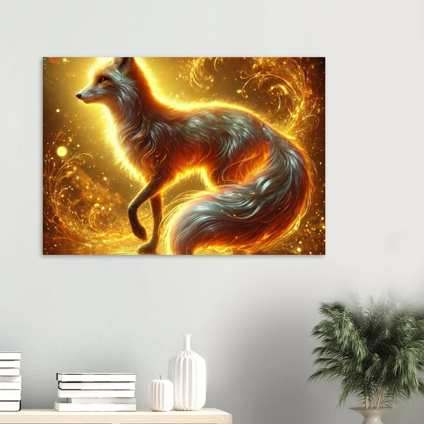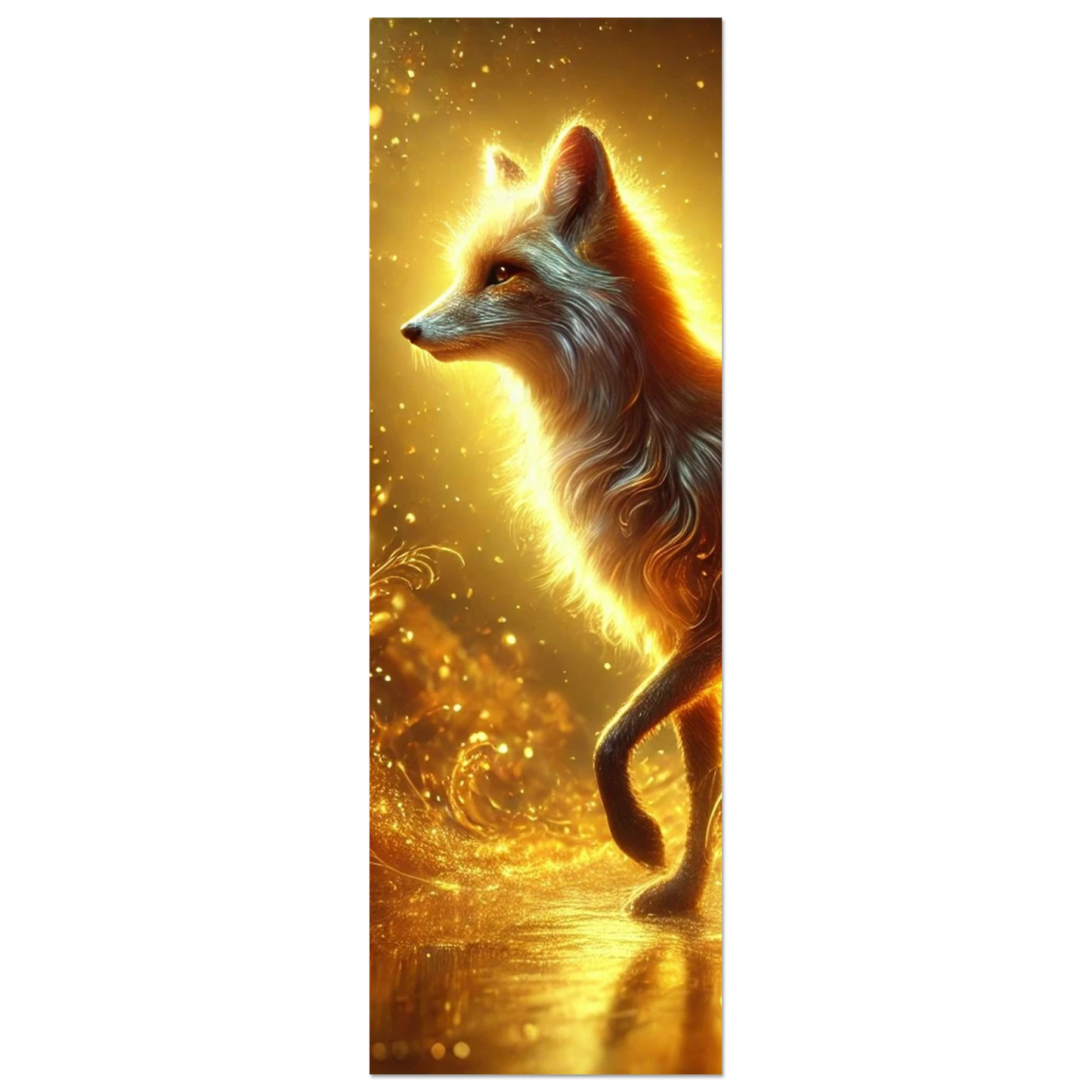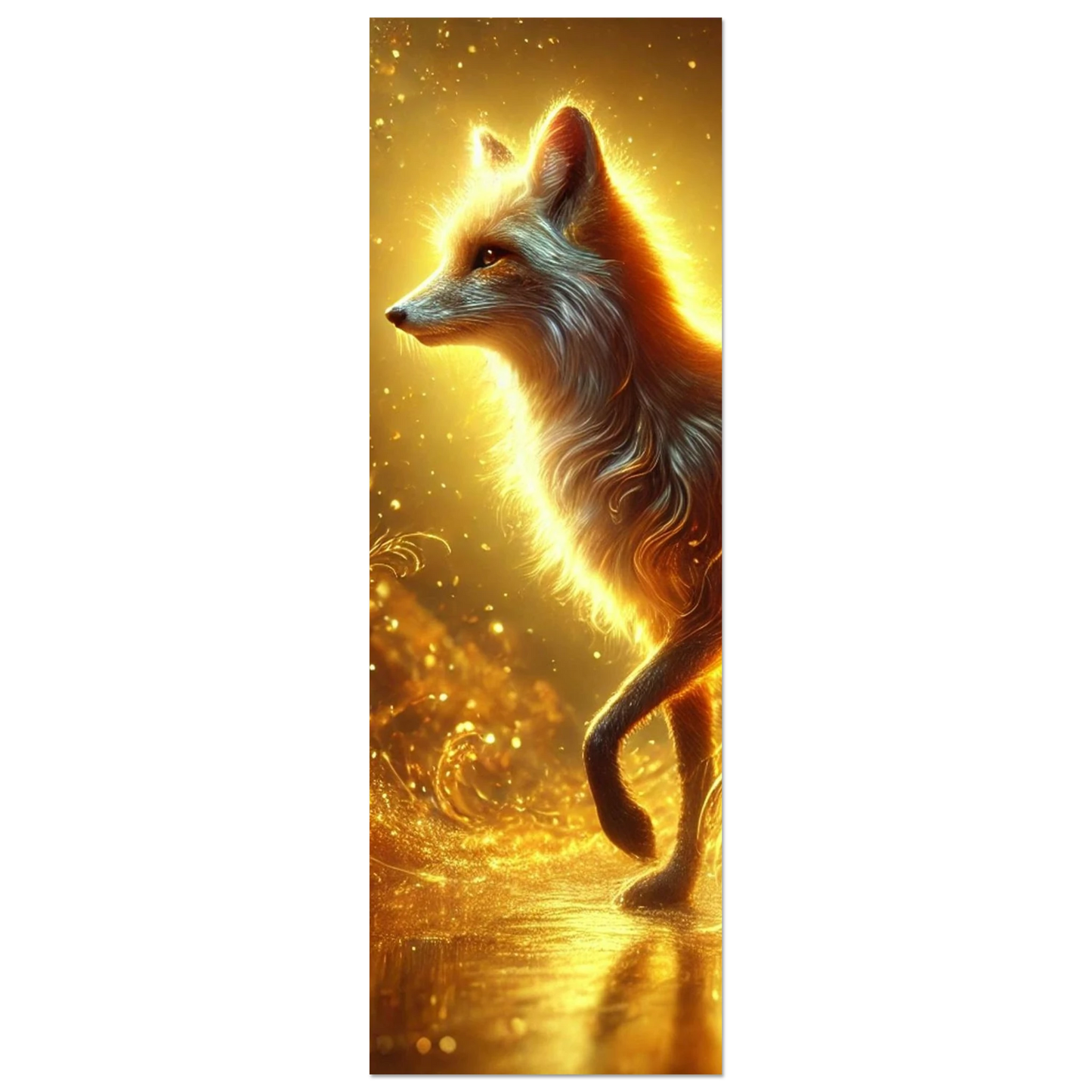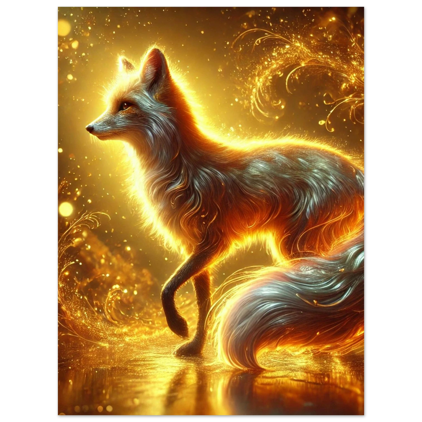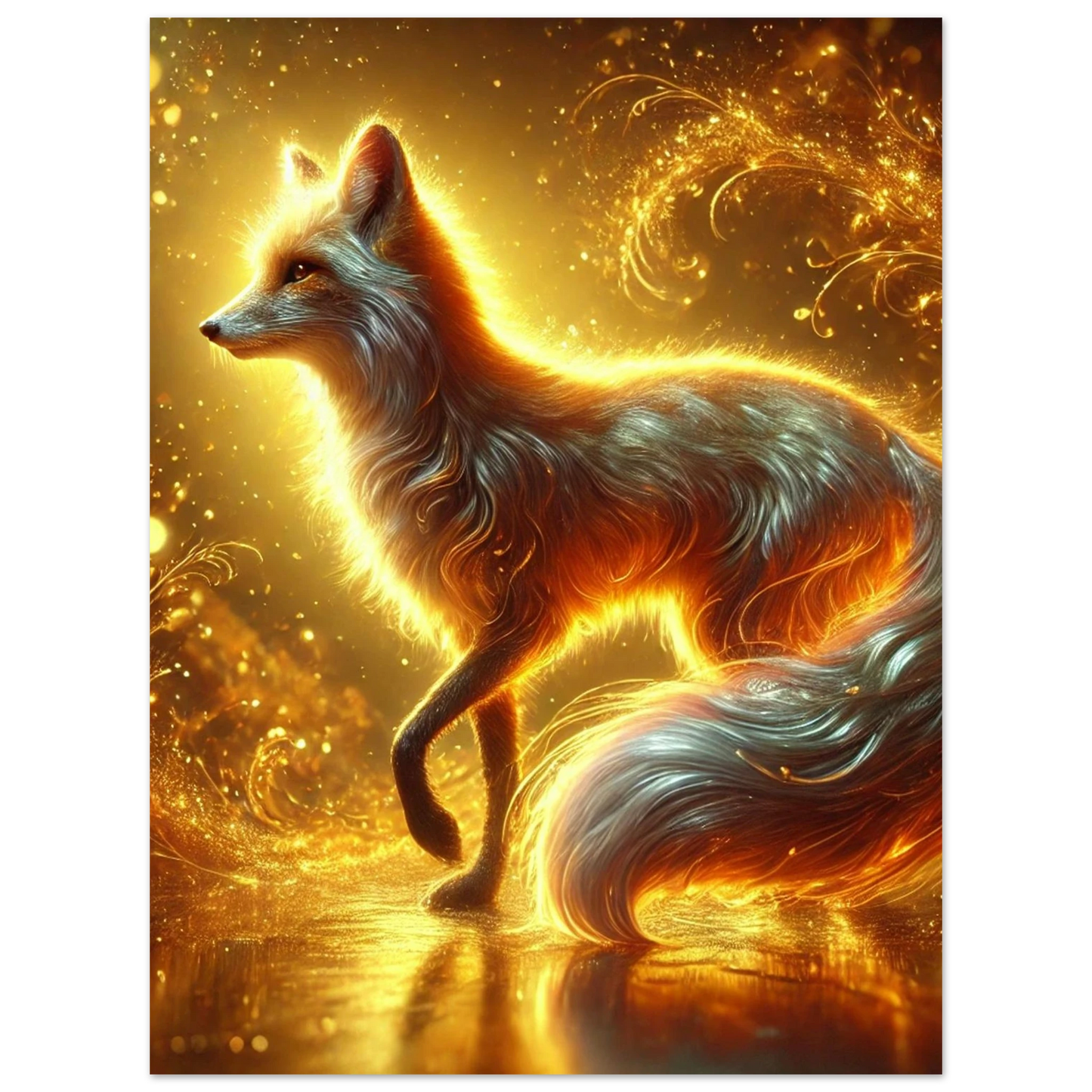 Wenn die Sonne ihre letzten Strahlen über den Horizont sendet, gleitet Emberis – der Flammenfuchs – lautlos durch das goldene Licht. Sein Fell schimmert wie Glut, seine Erscheinung erinnert an verlorene Wünsche, die in der Stille des Abends leuchten. Dieses Werk fängt die Wärme, Magie und leuchtende Kraft dieses Moments ein.