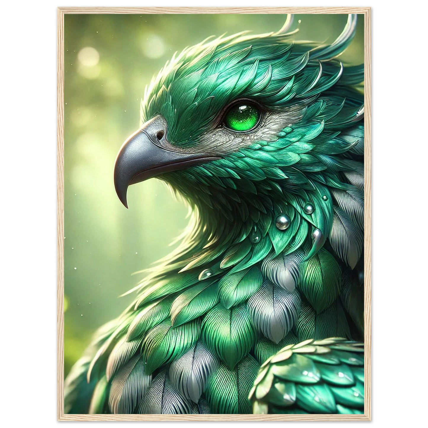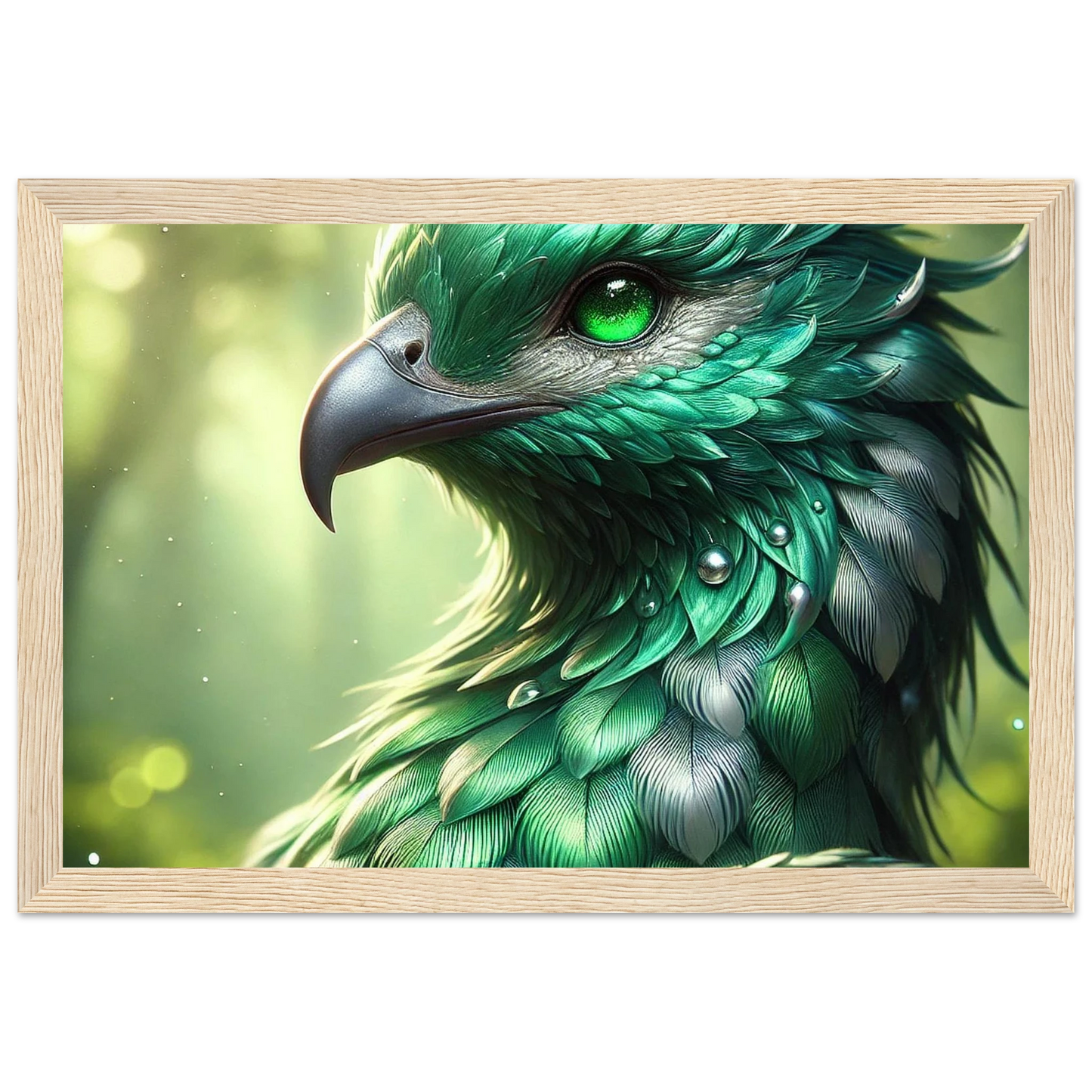 Bring die stille Kraft des Waldes direkt an deine Wand – mit diesem eleganten, holzgerahmten Kunstdruck von Emeralor, dem geheimnisvollen Vogelgeist mit smaragdgrünen Federn, der über das Gleichgewicht der Natur wacht.