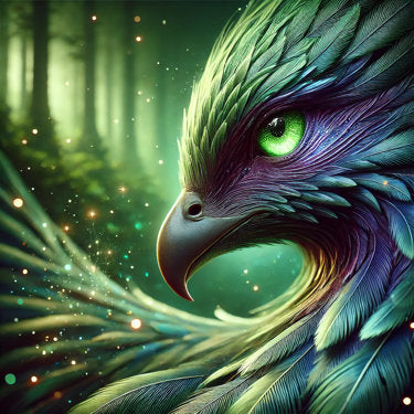 Faelorn ist ein sagenumwobener Waldgeist in Gestalt eines prachtvollen Vogels, dessen tiefgrünes Gefieder mit geheimnisvollen Schattierungen aus Violett und Blau durchzogen ist. Seine Augen leuchten wie Edelsteine – durchdringend, wissend, wachsam. Faelorn verkörpert die Seele des Waldes, ein ewiger Wächter der Harmonie und des Gleichgewichts.