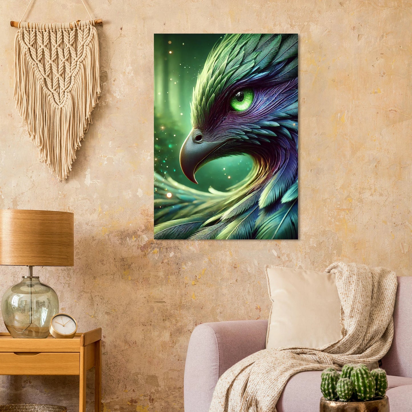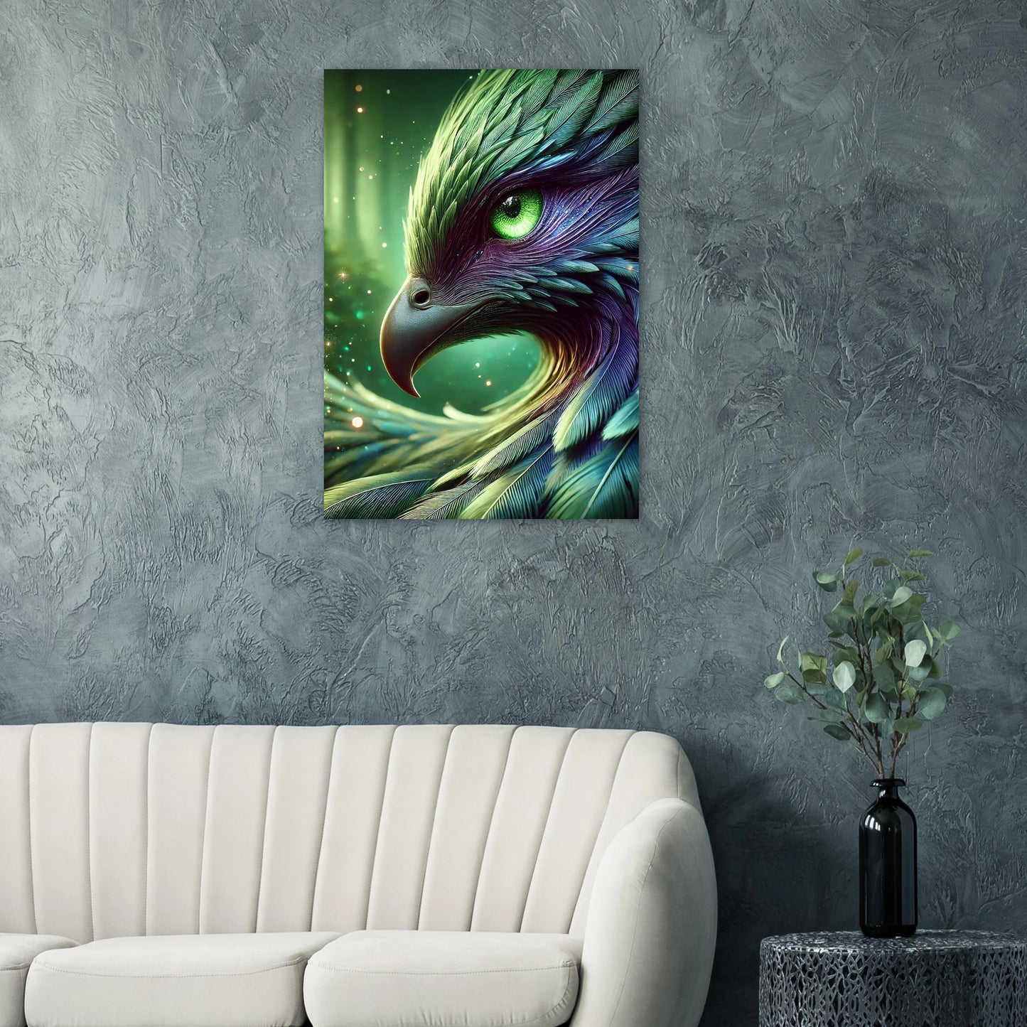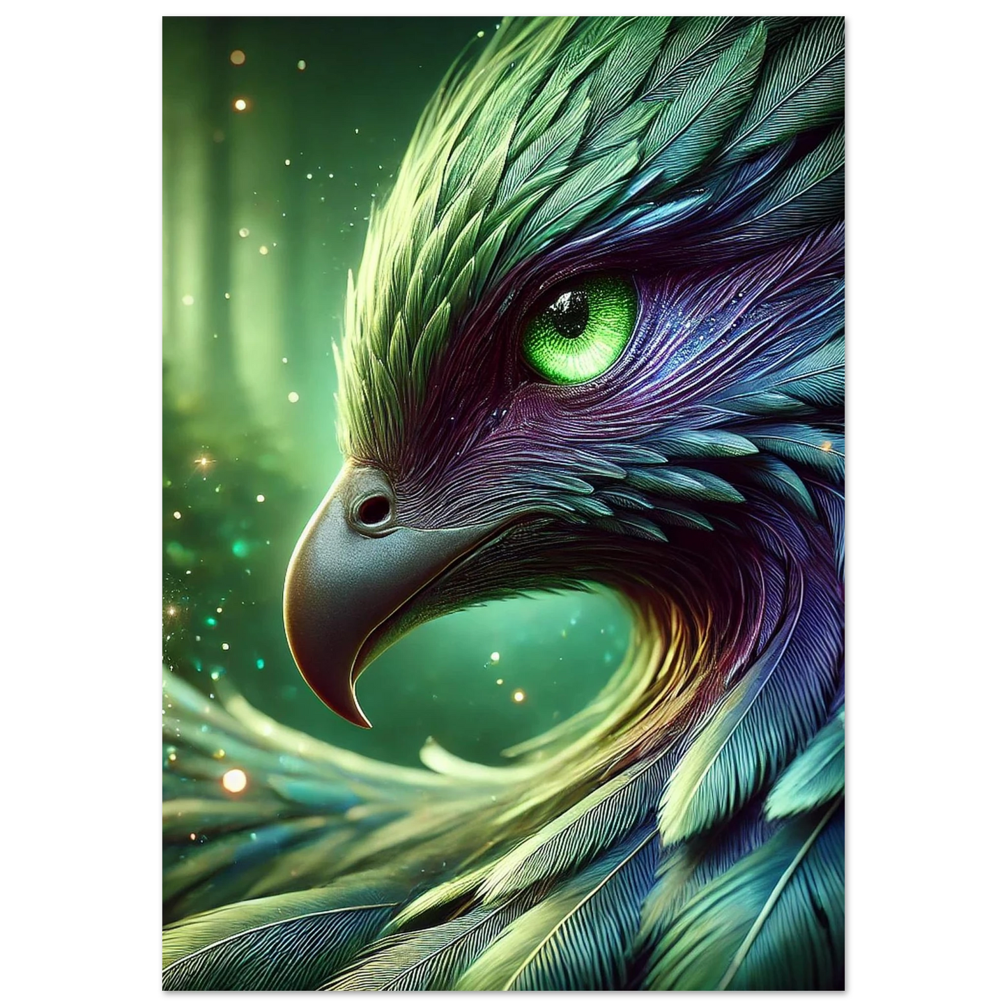 Wenn Nebel durch uralte Baumkronen zieht und das Licht in stillen Strahlen tanzt, erhebt sich Faelorn – ein mystischer Vogelgeist mit schimmerndem Gefieder in Tiefgrün, Violett und Blau. Seine lautlose Präsenz verkörpert den Atem des Waldes – weise, wachsam, voller Harmonie.