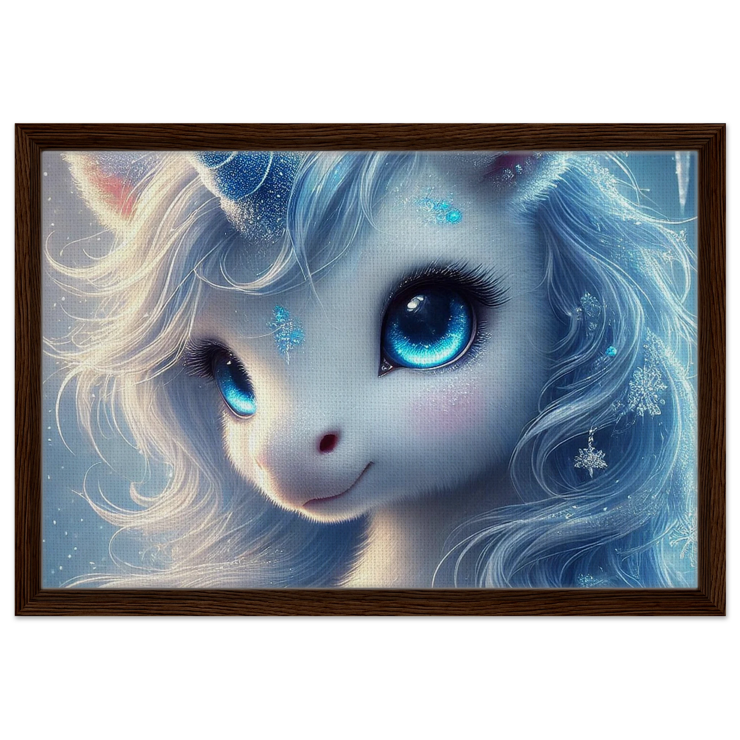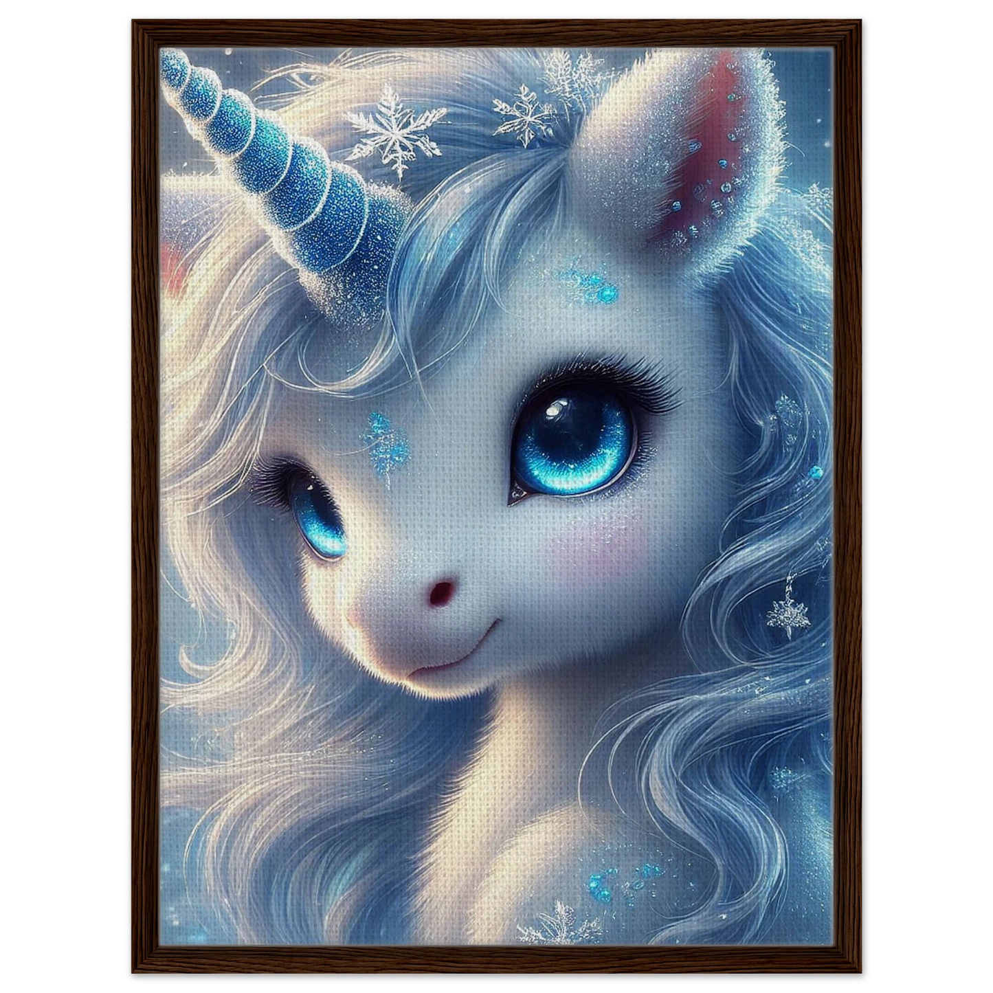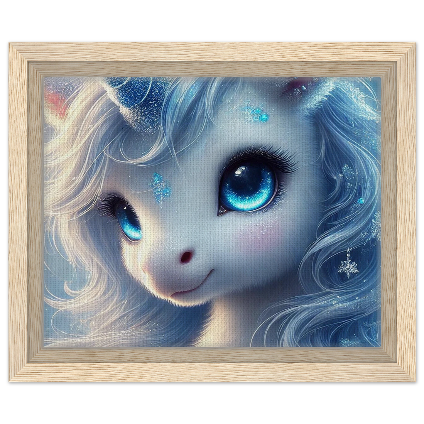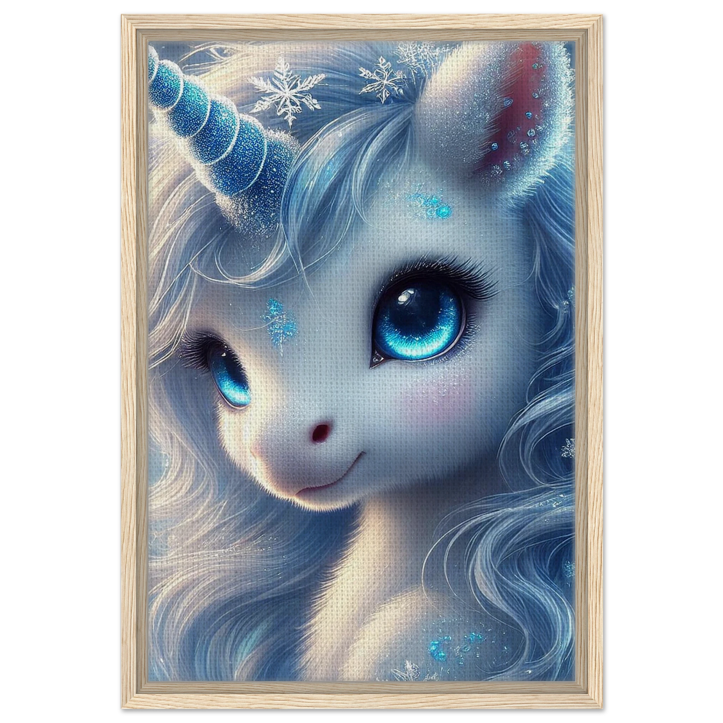 Erlebe die stille Schönheit des Winters mit Frostra, dem leuchtenden Einhorn, das Trost, Klarheit und Hoffnung bringt – jetzt als hochwertiger gerahmter Leinwanddruck. Die strukturierte Oberfläche der Leinwand verleiht dem frostblauen Motiv Tiefe und Natürlichkeit, während der elegante Rahmen in Schwarz, Naturholz oder Dunkelbraun das Kunstwerk optisch vollendet.