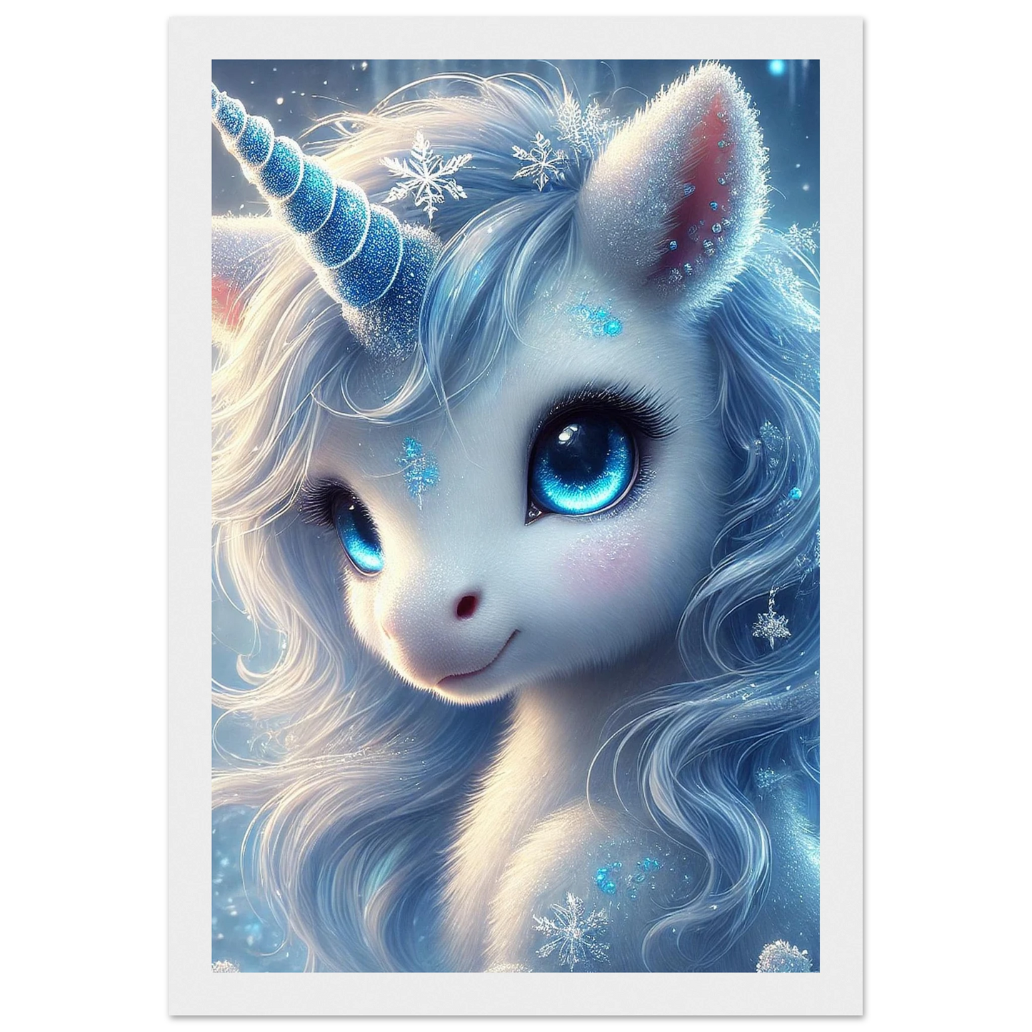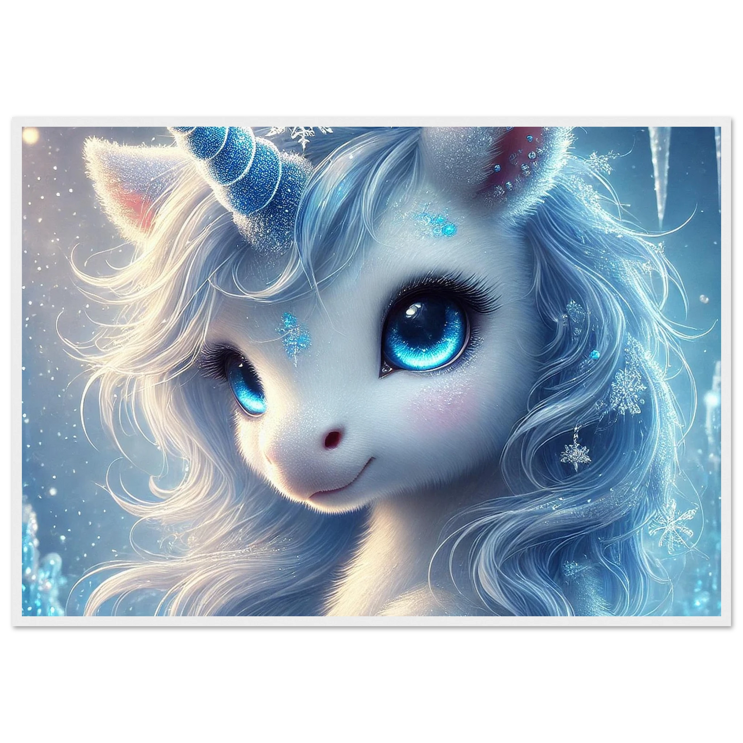 Lass Frostra, das Einhorn des winterlichen Lichts, als stilvoll gerahmten Kunstdruck in dein Zuhause einziehen. Ihre eisblauen Töne, schimmernde Mähne und die tanzenden Schneeflocken werden durch den 12-Farben-Giclée-Druck auf edlem Fine Art Papier besonders intensiv und fein dargestellt. Umrahmt von natürlichem Kiefernholz und geschützt durch bruchsicheres Plexiglas, wird aus diesem Motiv ein echter Blickfang – klar, ruhig und voller Bedeutung.