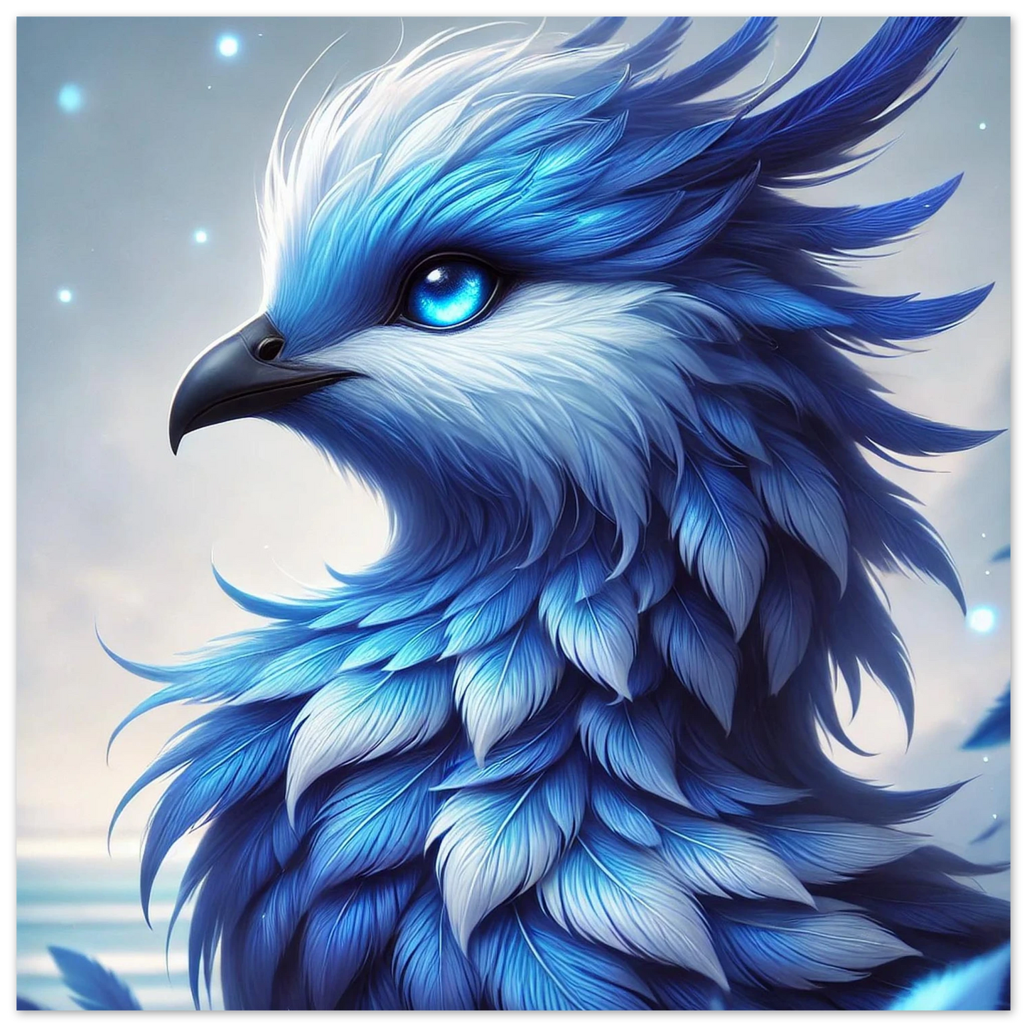 Lass Frostral, den stillen Wächter aus Wind und Eis, in deinen Raum gleiten – als eleganter Schaumstoffdruck mit klarer Linienführung und beeindruckender Farbwirkung. Sein frostig-blaues Federkleid und der ruhige Blick wirken auf der glatten Oberfläche der PVC-Platte besonders intensiv und atmosphärisch.