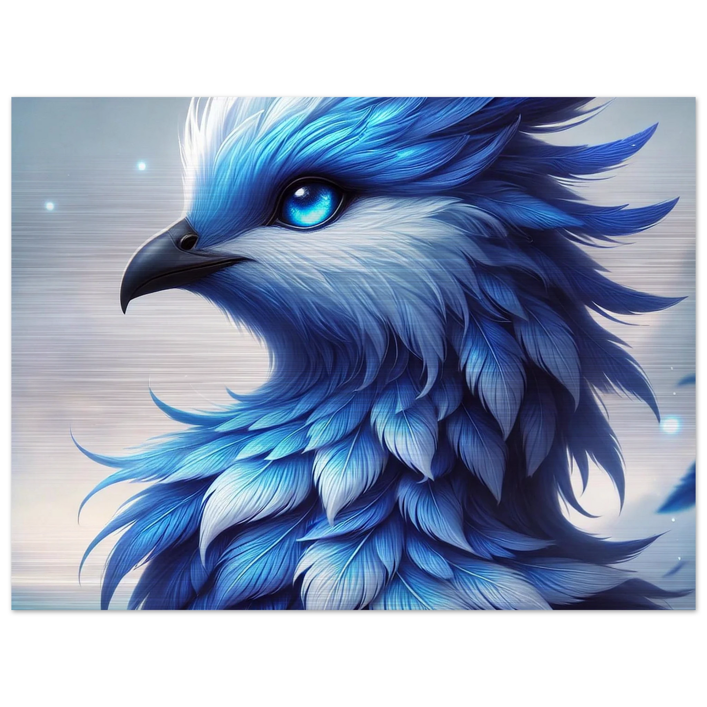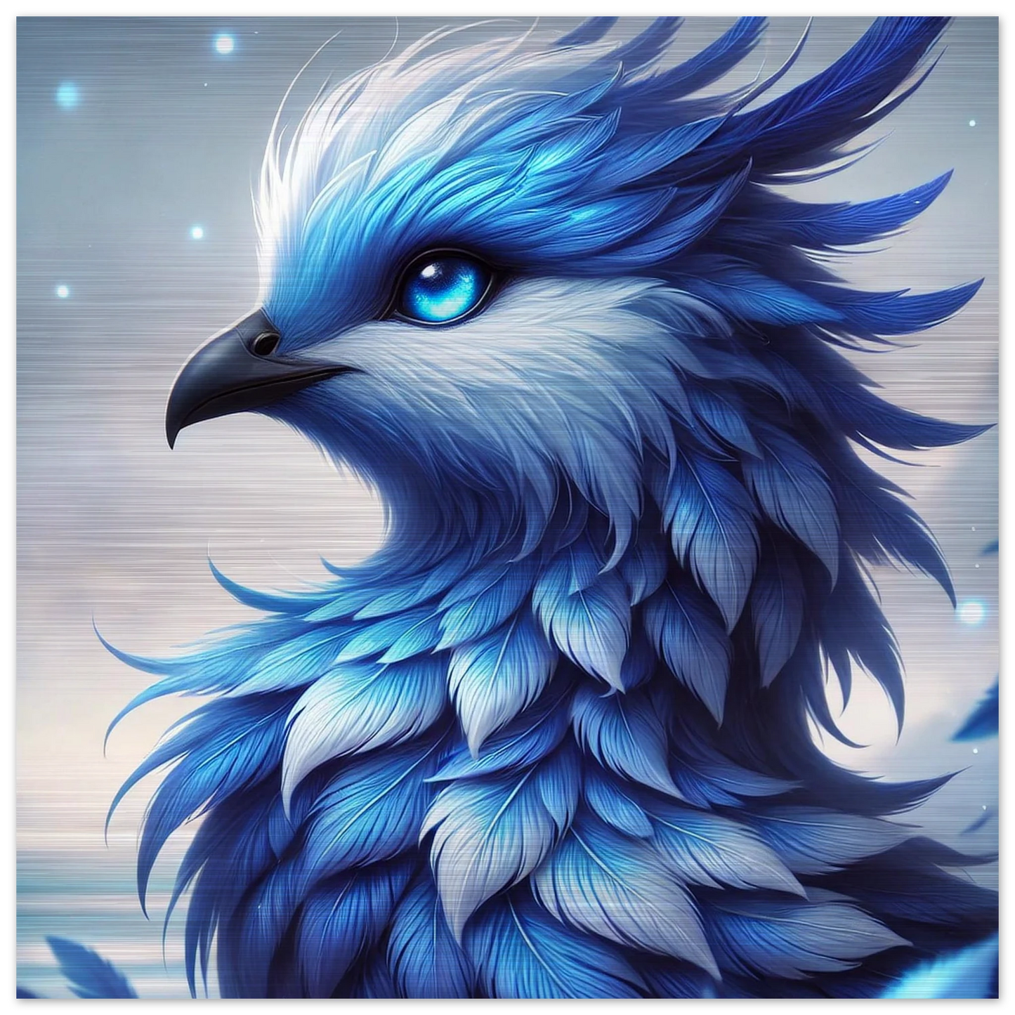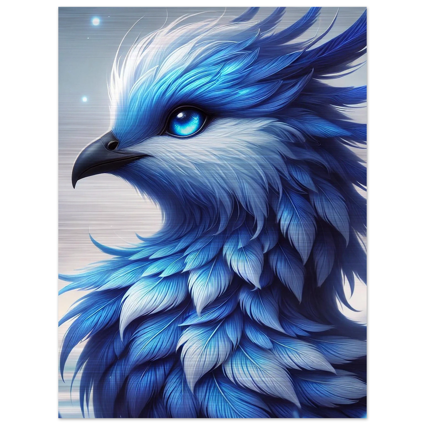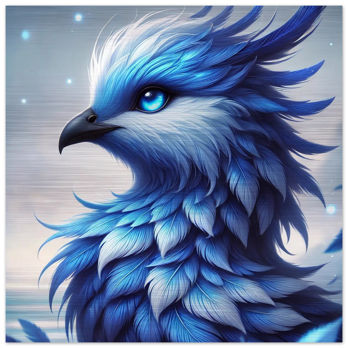 Erlebe Frostral, den Wächter des ewigen Winters, in einer ganz neuen Dimension – als Druck auf gebürstetem Aluminium. Die horizontale Maserung der silbernen DIBOND®-Platte verstärkt die frostige Dynamik seines Federkleids und verleiht dem Bild eine metallische Tiefe, die bei jeder Lichtveränderung neu wirkt. Weiße Bereiche bleiben unbedruckt, sodass das silberne Aluminium durchscheint – wie glitzernder Eisstaub im Morgenlicht.