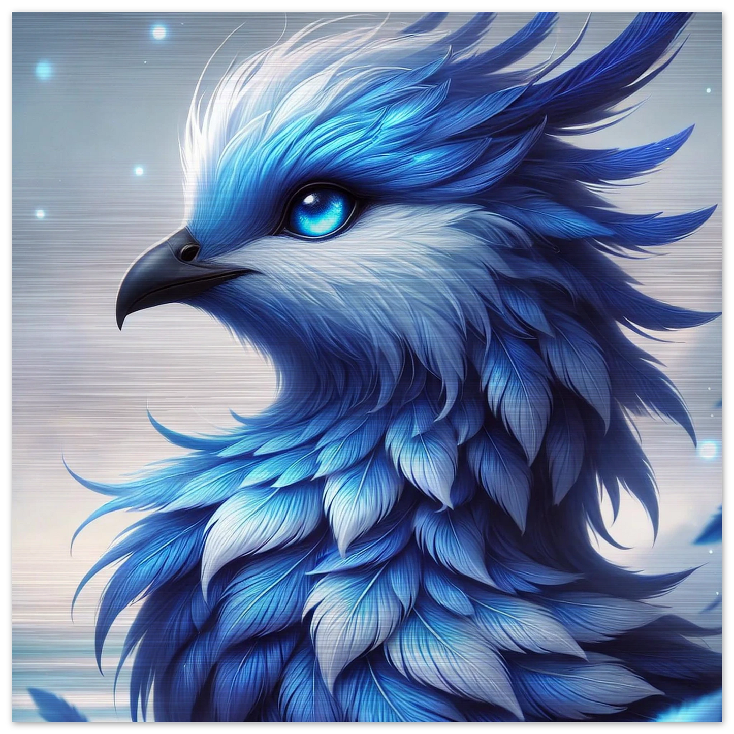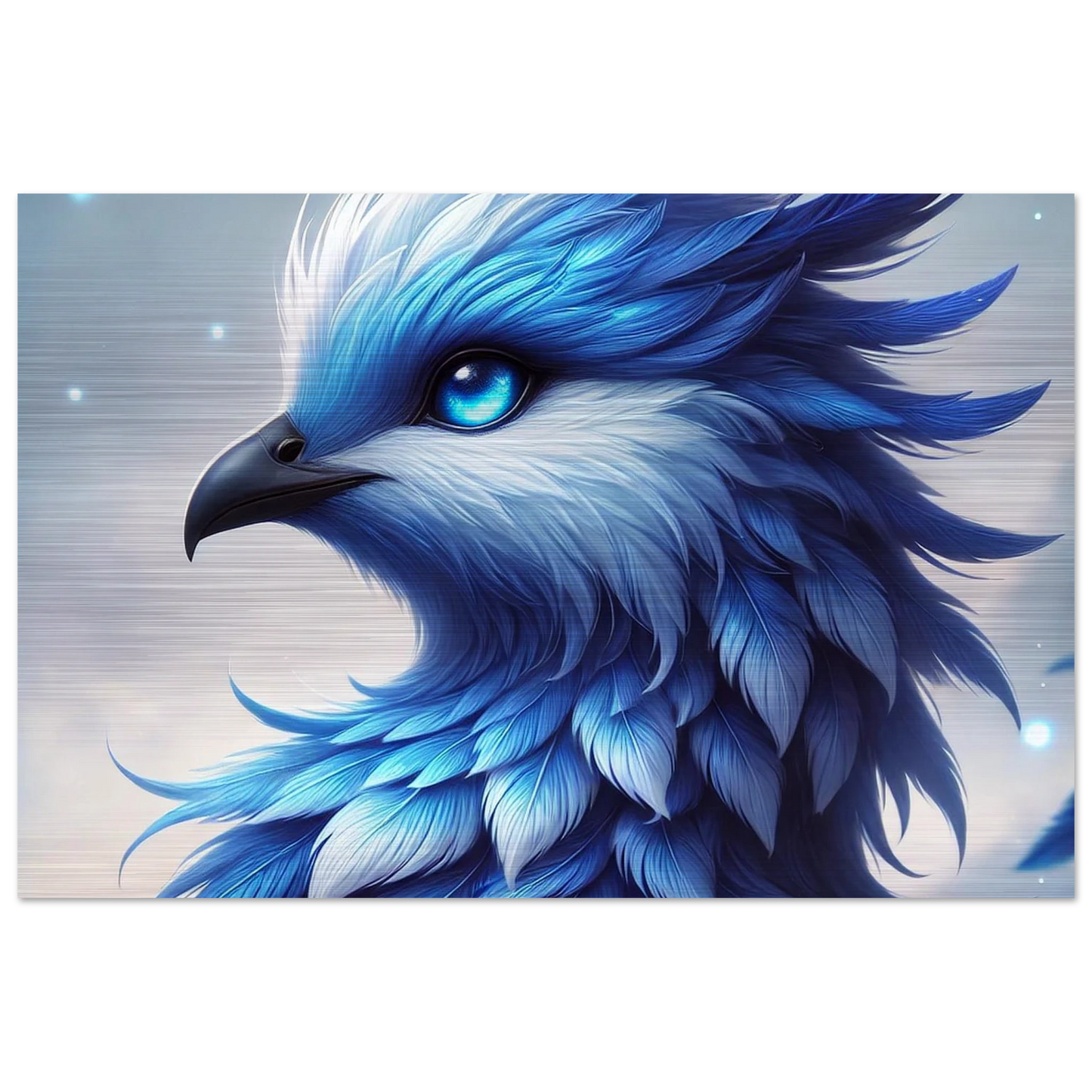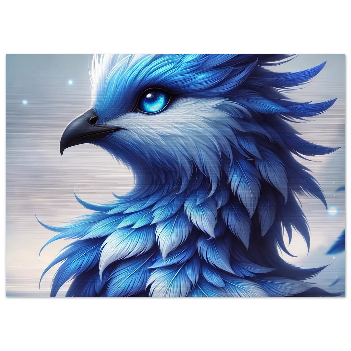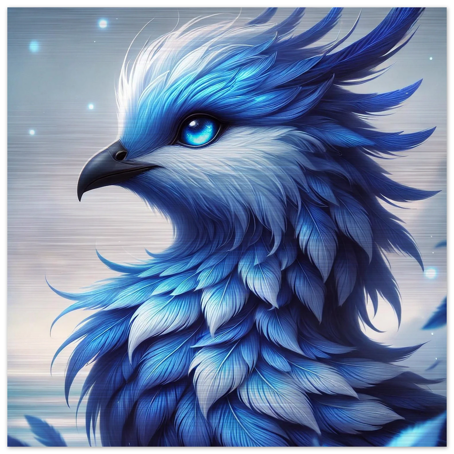 Erlebe Frostral, den Wächter des ewigen Winters, in einer ganz neuen Dimension – als Druck auf gebürstetem Aluminium. Die horizontale Maserung der silbernen DIBOND®-Platte verstärkt die frostige Dynamik seines Federkleids und verleiht dem Bild eine metallische Tiefe, die bei jeder Lichtveränderung neu wirkt. Weiße Bereiche bleiben unbedruckt, sodass das silberne Aluminium durchscheint – wie glitzernder Eisstaub im Morgenlicht.