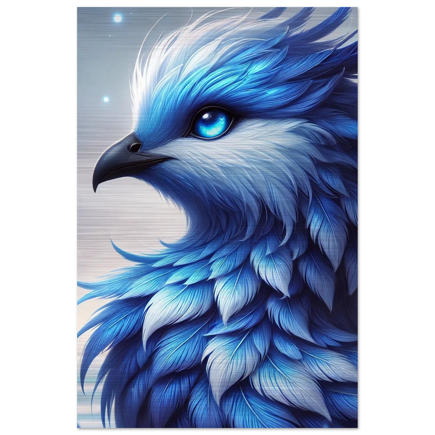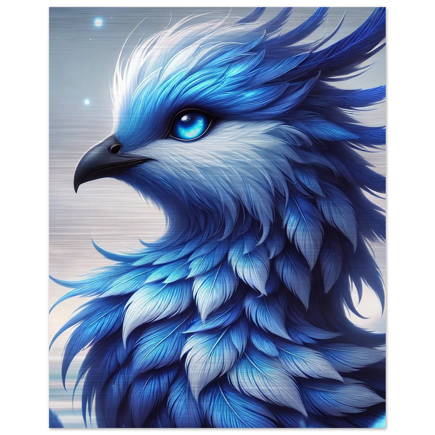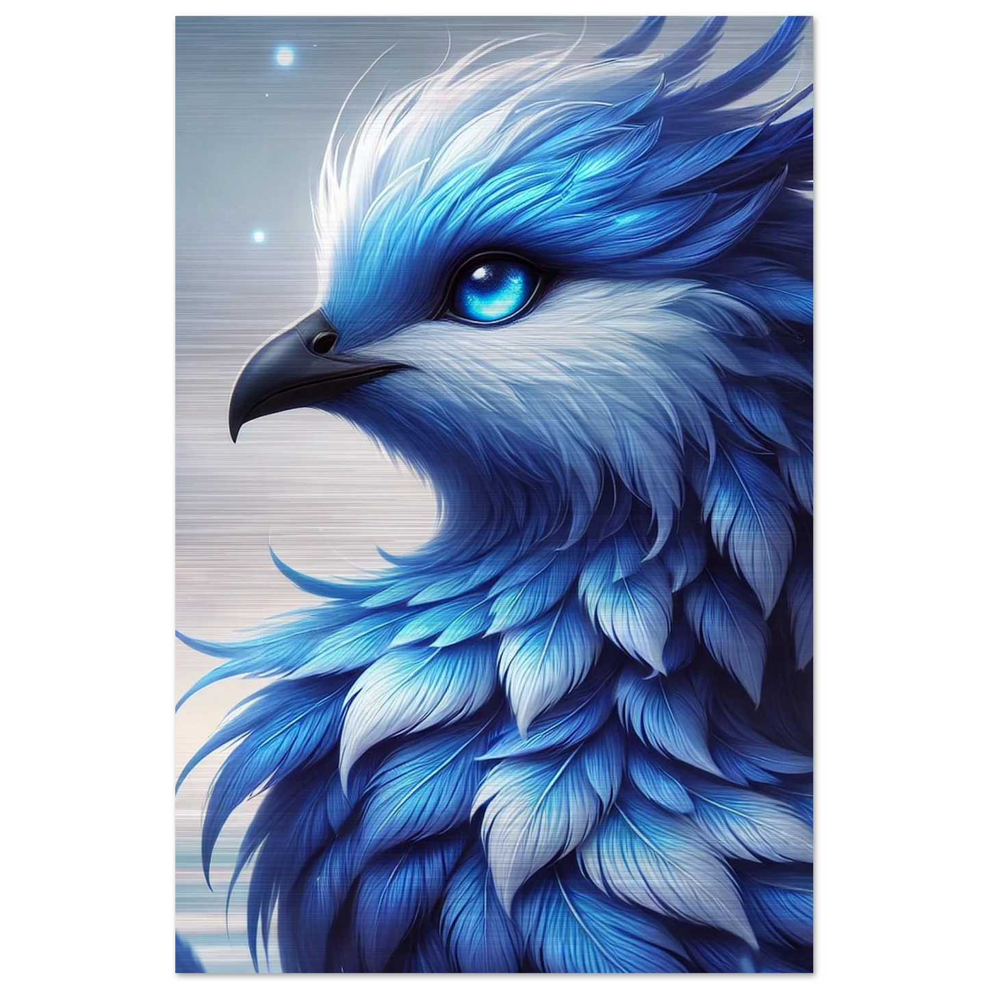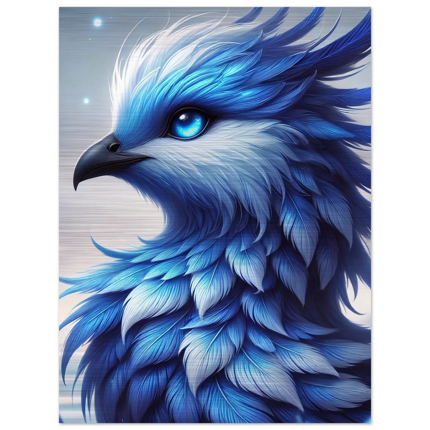Erlebe Frostral, den Wächter des ewigen Winters, in einer ganz neuen Dimension – als Druck auf gebürstetem Aluminium. Die horizontale Maserung der silbernen DIBOND®-Platte verstärkt die frostige Dynamik seines Federkleids und verleiht dem Bild eine metallische Tiefe, die bei jeder Lichtveränderung neu wirkt. Weiße Bereiche bleiben unbedruckt, sodass das silberne Aluminium durchscheint – wie glitzernder Eisstaub im Morgenlicht.
