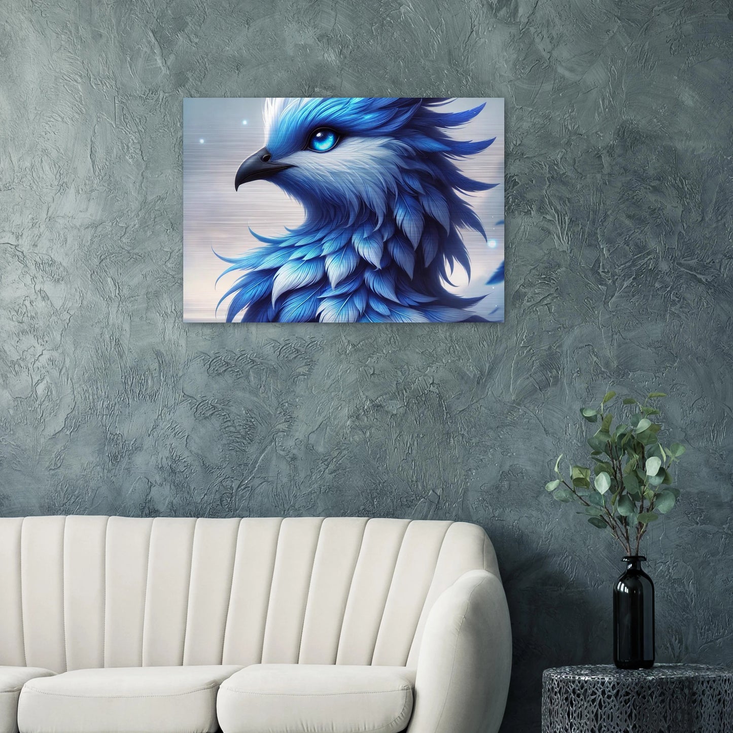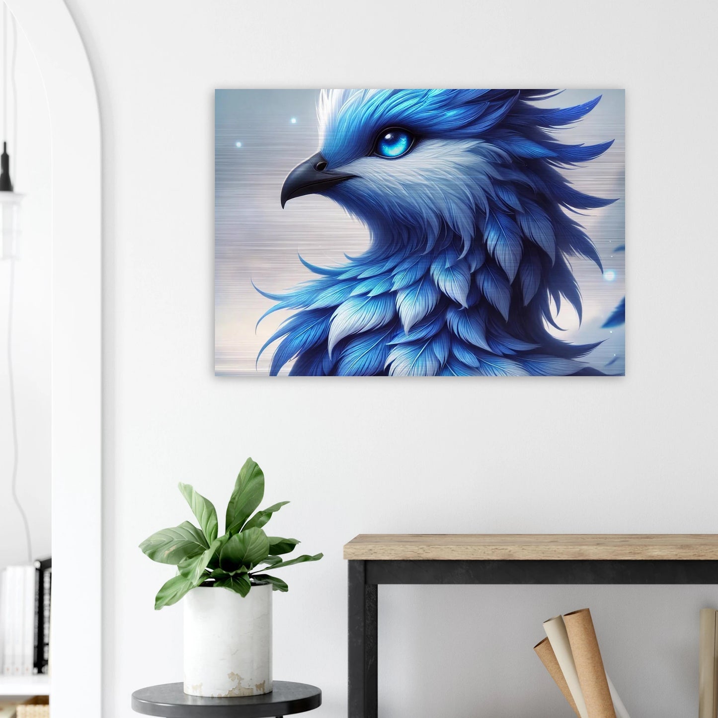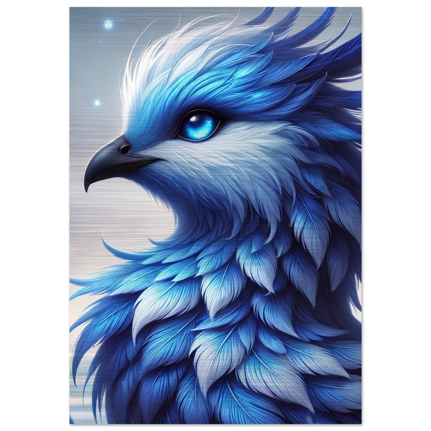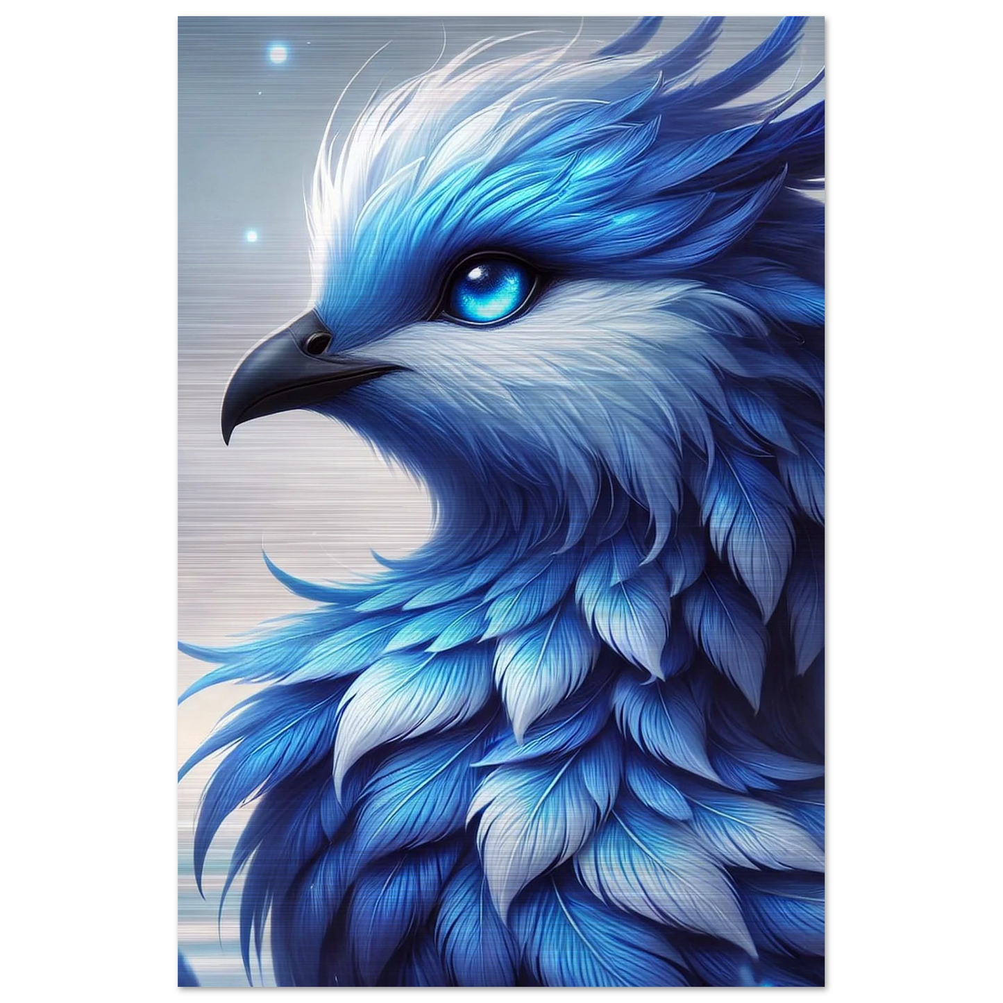 Erlebe Frostral, den Wächter des ewigen Winters, in einer ganz neuen Dimension – als Druck auf gebürstetem Aluminium. Die horizontale Maserung der silbernen DIBOND®-Platte verstärkt die frostige Dynamik seines Federkleids und verleiht dem Bild eine metallische Tiefe, die bei jeder Lichtveränderung neu wirkt. Weiße Bereiche bleiben unbedruckt, sodass das silberne Aluminium durchscheint – wie glitzernder Eisstaub im Morgenlicht.