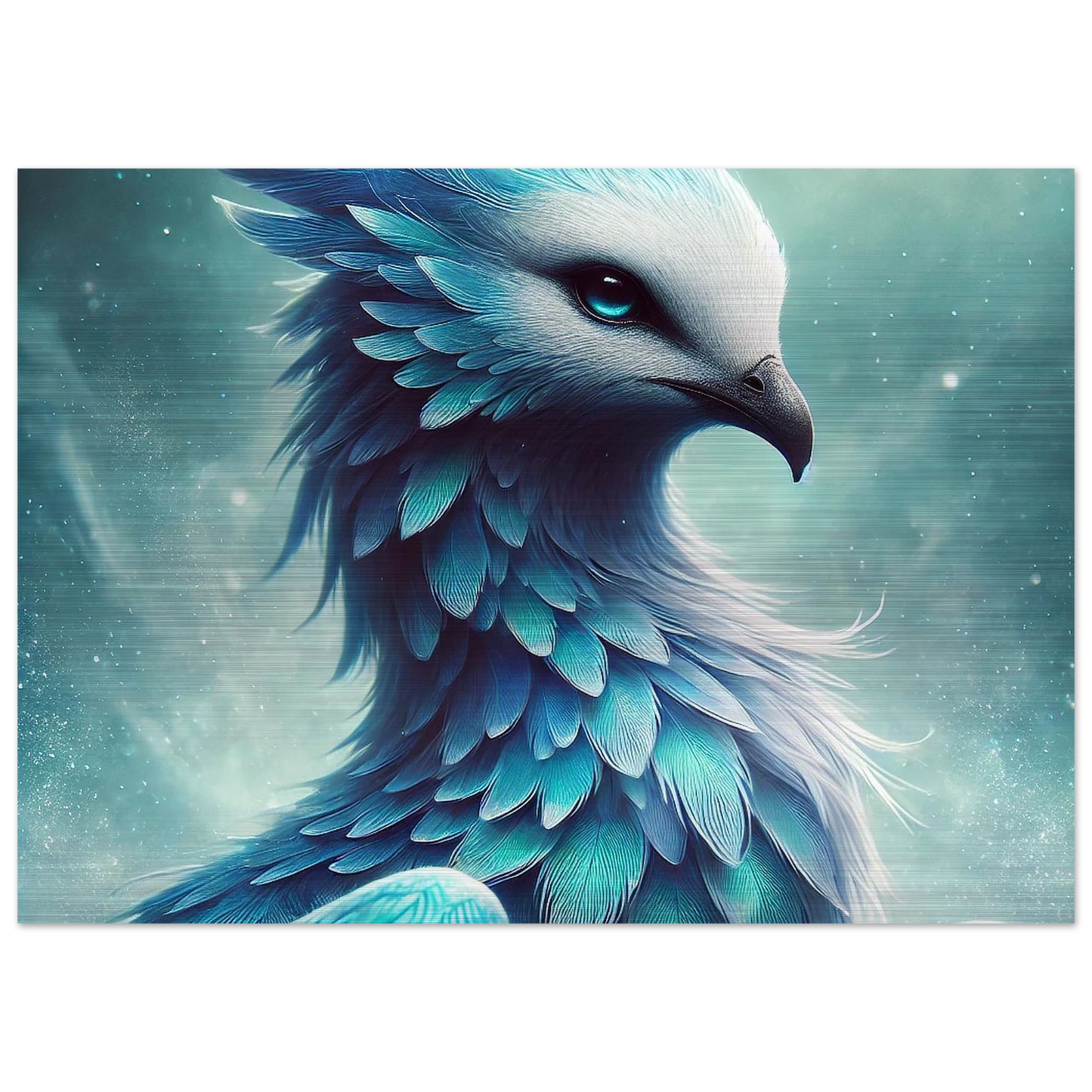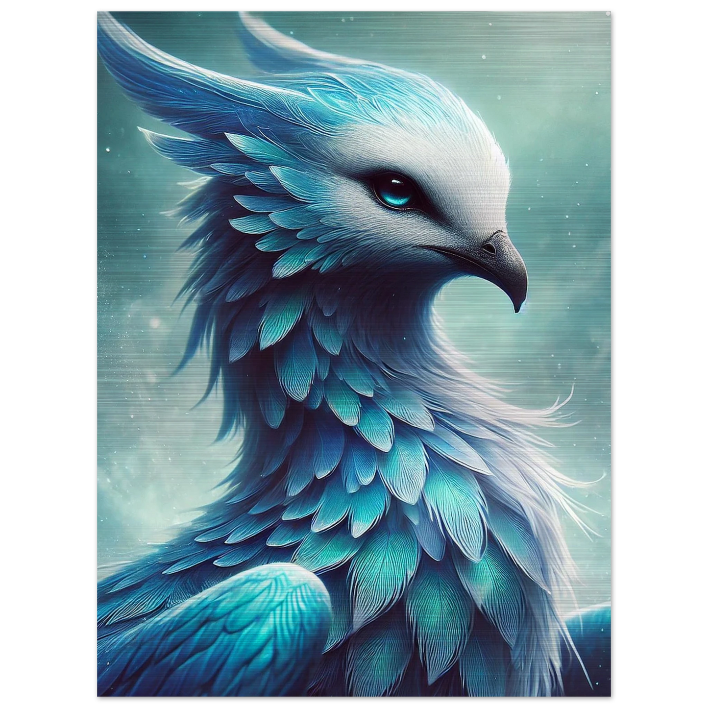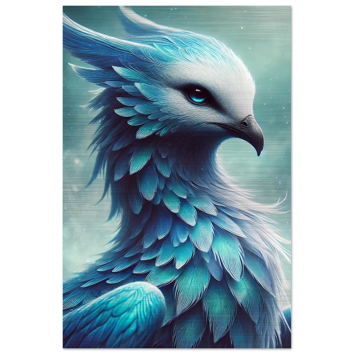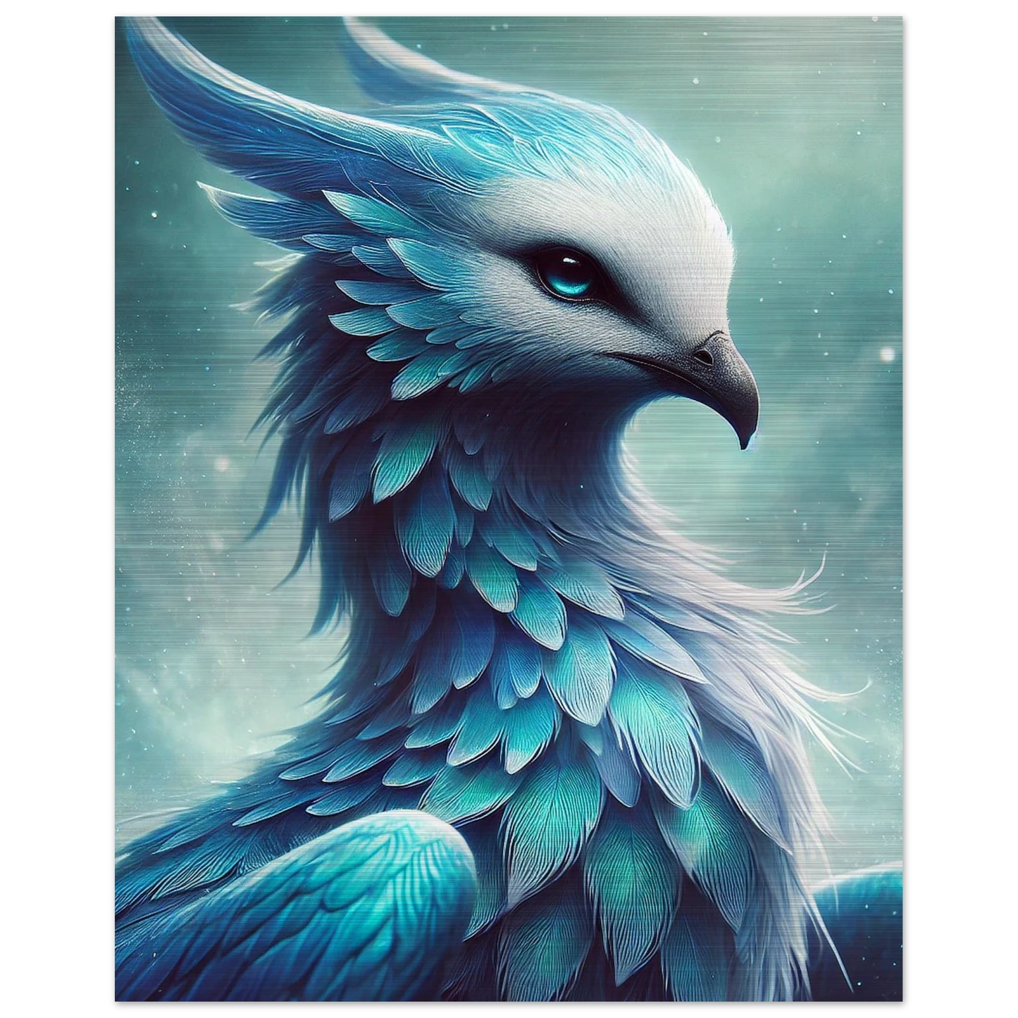 Erlebe Glacira, das Wesen aus gefrorenem Licht, in einer besonders ausdrucksstarken Form – als Druck auf gebürstetem AluDibond mit metallischem Schimmer. Die feine, horizontale Struktur des Aluminiums verleiht ihrem Erscheinungsbild Tiefe und Bewegung, während unbedruckte weiße Bereiche die eisige Silberoptik durchscheinen lassen – wie Kristalle im arktischen Licht.