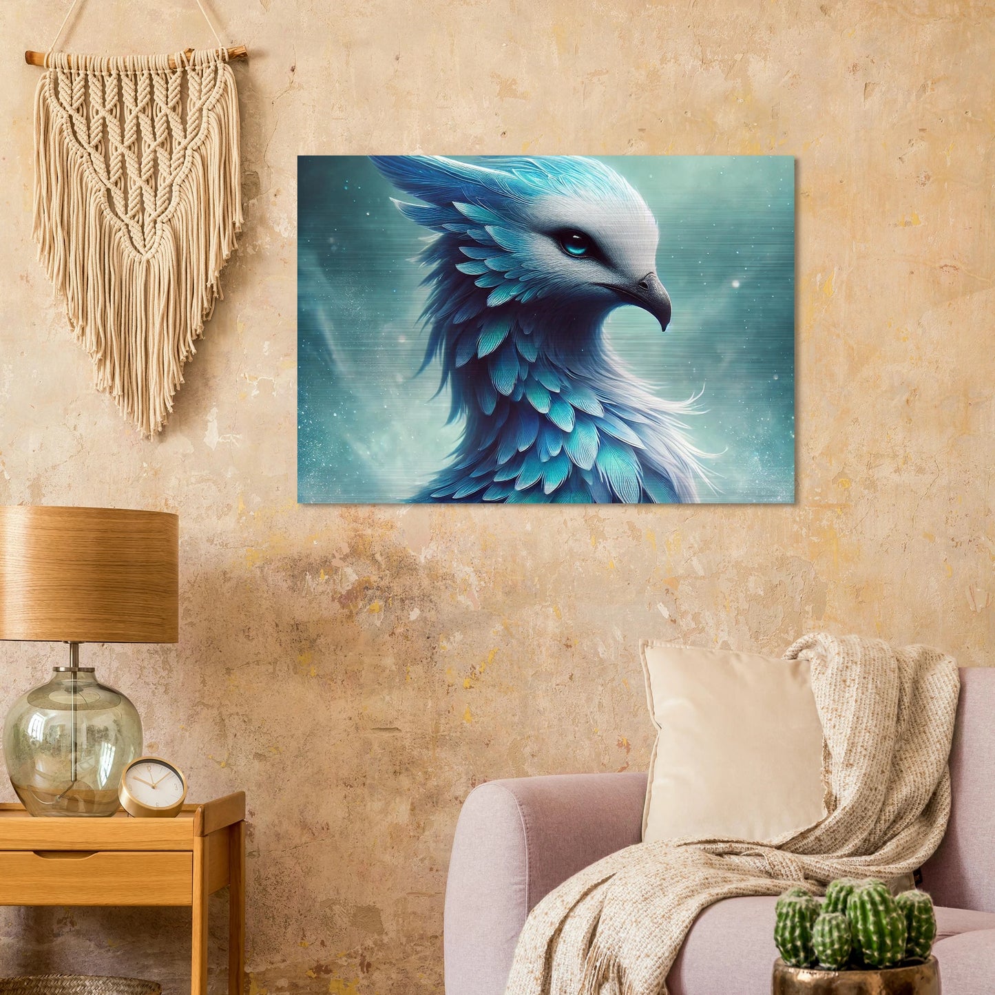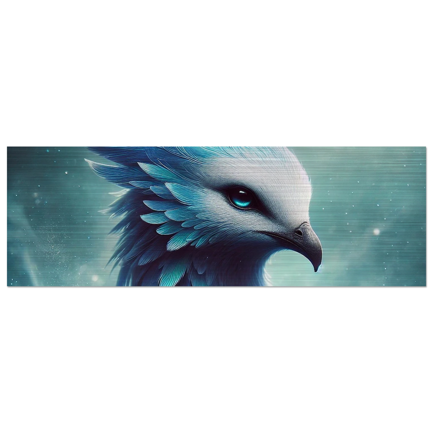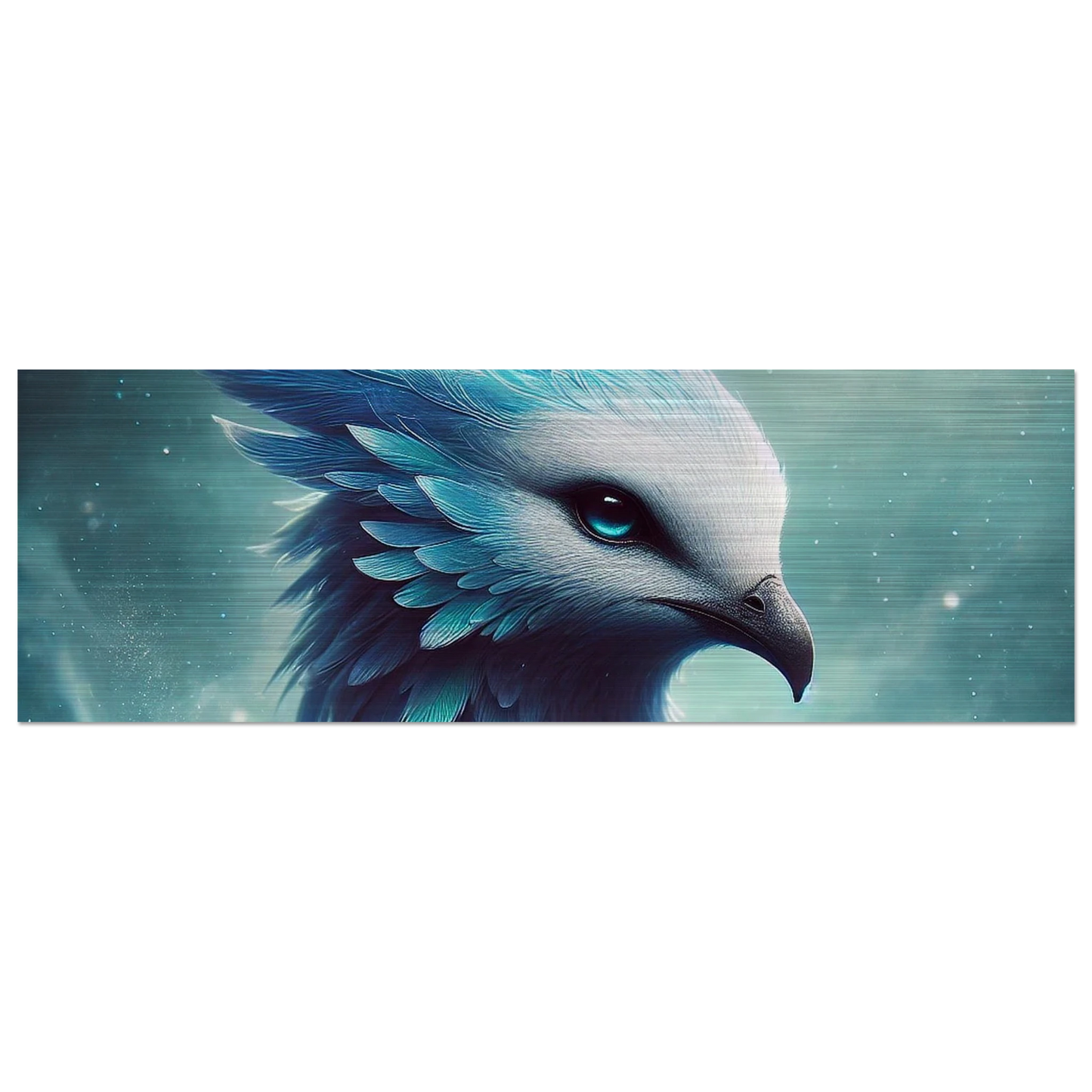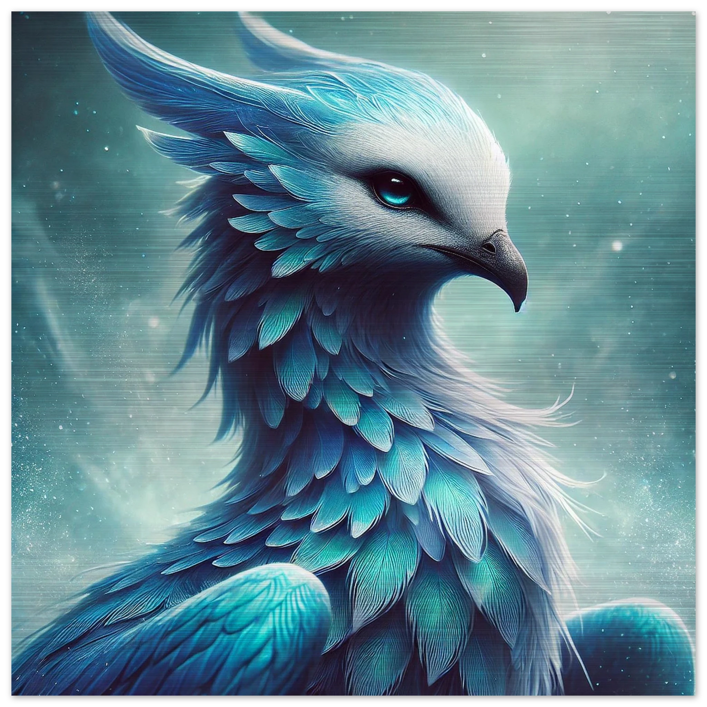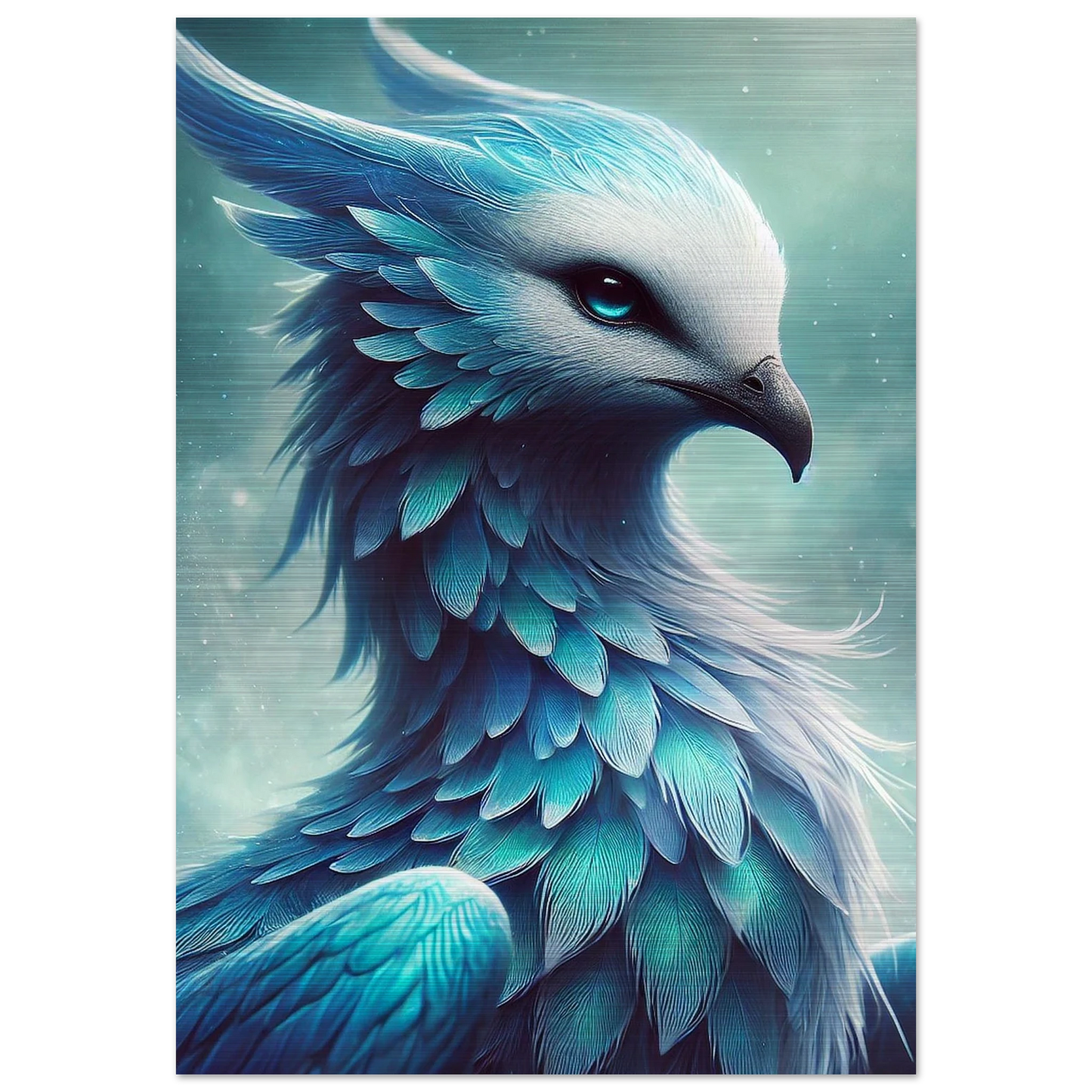 Erlebe Glacira, das Wesen aus gefrorenem Licht, in einer besonders ausdrucksstarken Form – als Druck auf gebürstetem AluDibond mit metallischem Schimmer. Die feine, horizontale Struktur des Aluminiums verleiht ihrem Erscheinungsbild Tiefe und Bewegung, während unbedruckte weiße Bereiche die eisige Silberoptik durchscheinen lassen – wie Kristalle im arktischen Licht.