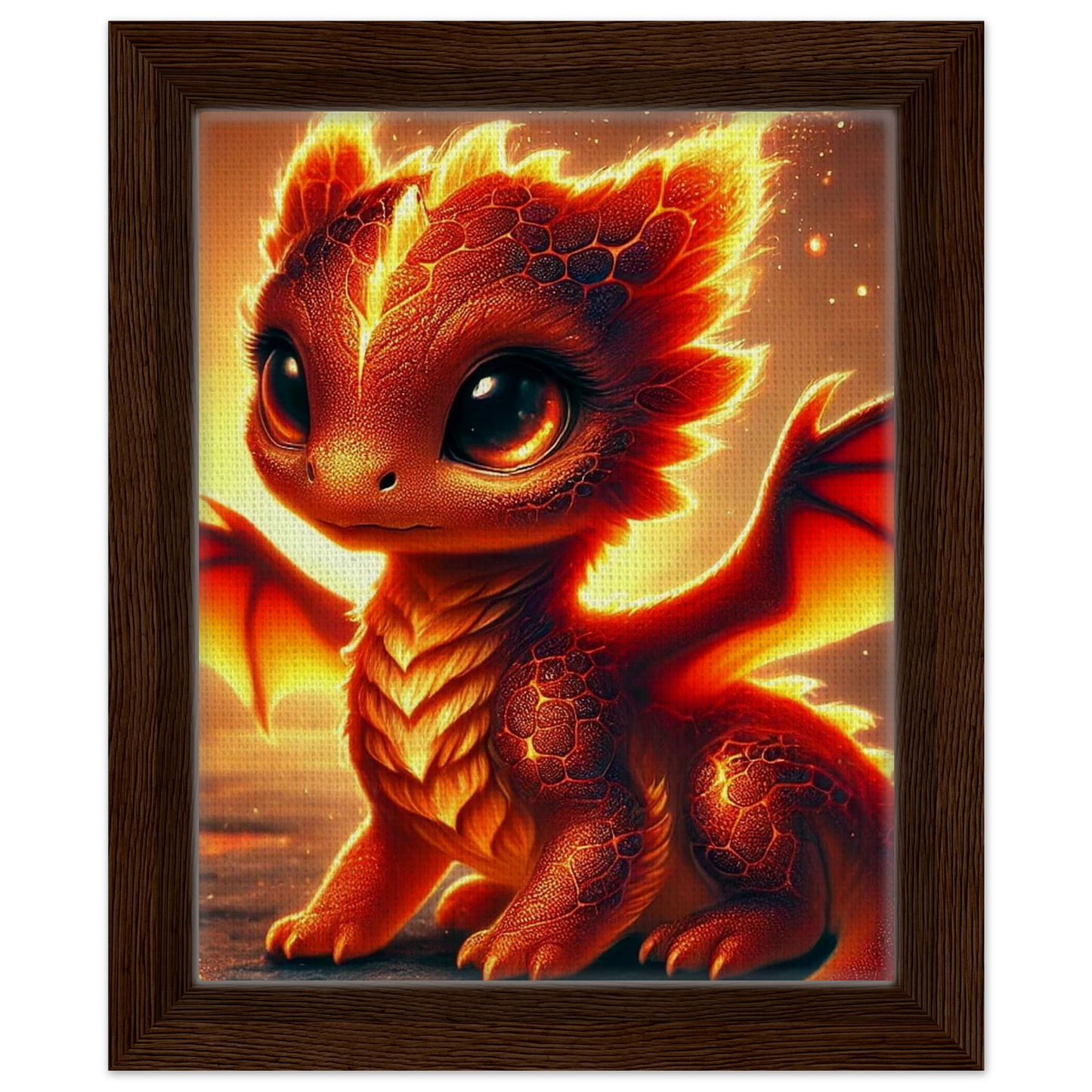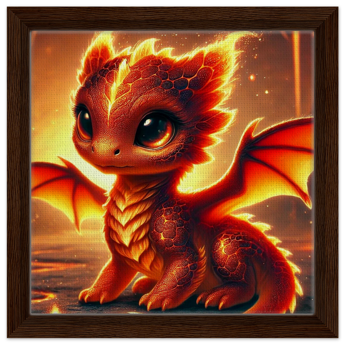 Verleihe deinem Zuhause eine besondere Wärme mit Ignaro, dem kleinen Flammenherz-Drachen – ein Symbol für Mut, Licht und Neubeginn. Eingebettet in einen edlen Rahmen entfaltet dieses Kunstwerk seine ganze Magie: Ignaros glühende Schuppen, sein leuchtendes Herz und die Energie seines vulkanischen Ursprungs erzählen eine Geschichte voller Leidenschaft und Lebensfreude.