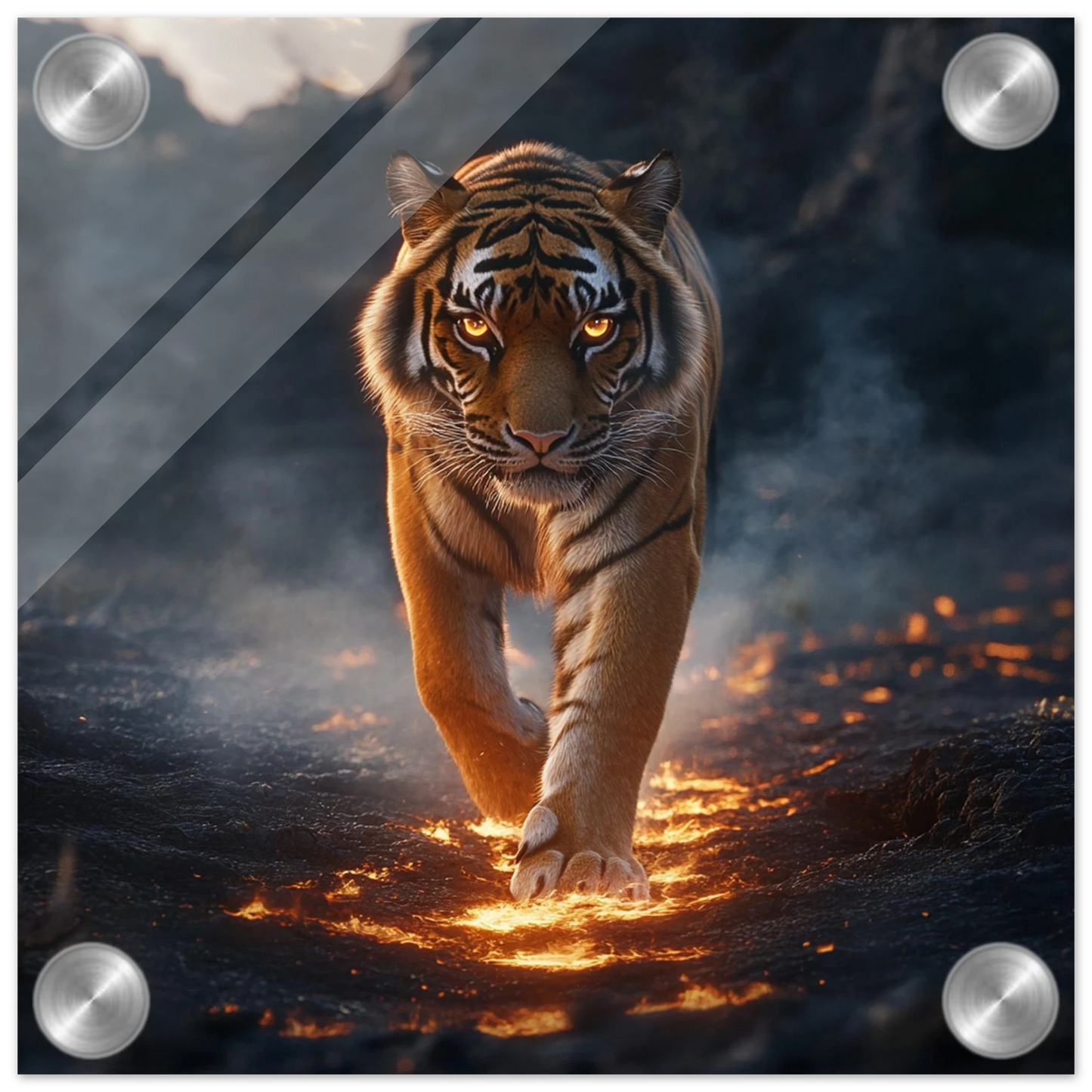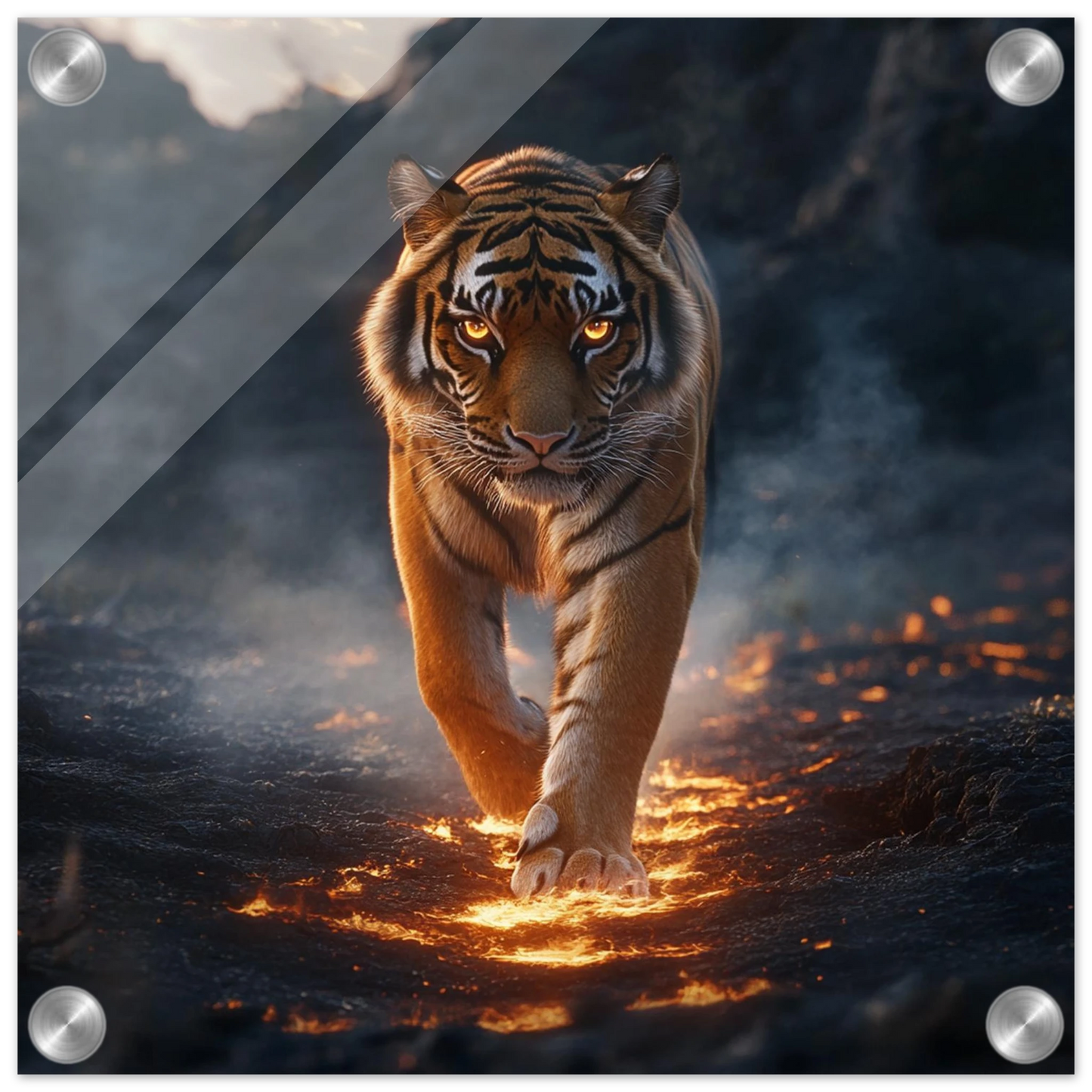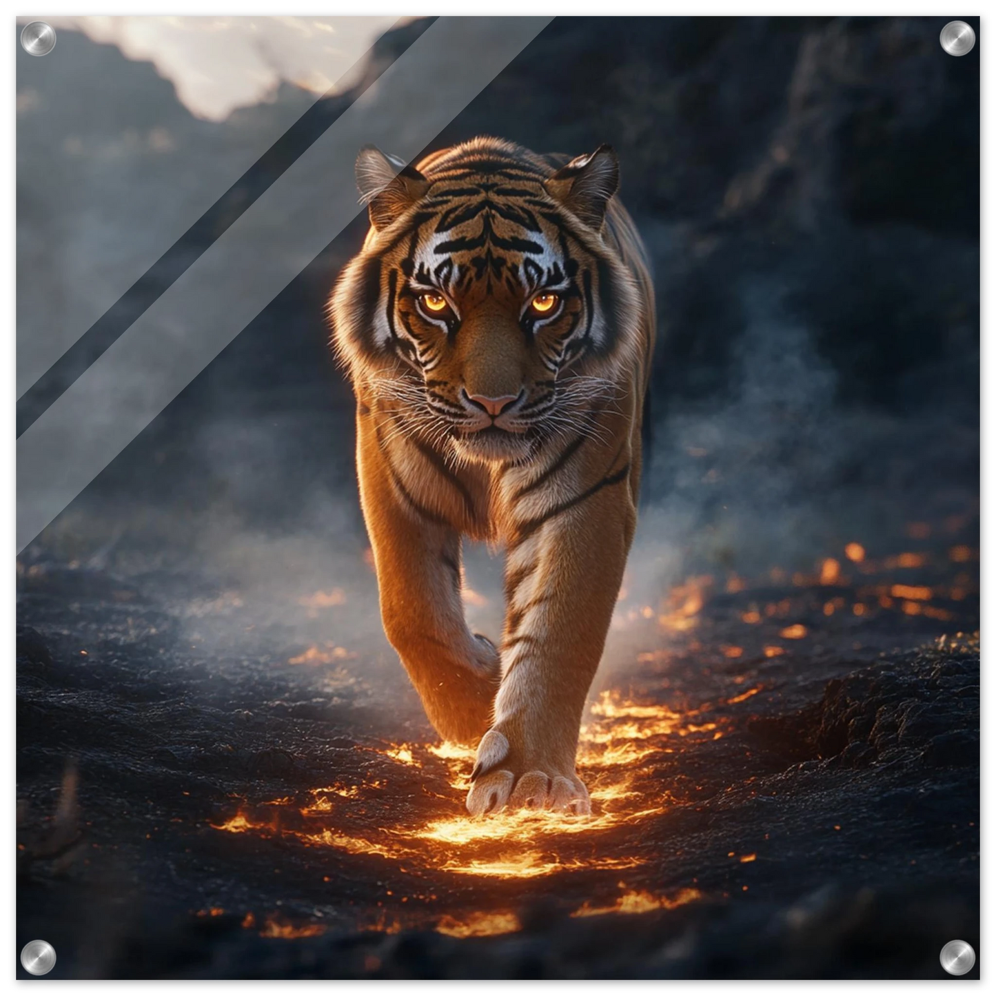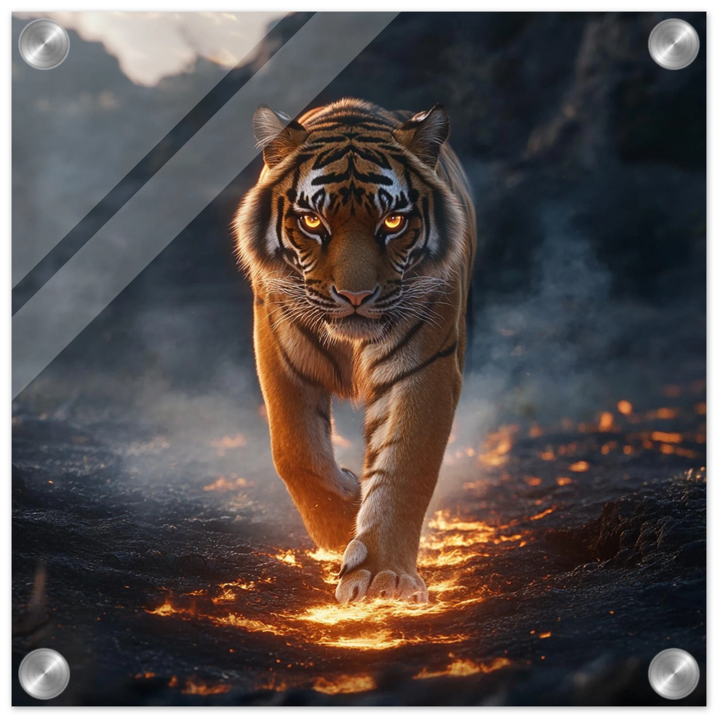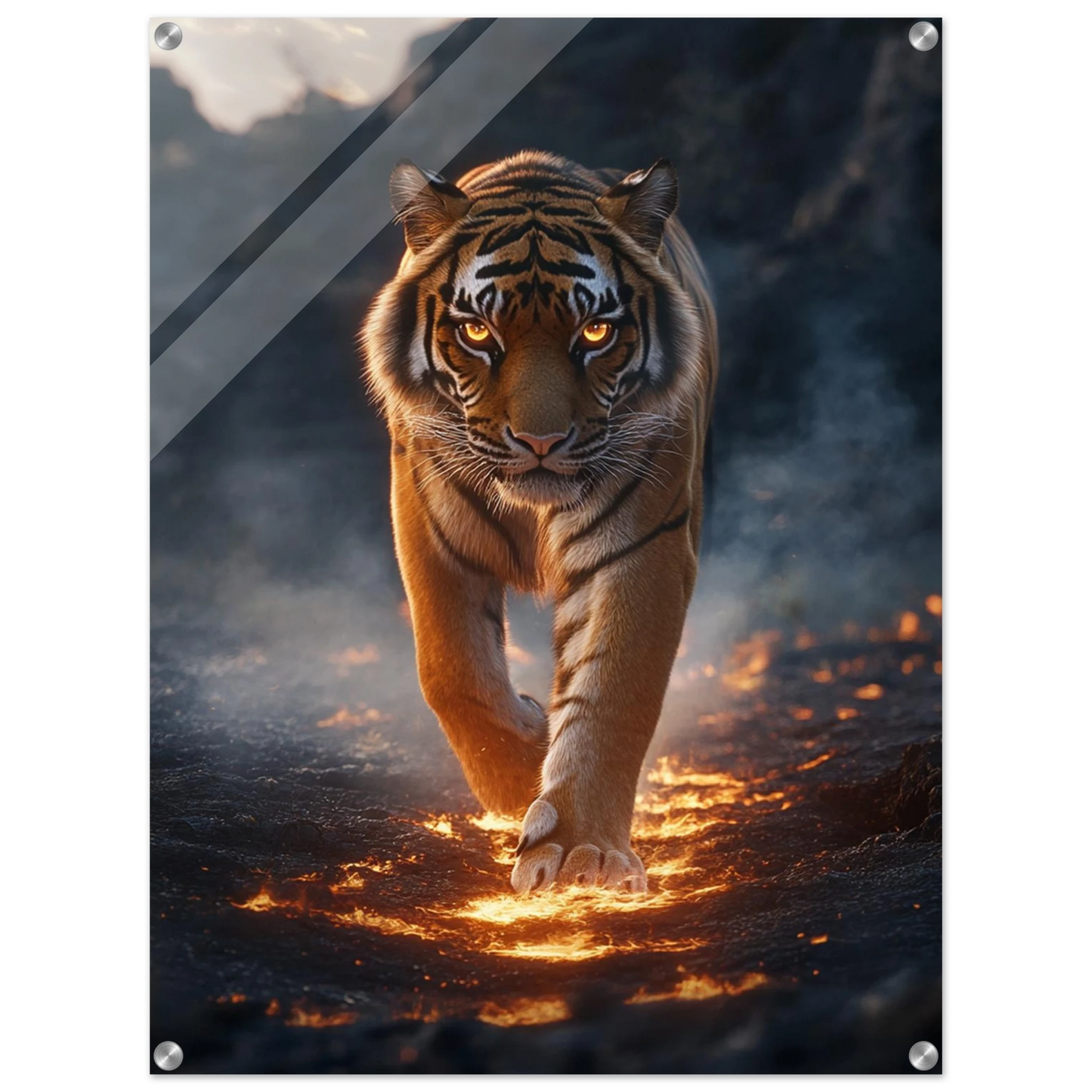 Ignarok ist nicht nur ein mythischer Tiger – er ist pure Glut in Bewegung. Geboren aus einem Lavastrom, durchstreift er die Aschelande als Wächter des Gleichgewichts zwischen Feuer und Leben. Seine leuchtenden Augen und flammenden Streifen symbolisieren Stärke, Mut und Transformation.