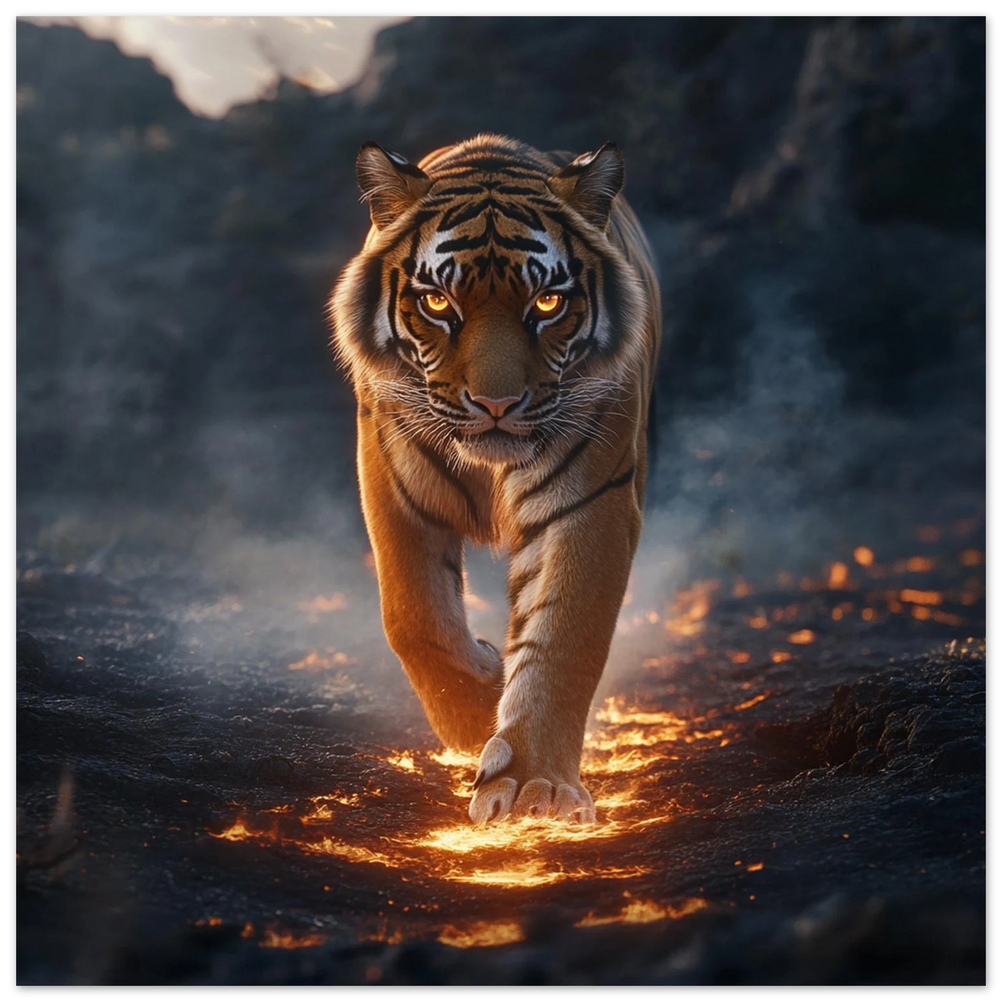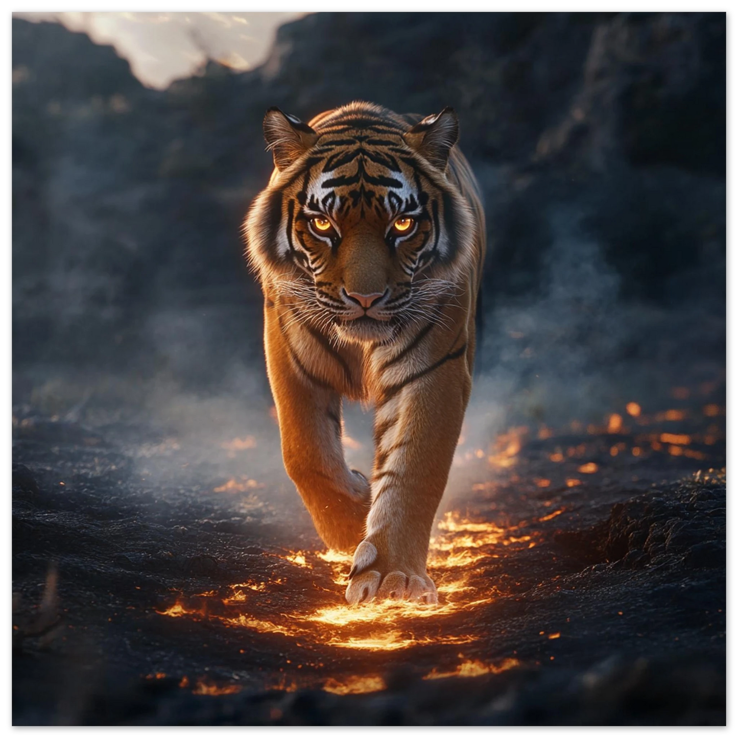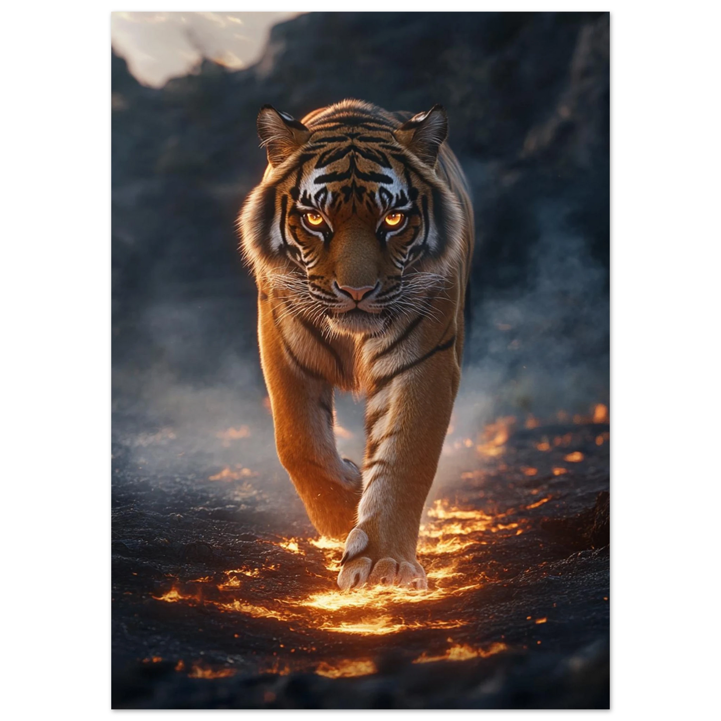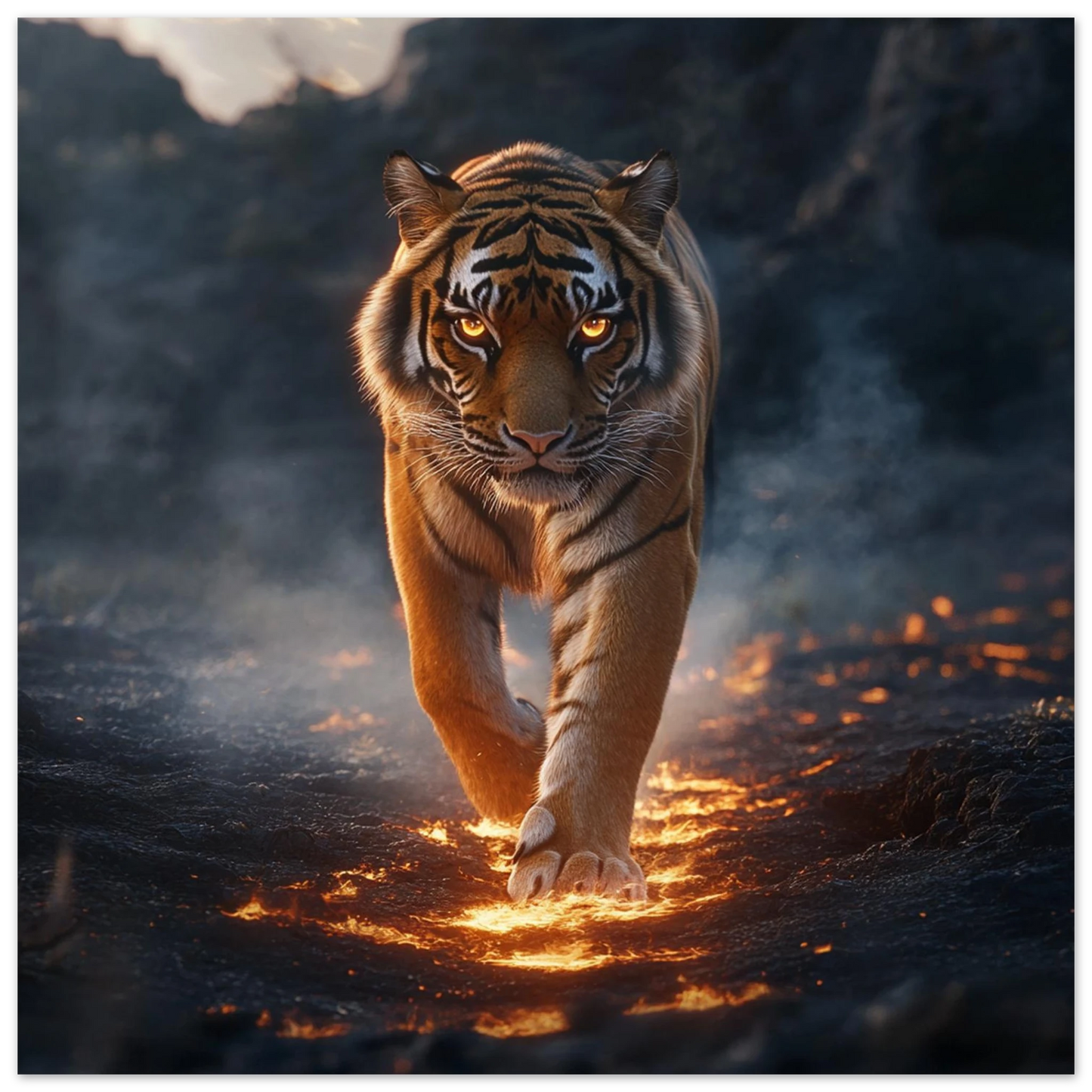 Ignarok – ein majestätisches Wesen, geboren aus dem Glutkern der Erde. In seinen flammenden Augen spiegelt sich uralte Kraft und stille Weisheit. Er wandert durch Ascheebenen als Hüter des Feuers, Sinnbild für Stärke, Transformation und neues Leben.